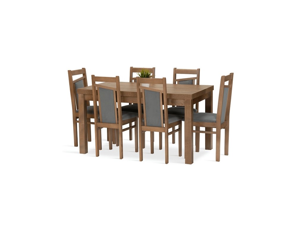 Jídelní sestava Magnum 6 se skládá z rozkládacího stolu a šesti židlí. Tato jídelní sestava splní svůj účel na výbornou nejen v kuchyni, ale i v jídelně, nebo obývacím pokoji s jídelním koutem. Svou vysokou kvalitou a precizním zpracováním, uspokojí všechny budoucí, i ty velmi náročné, uživatele. Nohy stolu a kostry židlí jsou vyrobeny z bukového dřeva, mořeného tak, aby ladily s deskou stolu, která je vyrobená z lamina v dekoru dub lefkas. Jídelní sestava je dodávaná v demontu. Součástí balení je schématický montážní návod, včetně všech potřebných spojovacích prvků. Cena je uvedena za jídelní stůl a 6 židlí. Úvodní fotografie je ilustrační. Židle budou dodány v zelené barvě.