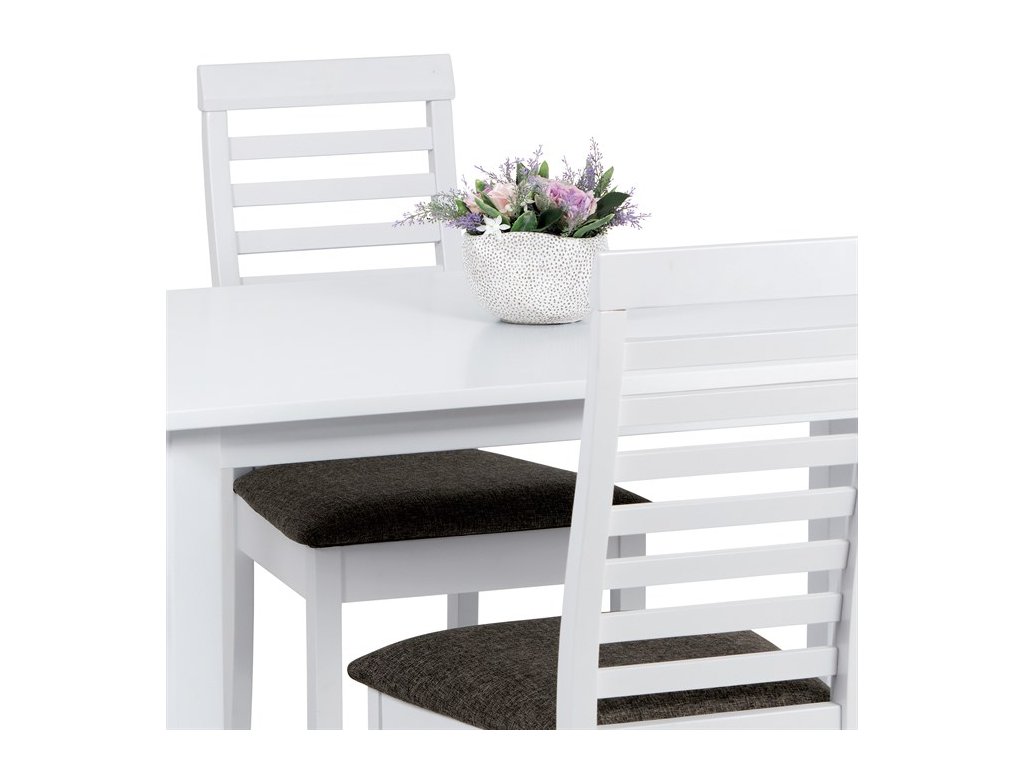 Jídelní set 1+4 v bílé matné úpravě je vyroben z masivního dřeva, které zajišťuje pevnost a stabilitu celého setu. Stůl o rozměrech 120x75x75 cm nabízí dostatek prostoru pro pohodlné stolování až pro čtyři osoby. Masivní nohy stolu i židlí přispívají k dlouhé životnosti a odolnosti proti běžnému opotřebení. Židle mají ergonomicky tvarovaná opěradla s vodorovnými příčkami a čalouněné sedáky v tmavém odstínu, které zvyšují komfort při sezení. Celkový design je jednoduchý a nadčasový, vhodný do různých typů interiérů, kde oceníte kvalitní materiály a precizní zpracování.