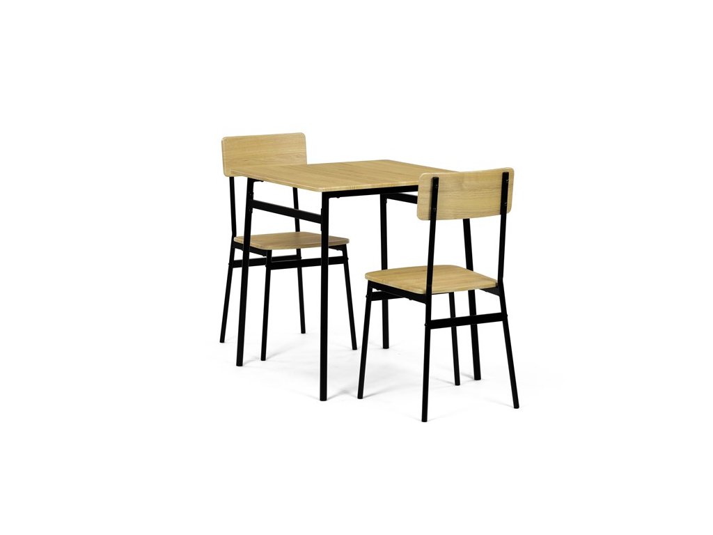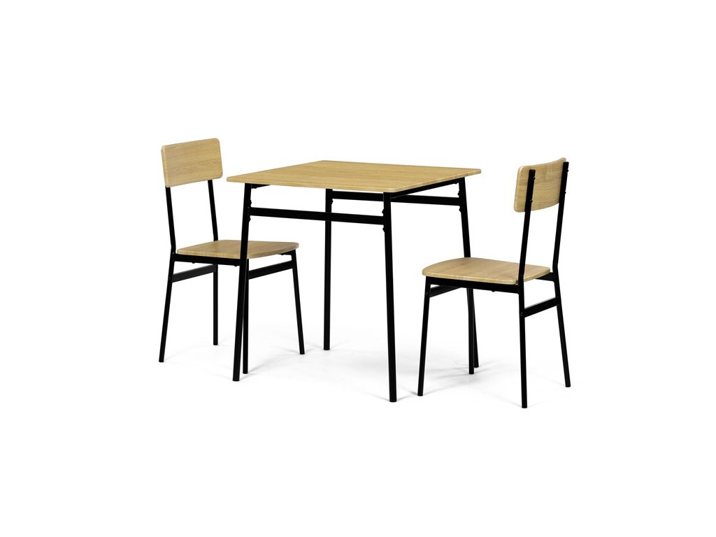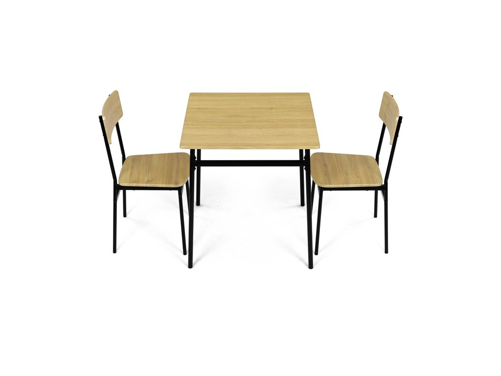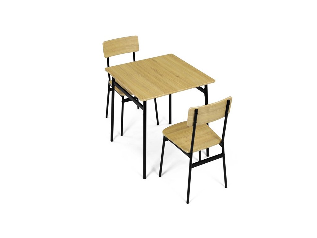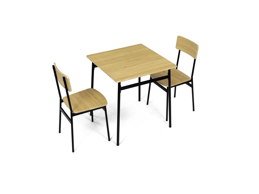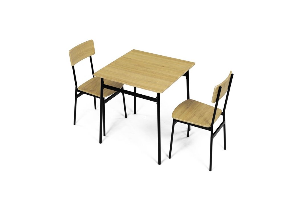 Tento jídelní set značky Autronic je ideální volbou pro menší prostory. Set obsahuje čtvercový stůl a dvě židle, které se svým industriálním designem dokonale hodí do moderních interiérů. Deska stolu i sedáky jsou vyrobeny z odolného MDF s dekorem divokého dubu. Černé kovové nohy dodávají sestavě stabilitu a moderní kontrast. Tento set je ideální pro dvě osoby a je vhodný zejména do menších jídelen nebo kuchyní. Montáž je snadná a rychlá, ideální řešení pro moderní bydlení.