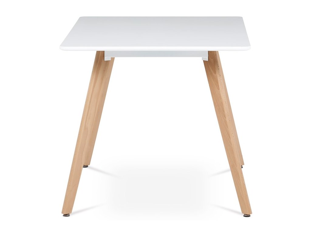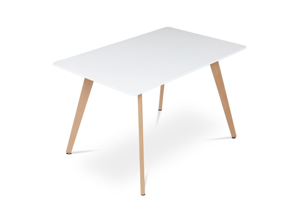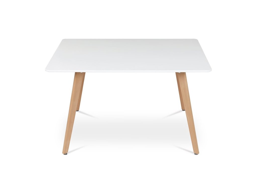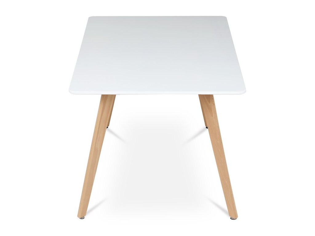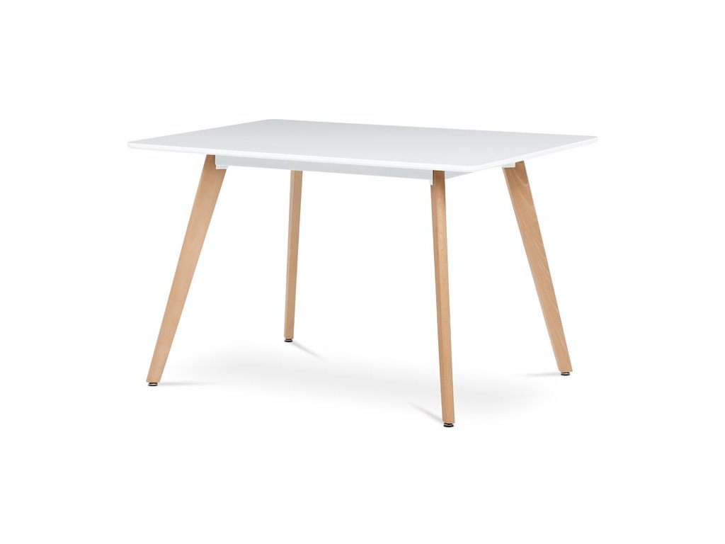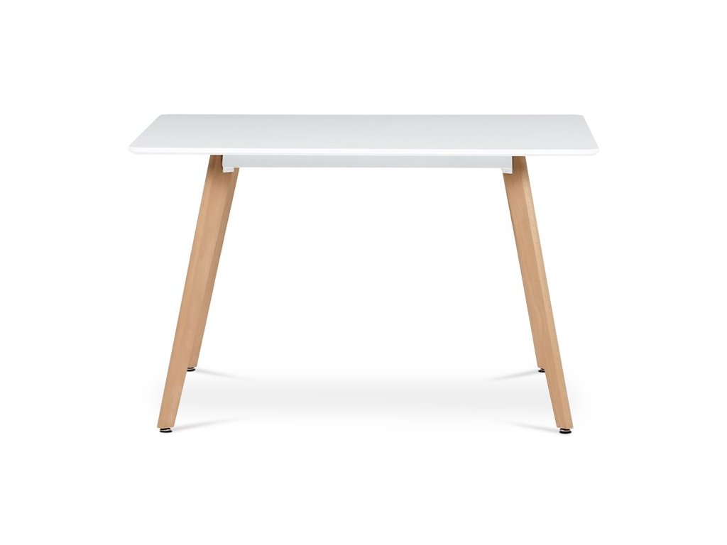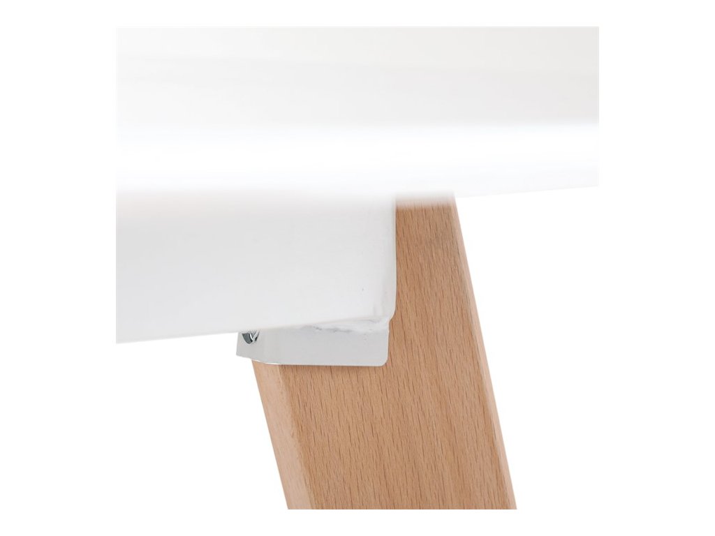 Jídelní stůl o rozměrech 120x80x74 cm kombinuje pevnou desku z MDF s matnou bílou povrchovou úpravou a nohy z masivního buku, které dodávají stabilitu a přírodní vzhled. Deska stolu je navržena s jemně zaoblenými rohy pro bezpečnost a pohodlí při používání. Masivní bukové nohy jsou vybaveny rektifikačními patkami, které umožňují vyrovnání nerovností podlahy a zajišťují stabilitu stolu. Matný lak na desce usnadňuje údržbu a odolává běžnému opotřebení. Stůl je pevný a vhodný pro každodenní použití v jídelnách i kuchyních.