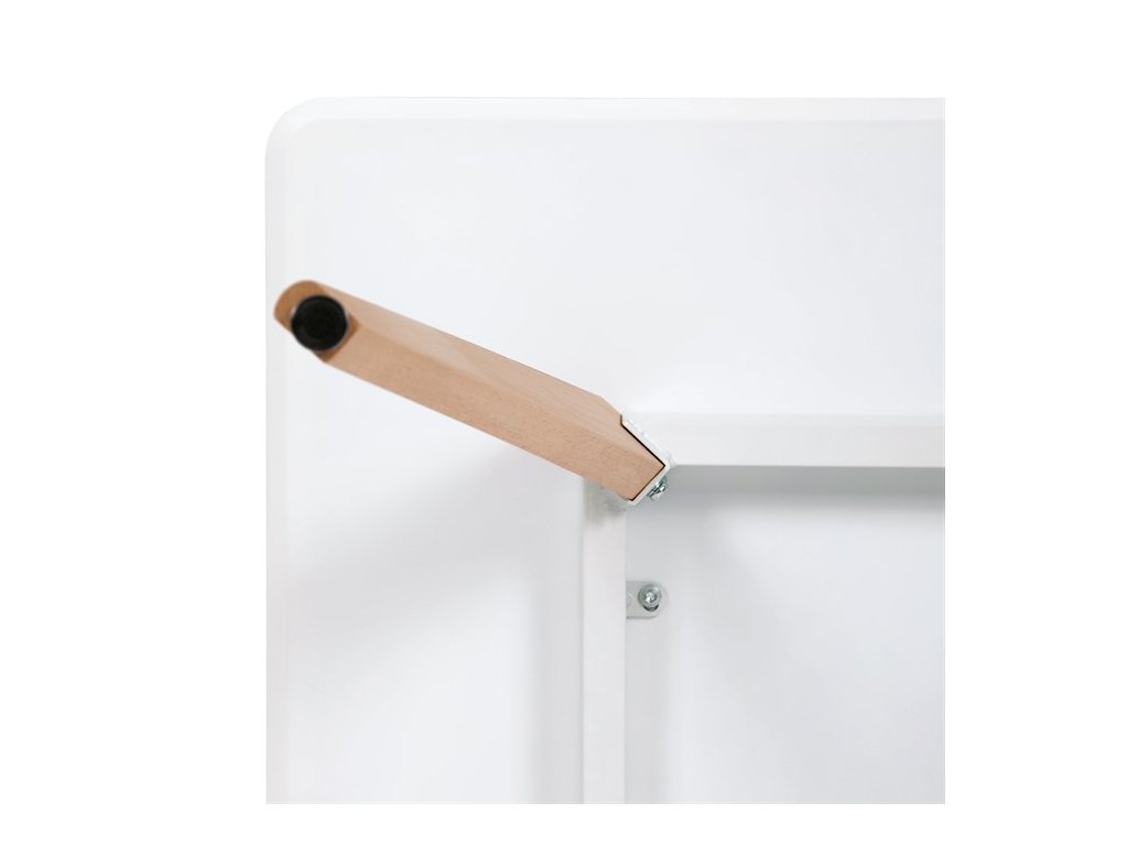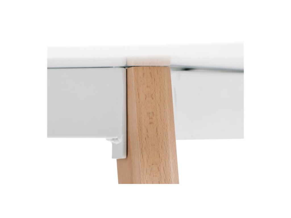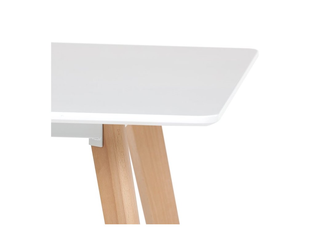 Jídelní stůl o rozměrech 80x80x74 cm kombinuje pevnou desku z MDF s matnou bílou povrchovou úpravou a stabilní nohy z masivního buku. Zaoblené rohy desky přispívají k bezpečnosti a zároveň dodávají moderní vzhled. Stůl je vybaven rektifikačními nohami, které umožňují vyrovnání nerovností podlahy a zajišťují stabilitu během používání. Matný lak na desce usnadňuje údržbu a odolává běžnému opotřebení. Díky kvalitnímu zpracování a použitým materiálům je vhodný pro každodenní použití v jídelnách i kuchyních.