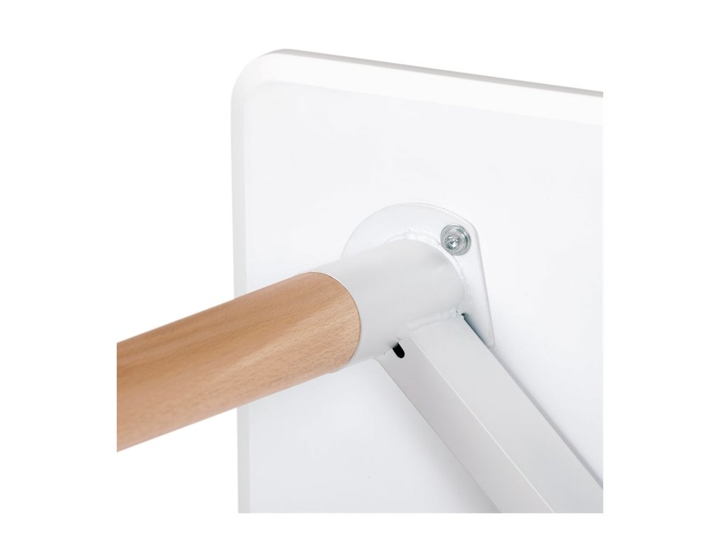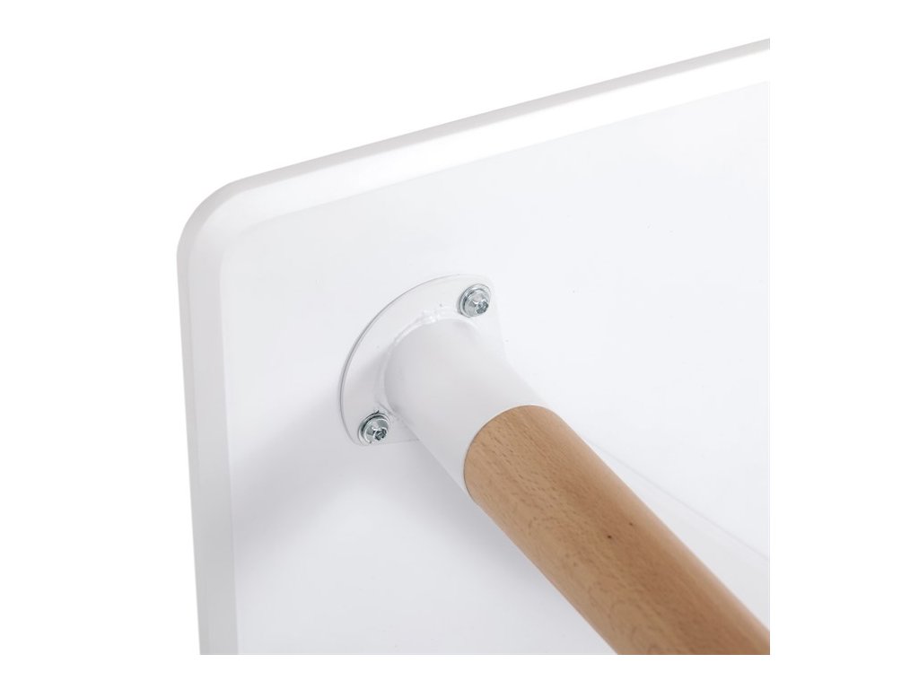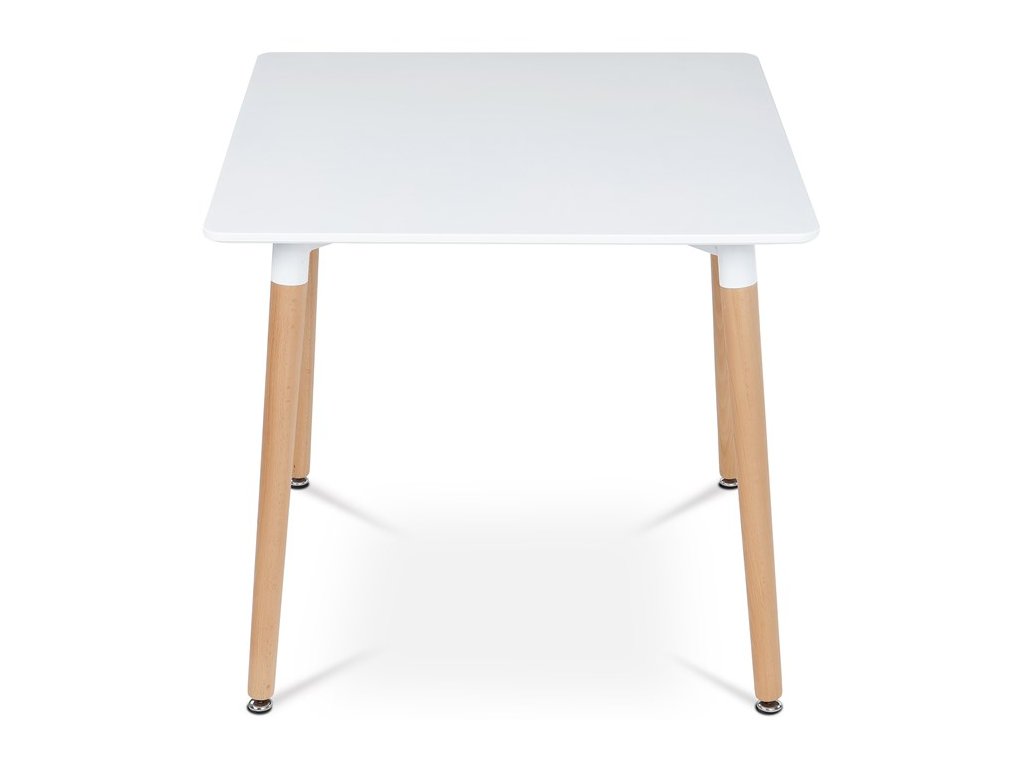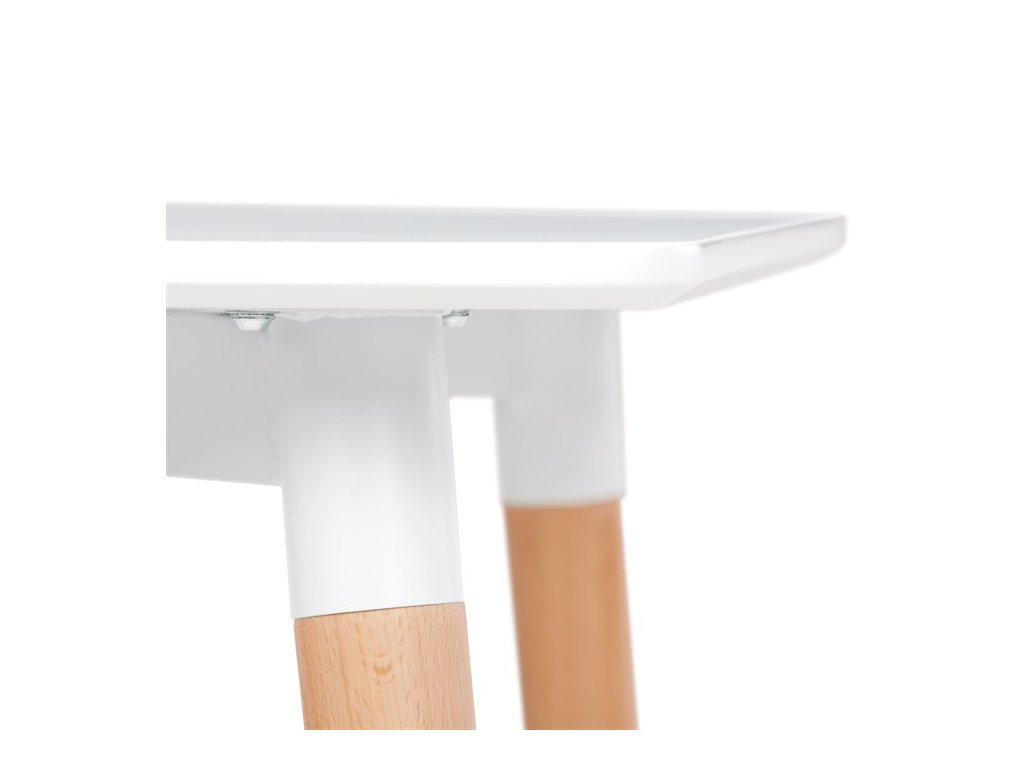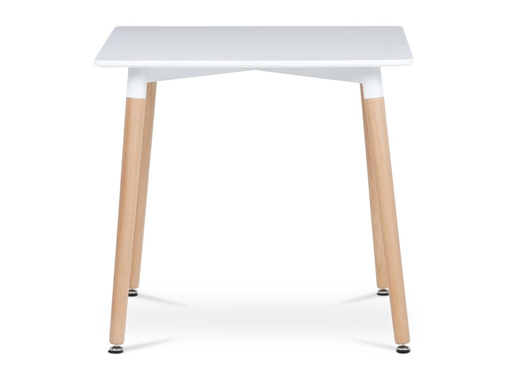 Jídelní stůl o rozměrech 80x80x74 cm zaujme kombinací bílého matného MDF povrchu desky a nohou z masivního dřeva, které dodávají stabilitu a přírodní vzhled. Deska stolu je opatřena matnou povrchovou úpravou, která usnadňuje údržbu a minimalizuje odlesky. Zaoblené rohy přispívají k bezpečnosti a zároveň podtrhují moderní design. Rektifikační nohy umožňují vyrovnání stolu na nerovném povrchu, což zajišťuje pevné a stabilní postavení. Celková konstrukce spojuje pevnost kovových spojů s estetickou hodnotou dřevěných prvků.