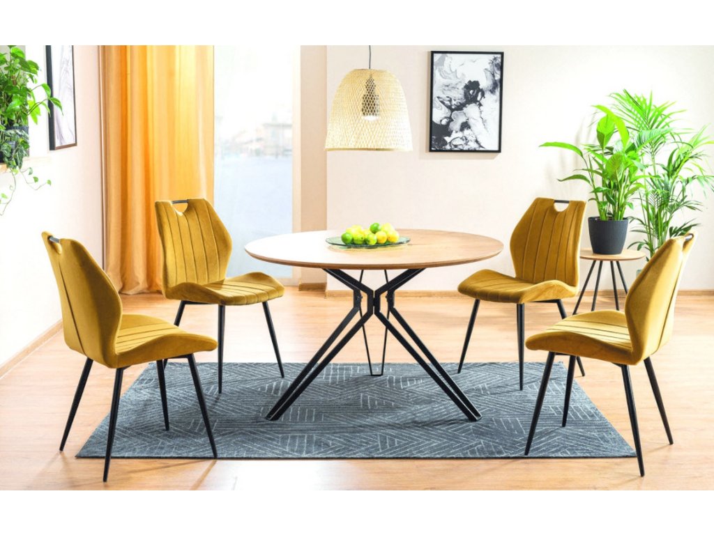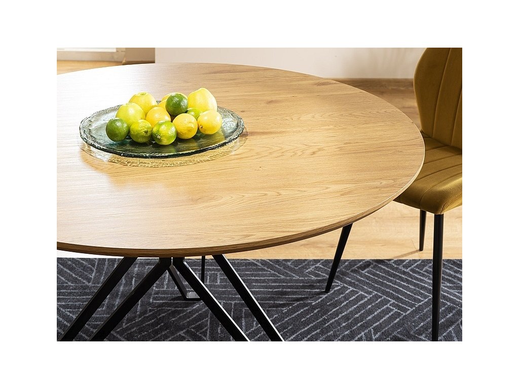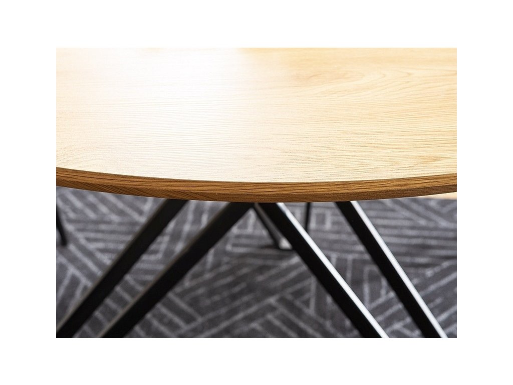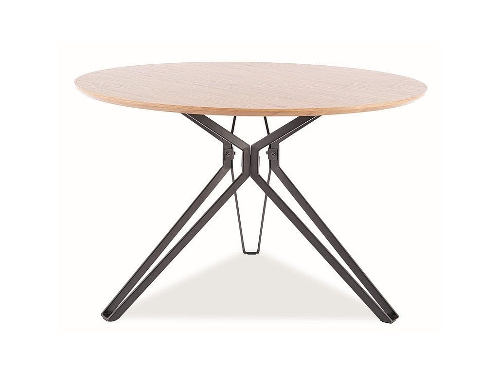Jídelní stůl který zaujme svým tvarem a bude ozdobou každého interiéru. Deska stolu je vyrobena z kvalitní MDF a přírodní dýhy v barvě dub, nohy stolu jsou z kovu v černé barvě. K tomuto stolu doporučujeme židle v naší nabídce. Dodáváme v demontovaném stavu.Doplňkové parametry