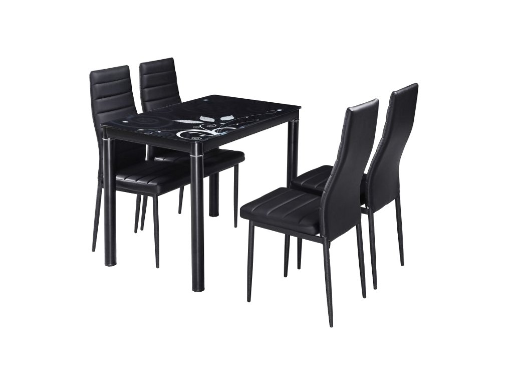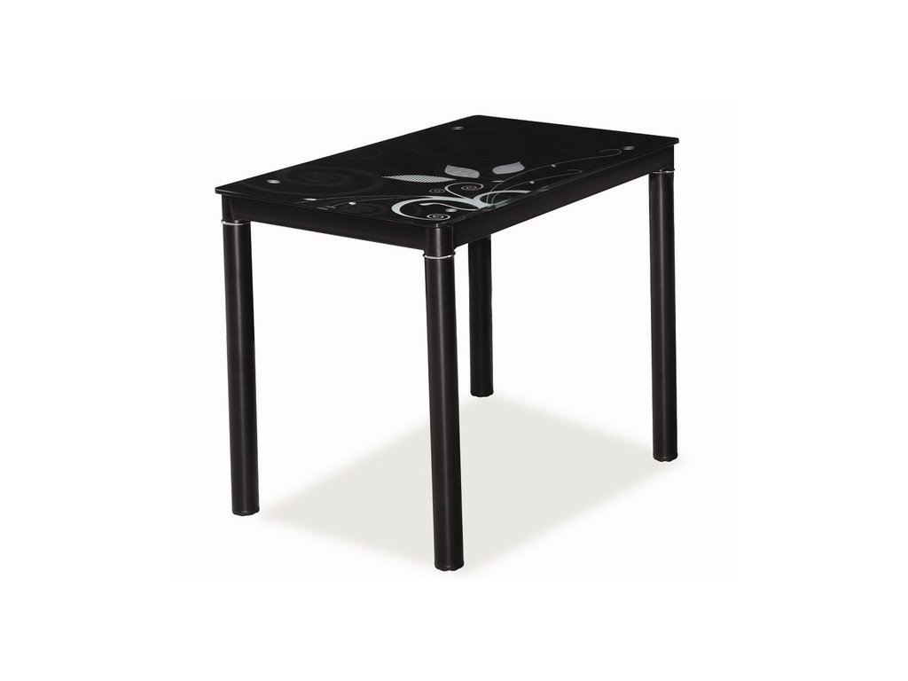 Moderní jídelní stůl v elegantním a praktickém provedení. Nohy stolu jsou vyrobeny z kovu, lakované černou barvou, deska je z tvrzeného skla v černé barvě. Na desce stolu jsou jemné, velmi elegantní moderní kresby v bílých odstínech. Stůl je určený pro 4 osoby. K tomuto stolu doporučujeme židle z naší nabídky.Doplňkové parametry