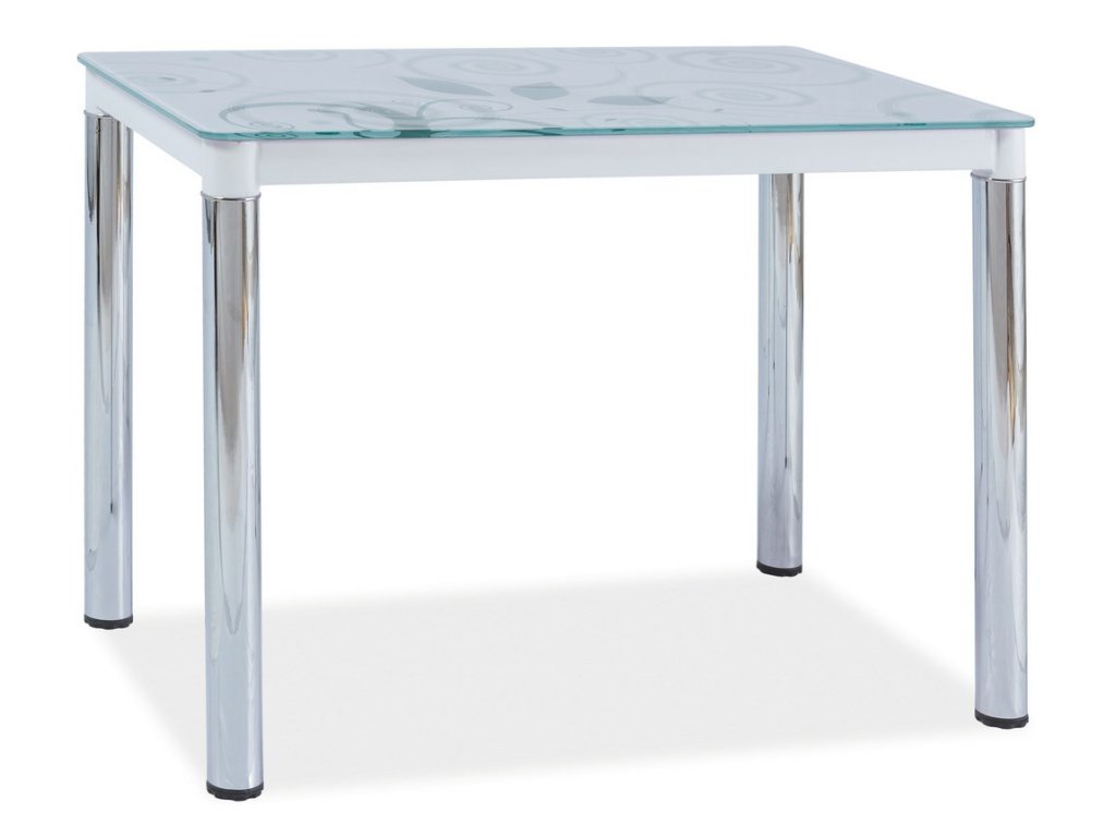 Moderní jídelní stůl v elegantním a praktickém provedení. Nohy stolu jsou vyrobeny z pochromovaného kovu, deska je z tvrzeného skla v bílé barvě. Na desce stolu jsou jemné, velmi elegantní moderní kresby. Stůl je určený pro 4 osoby. K tomuto stolu doporučujeme židle z naší nabídky.Doplňkové parametry