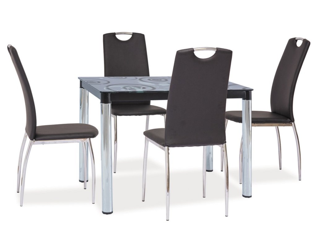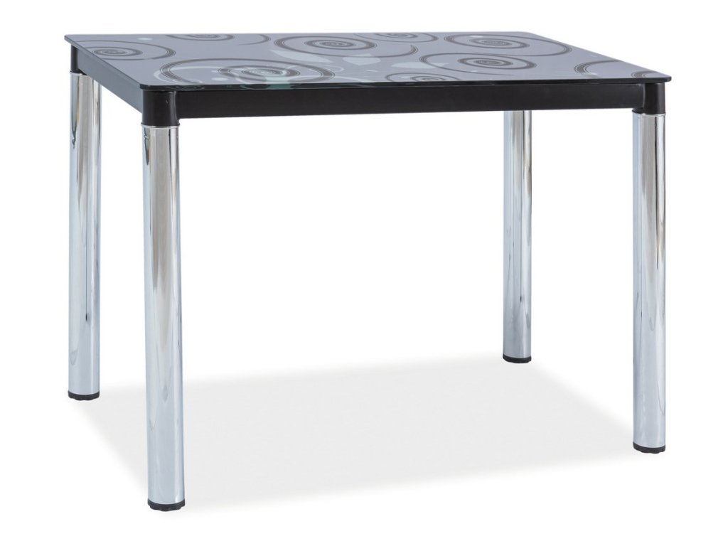 Moderní jídelní stůl v elegantním a praktickém provedení. Nohy stolu jsou vyrobeny z pochromovaného kovu, deska je z tvrzeného skla v černé barvě. Na desce stolu jsou jemné, velmi elegantní moderní kresby. Stůl je určený pro 4 osoby. K tomuto stolu doporučujeme židle z naší nabídky.Doplňkové parametry