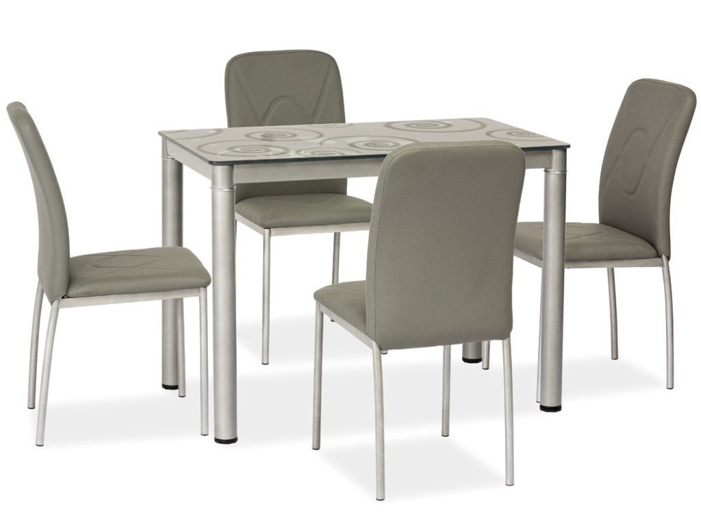 Moderní jídelní stůl v elegantním a praktickém provedení. Nohy stolu jsou vyrobeny z kovu, lakované šedou barvou, deska je z tvrzeného skla rovněž v šedé barvě. Na desce stolu jsou jemné, velmi elegantní moderní kresby. Stůl je určený pro 4 osoby. K tomuto stolu doporučujeme židle z naší nabídky.Doplňkové parametry