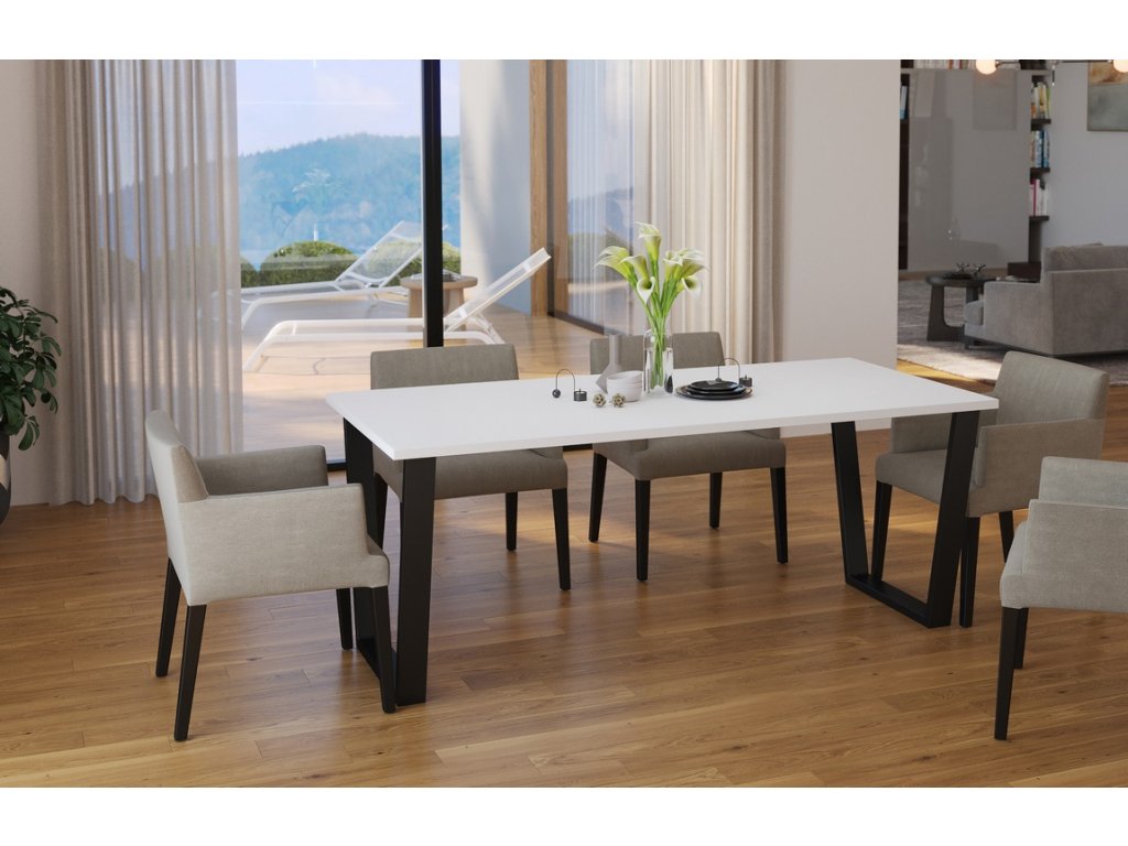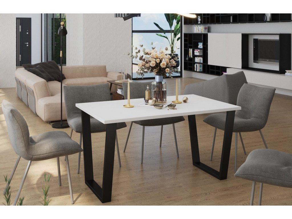 Jídelní stůl je vyroben v jednoduchém industriálním, stylovém a zároveň i moderním designu. Stolová deska je vyrobena z lamina tl.28 mm v barvě bílá, kovové nohy jsou práškově lakované v černé barvě (profil nohy 80x40 mm). Tyto jídelní stoly nabízíme v různých rozměrech a barvách. Dodáváme v demontovaném stavu.Doplňkové parametry