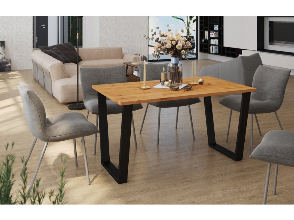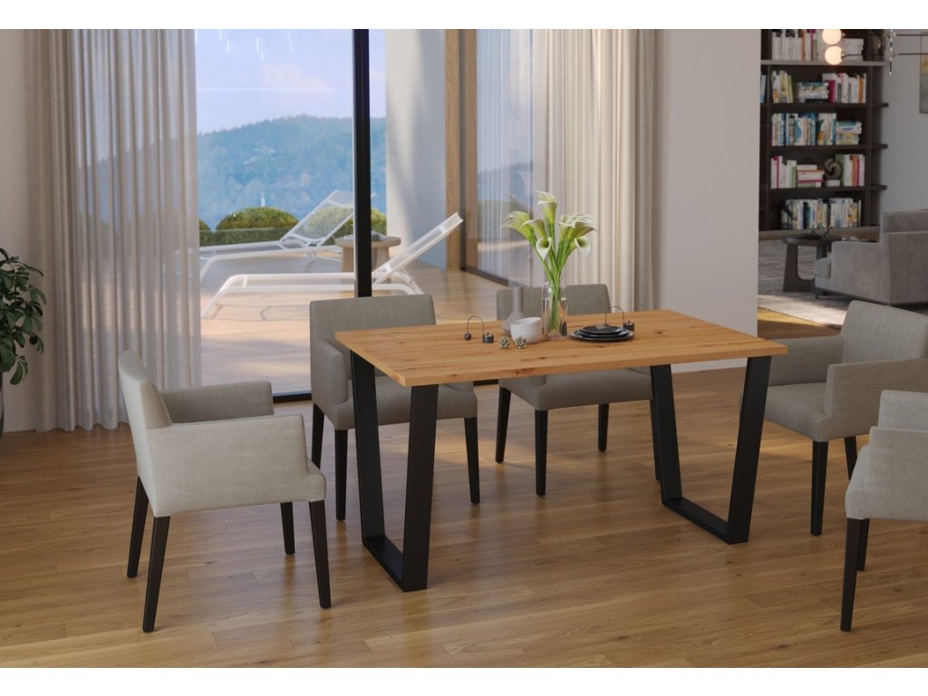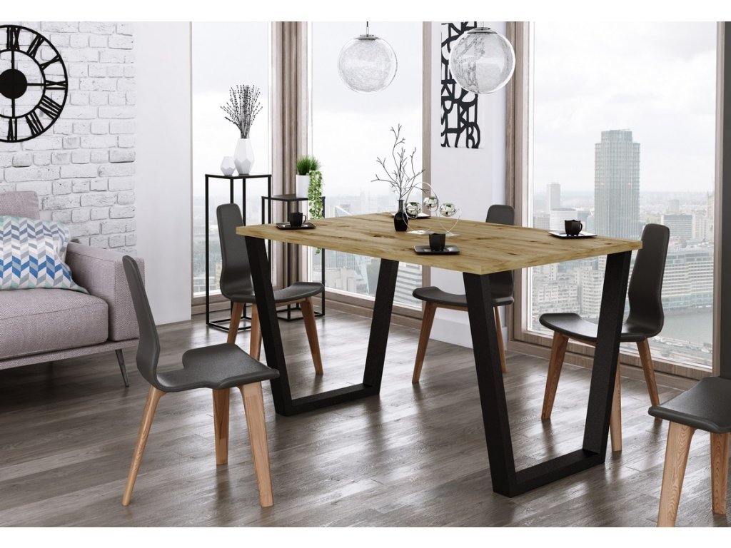 Jídelní stůl je vyroben v jednoduchém industriálním, stylovém a zároveň i moderním designu. Stolová deska je vyrobena z lamina tl.28 mm v barvě dub artisan, kovové nohy jsou práškově lakované v černé barvě (profil nohy 80x40 mm). Tyto jídelní stoly nabízíme v různých rozměrech a barvách. Dodáváme v demontovaném stavu.Doplňkové parametry