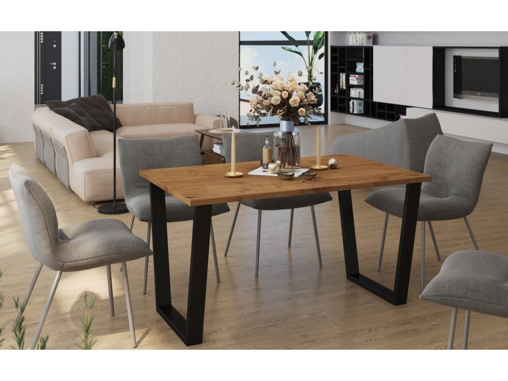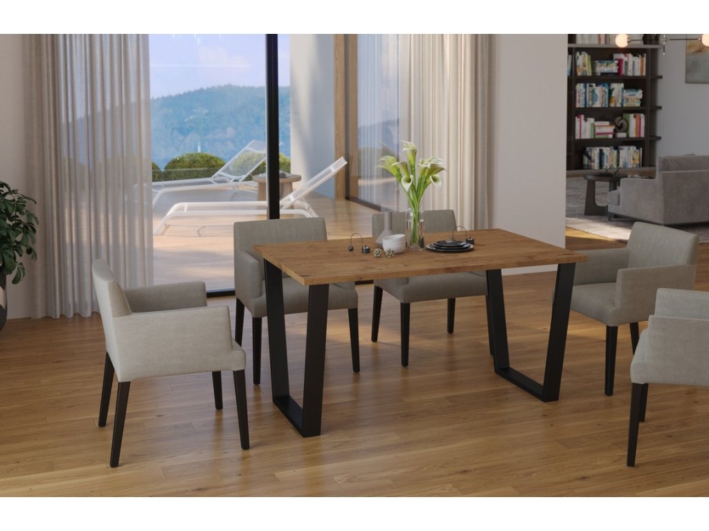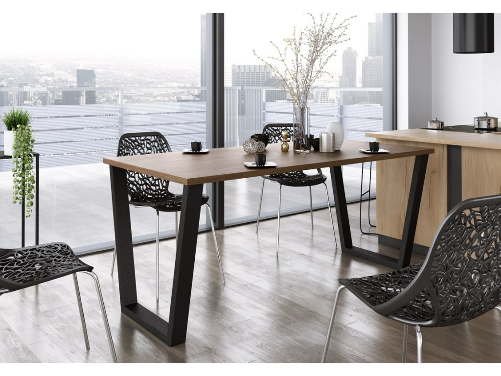 Jídelní stůl je vyroben v jednoduchém industriálním, stylovém a zároveň i moderním designu. Stolová deska je vyrobena z lamina tl.28 mm v barvě dub lancelot, kovové nohy jsou práškově lakované v černé barvě (profil nohy 80x40 mm). Tyto jídelní stoly nabízíme v různých rozměrech a barvách. Dodáváme v demontovaném stavu.Doplňkové parametry