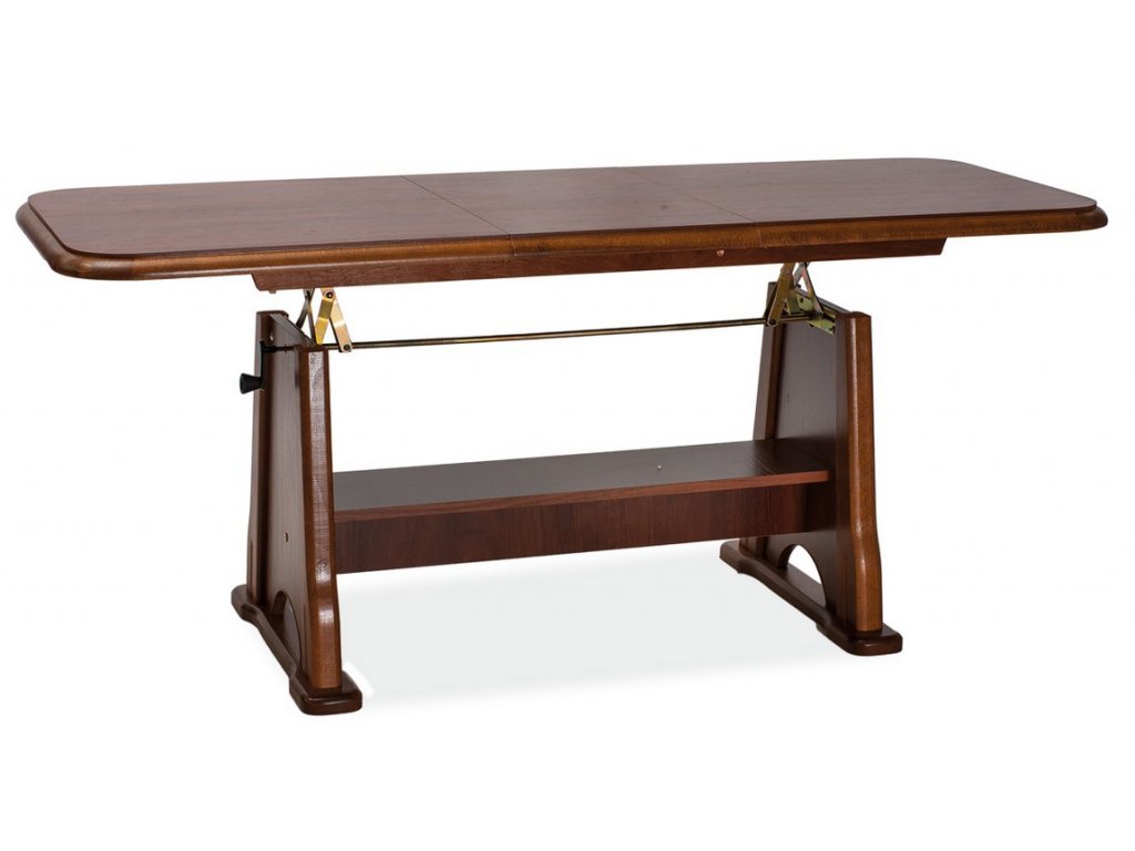 Elegantní konferenční stůl s funkcí jídelního stolu v klasickém duchu. Zajímavý vzhled stolu vyzdvihují jemné tvary a dokonalé detaily. Výhodou tohoto stolu je nastavitelná výška, kdy po zvýšení a rozkladu desky je možno použít stůl ke stolování. Nohy jsou vyrobeny z kvalitního přírodního dřeva, deska z LTD v barevném provedení - kaštan ( barva viz vzorník ). Plocha před rozložením je 67 x 130 cm, po rozložení 67 x 170 cm. Stůl je určený až pro 6 osob. K tomuto stolu doporučujeme židle v naší nabídce.Doplňkové parametry