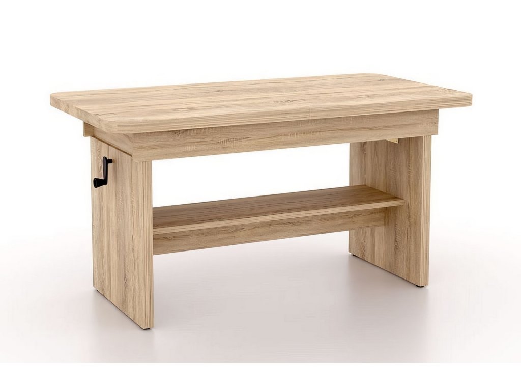 Elegantní konferenční stůl s funkcí jídelního stolu v moderním pojetí. Výhodou tohoto stolu je nastavitelná výška, kdy po zvýšení a rozkladu desky je možno ho použít ke stolování. Masivní deska je z LTD 32 mm opatřena ABS páskou 2 mm, otevírací mechanismus je vysoké kvality. Barevné provedení - dub sonoma. Plocha před rozložením je 116 x 62 cm, po rozložení 156 x 62 cm. Výška se z 59 cm zvýší na 70 cm. Dodáváme v demontovaném stavu.Doplňkové parametry