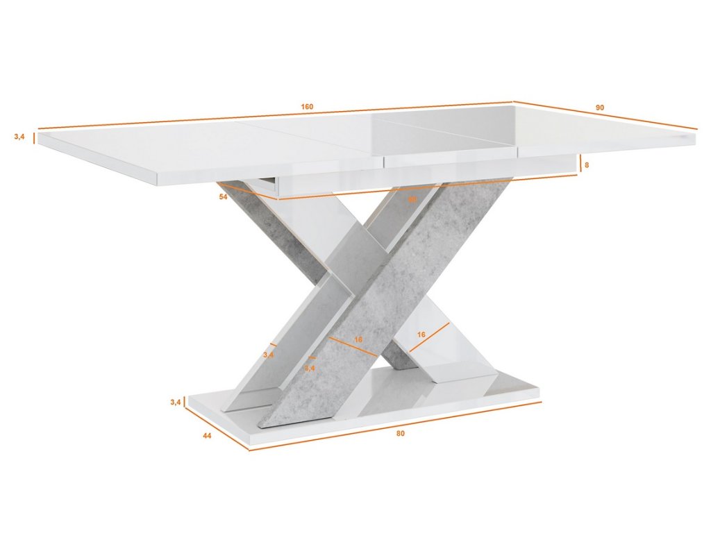 šířka: 160-300 cm | výška: 76 cm | hloubka: 90 cm Jídelní stůl rozkládací. Deska jídelního stolu je vyrobena z LTD v barvě bílá lesk, plné nohy stolu jsou z materiálu MDF (nohy...