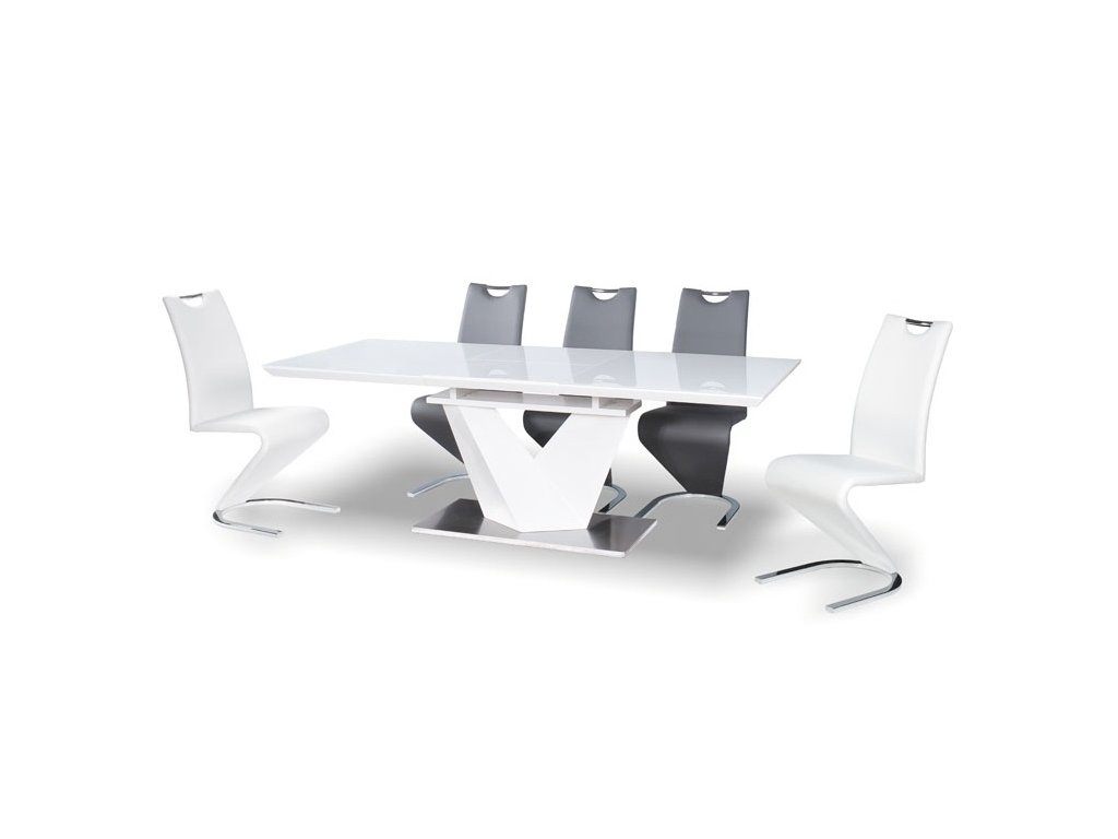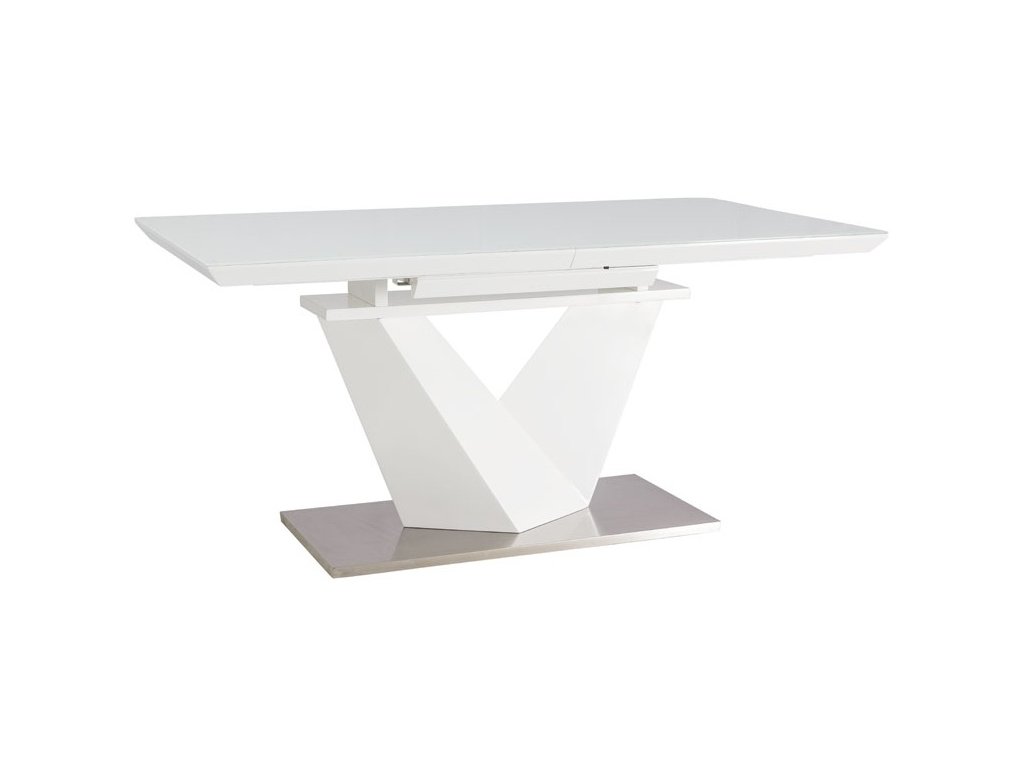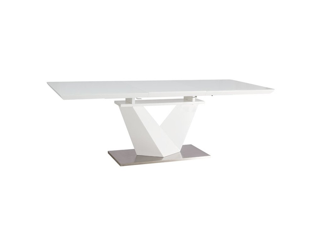 Moderní jídelní rozkládací stůl vyrobený z kvalitní MDF v bílé barvě. Podstavec je z leštěné oceli, deska stolu je bílá v kombinaci s vroubkovaným tvrzeným bílým sklem. Plocha stolu před rozložením je 90 x 160 cm, po rozložení 90 x 220 cm. Stůl je určený až pro 8 osob. K tomuto stolu doporučujeme židle v naší nabídce.Doplňkové parametry