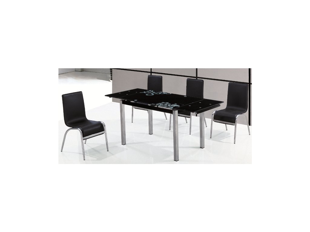 Moderní rozkládací jídelní stůl, kovová konstrukce je pochromovaná, vrchní rozkládací deska je z černého tvrzeného skla, tloušťka skla je 1 cm. Rozkládací části ( každá 30 cm ) se nacházejí na dvou protilehlých stranách, plocha má před rozložením 110 x 74 cm, po rozložení 170 x 74 cm. Stůl je vhodný pro 4-6 osob. K tomuto stolu doporučujeme židle v naší uvedené nabídce. Dodáváme v demontovaném stavu.Doplňkové parametry
