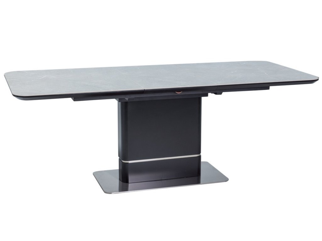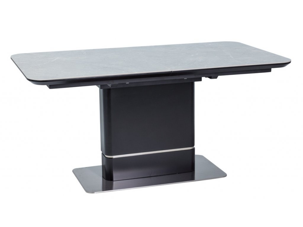Elegantní rozkládací jídelní stůl v luxusním provedení. Stůl je vyroben z kvalitní MDF lakované matnou černou barvou odolnou proti oděru v kombinaci s italskou keramikou v imitaci šedého mramoru. Podstavec je v kombinaci s leštěnou ocelí. Stůl je určen až pro 8 osob. K tomuto stolu doporučujeme židle z naší nabídky. Plocha stolu před rozložením je 90 x 160 cm, plocha stolu po rozložení je 90 x 210 cm. Dodáváme v demontovaném stavu.Doplňkové parametry
