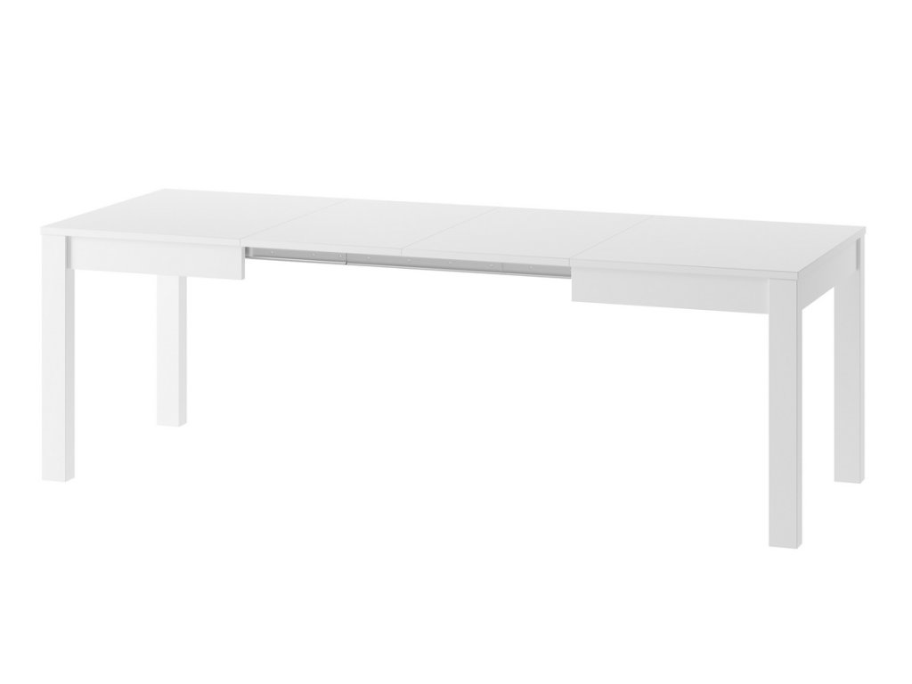 Jídelní stůl rozkládací. Deska jídelního stolu je vyrobena z LTD v barvě bílá mat, nohy stolu jsou z materiálu MDF v barvě bílá mat. Tento stůl je možné prodloužit na šíři více rozměrů 130/180/230/280 cm. V rámu stolu jsou uloženy 3 desky k prodloužení stolu. Dodáváme v demontovaném stavu.Doplňkové parametry