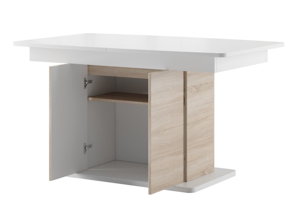 Jídelní stůl rozkládací. Stůl lze rozložit na 2 velikosti až na 210 cm (175 x 85 cm nebo 210 x 85 cm). V noze stolu je důmyslně umístěna skříňka s policí. Noha stolu je vyrobena z MDF v barvě dub sonoma a deska je z kvalitního lamina v barvě bílý mat. Dodáváme v demontovaném stavu.Doplňkové parametry