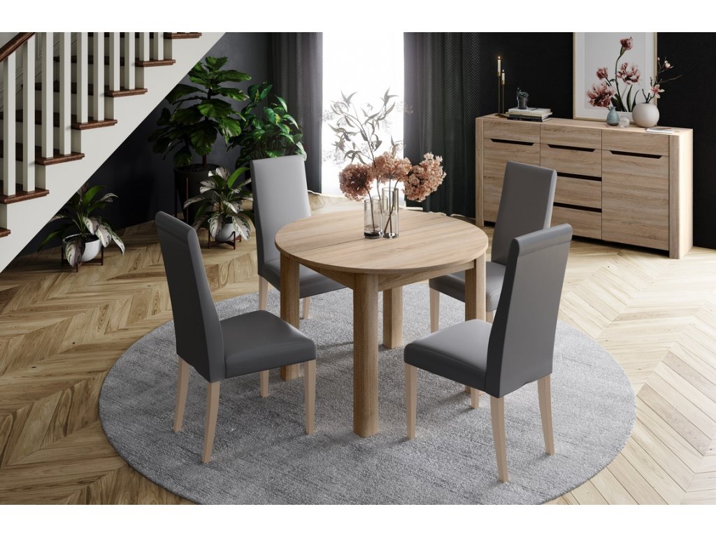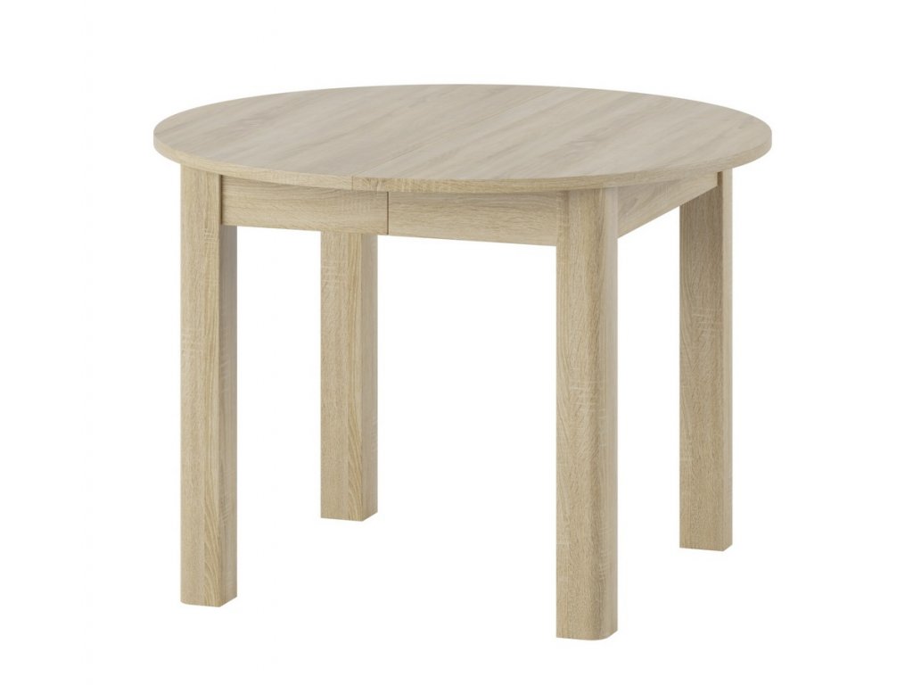 Jídelní stůl kulatý rozkládací. Deska jídelního stolu je vyrobena z přírodní dýhy v barvě dub sonoma, nohy stolu jsou z materiálu MDF v barvě dub sonoma. Tento stůl je možné prodloužit na šíři více rozměrů: 105/150/195/240 cm. V rámu stolu jsou uloženy 3 desky k prodloužení stolu. Dodáváme v demontovaném stavu.Doplňkové parametry