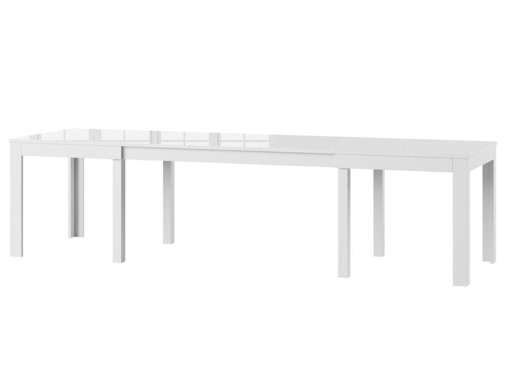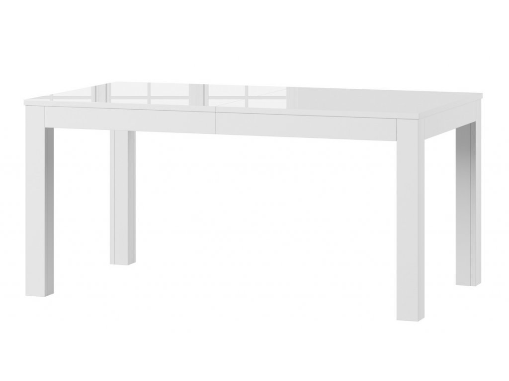 Jídelní stůl rozkládací. Deska jídelního stolu je vyrobena z LTD v barvě bílá lesk, plné nohy stolu jsou z materiálu MDF (nohy typu "L" jsou vyrobeny z LTD) v barvě bílá. Tento stůl je možné prodloužit na šíři 160 - 300 cm. Dodáváme v demontovaném stavu.Doplňkové parametry