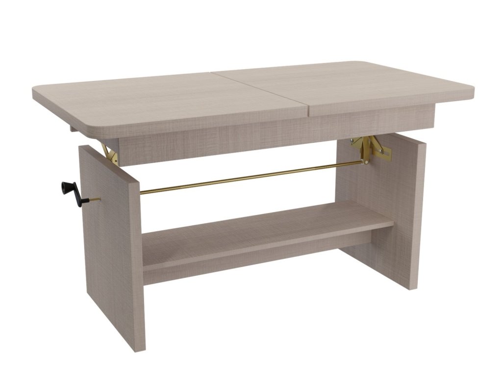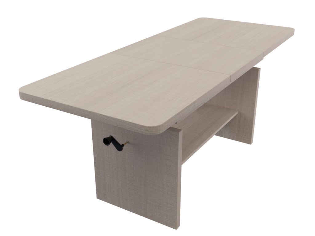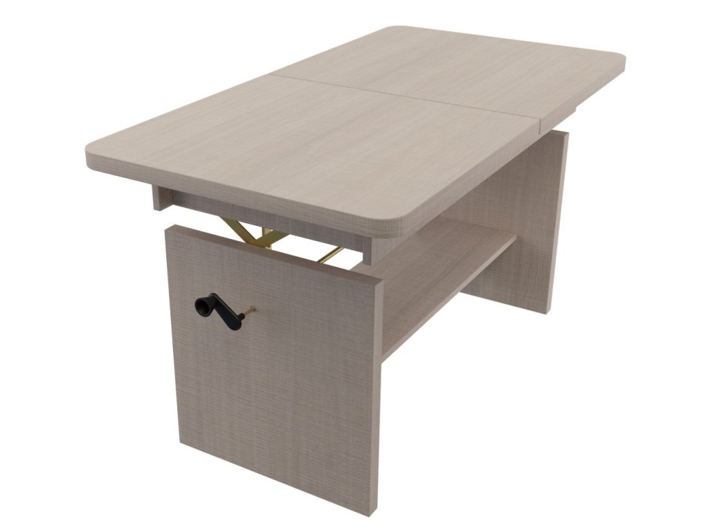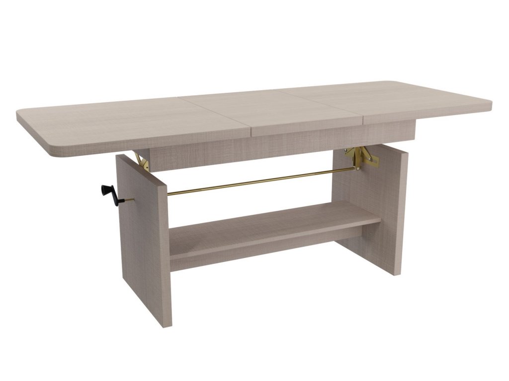 Elegantní konferenční stůl s funkcí jídelního stolu v moderním pojetí. Výhodou tohoto stolu je nastavitelná výška, kdy po zvýšení a rozkladu desky je možno ho použít ke stolování. Masivní deska je z LTD 32 mm opatřena ABS páskou 2 mm, otevírací mechanismus je vysoké kvality. Barevné provedení - dub santana světlá. Plocha před rozložením je 116 x 62 cm, po rozložení 156 x 62 cm. Výška se z 59 cm zvýší na 70 cm. Dodáváme v demontovaném stavu.Doplňkové parametry