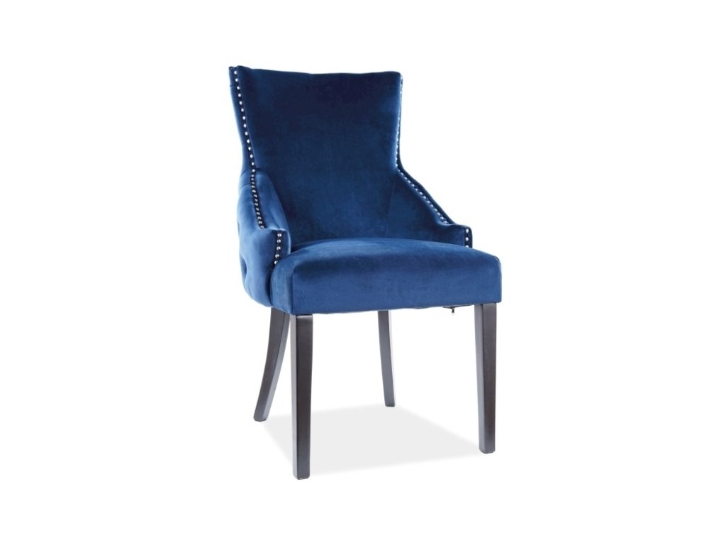 Atraktivní, velice pohodlná čalouněná židle - křeslo v novodobém stylu modern glamour. Nohy jsou ze dřeva v černé barvě, čalounění sedáku je vyrobeno z potahové látky BLUVEL AKSAMIT v granátově modré barvě. Kovové zdobení po obvodu a elegantní prošívání na zádech židle dodá ještě větší nádech luxusu. Pohodlí a elegance pro každý interiér.Doplňkové parametry