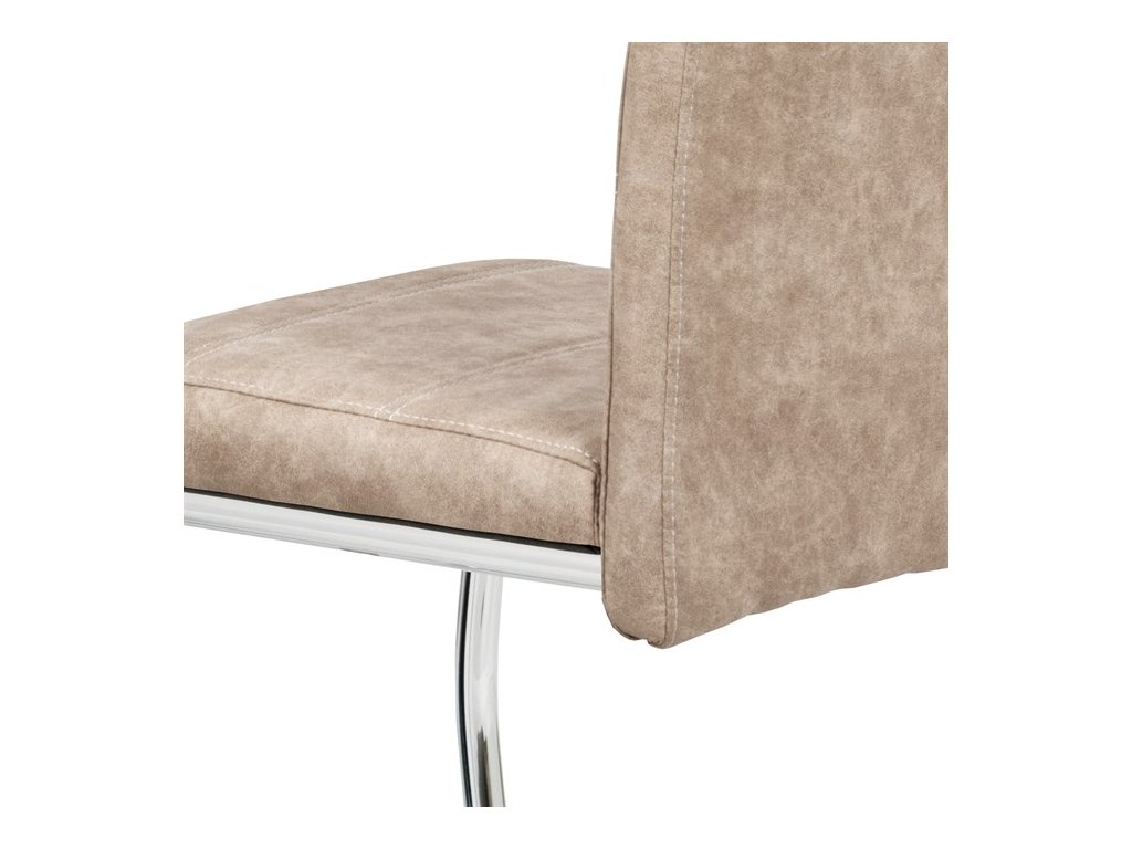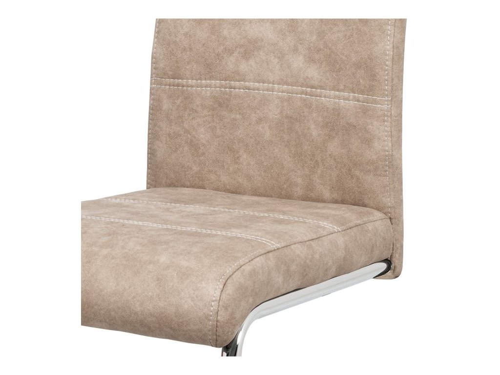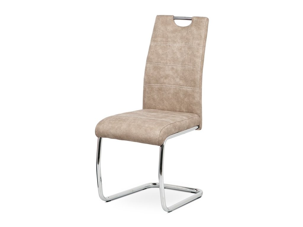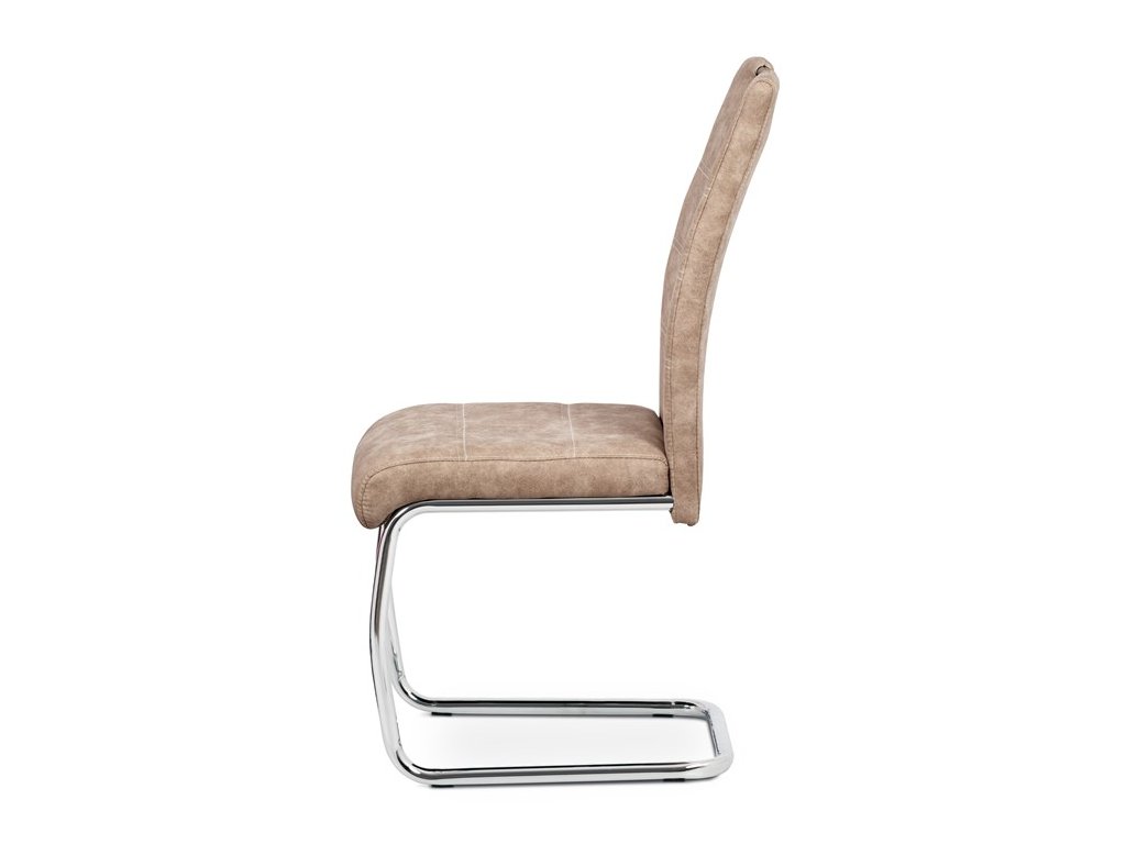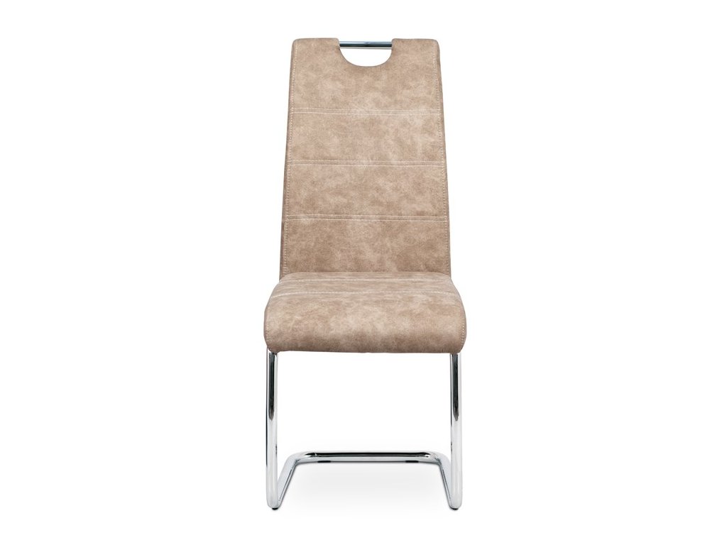 Jídelní židle HC-483 CRM3 v béžovém odstínu s potahem z látky v dekoru vintage kůže kombinuje stylový vzhled s praktickými vlastnostmi. Čalounění z kvalitní látky připomínající kůži je příjemné na dotek a snadno se udržuje, zatímco pevná kovová chromovaná podnož zajišťuje stabilitu a odolnost. Židle je vybavena pohupovým mechanismem, který přispívá k pohodlí při sezení, a ergonomicky tvarovaným opěradlem s praktickým úchytem pro snadnou manipulaci. Absence područek umožňuje větší variabilitu použití a snadné zasunutí pod stůl. Celková výška a rozměry židle jsou navrženy tak, aby poskytovaly komfortní posezení během jídel i delších setkání.