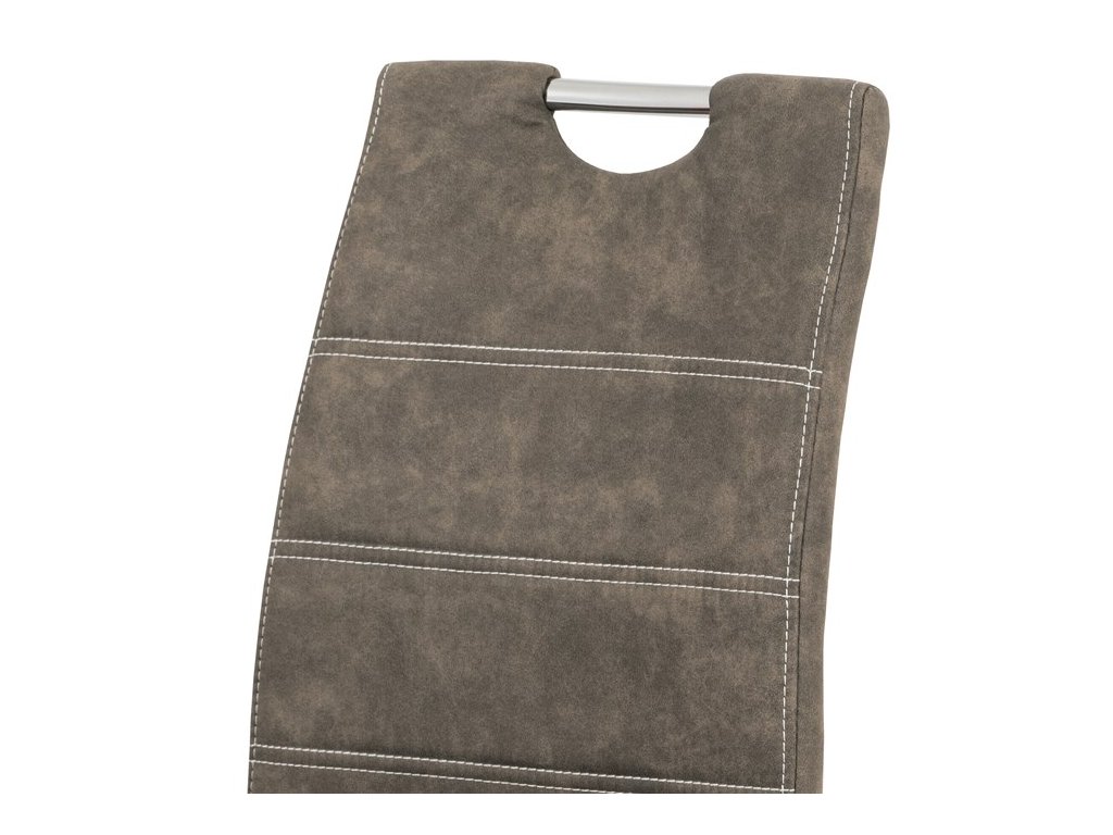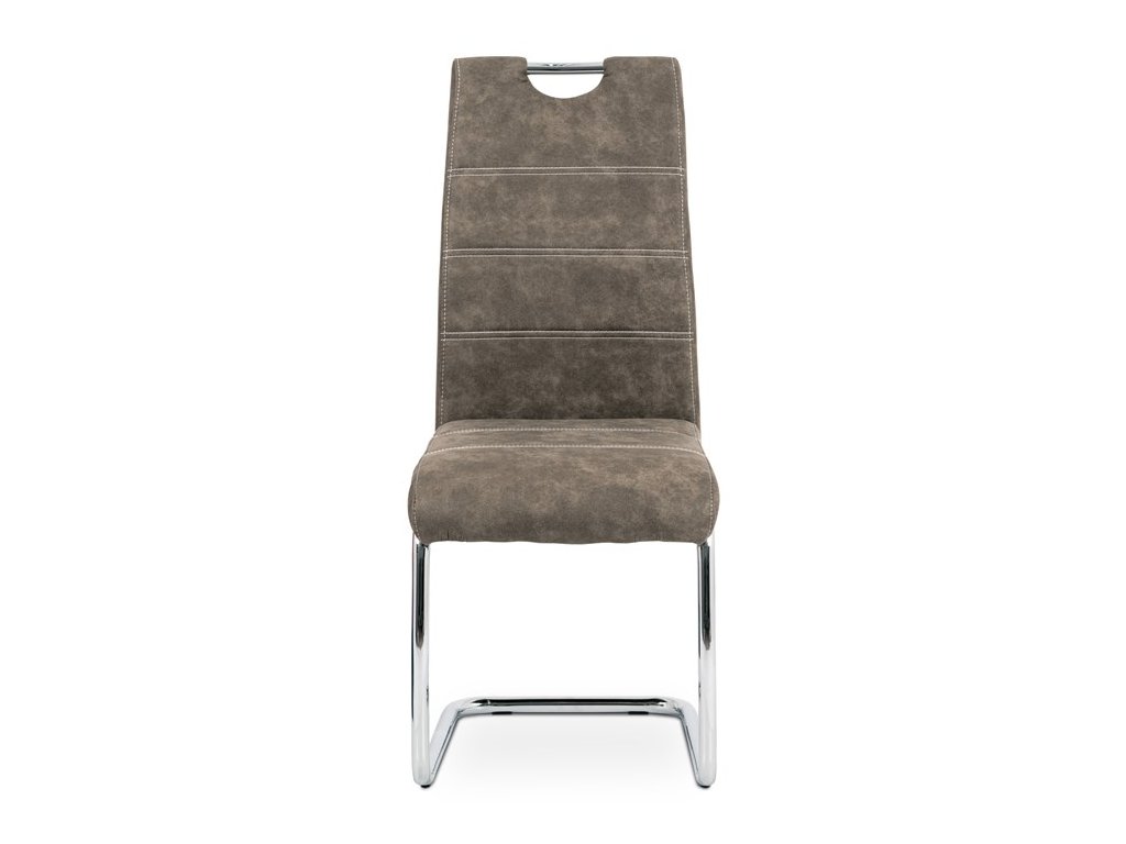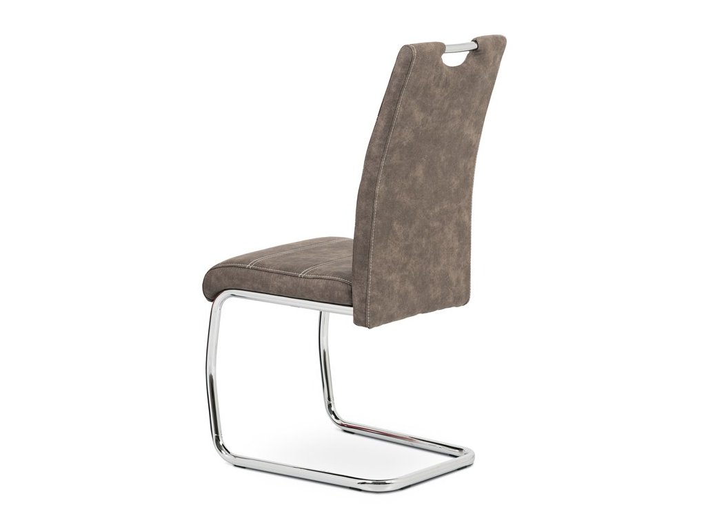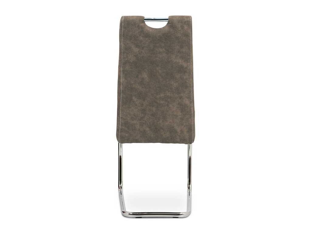 Jídelní židle s označením HC-483 BR3 nabízí potah z hnědé látky v dekoru vintage kůže, která kombinuje estetiku tradičního vzhledu s praktičností textilního materiálu. Pevná chromovaná kovová podnož je navržena v pohupovém provedení, které přispívá k příjemnému sezení a mírnému odpružení. Sedák i opěradlo jsou ergonomicky tvarované a čalouněné pro komfort během delšího posezení. Židle nemá područky ani možnost výškového nastavení, což ji činí vhodnou především pro jídelní prostory s omezeným prostorem. Stabilní kovová konstrukce zajišťuje nosnost odpovídající běžnému užívání v domácnostech i komerčních provozech.