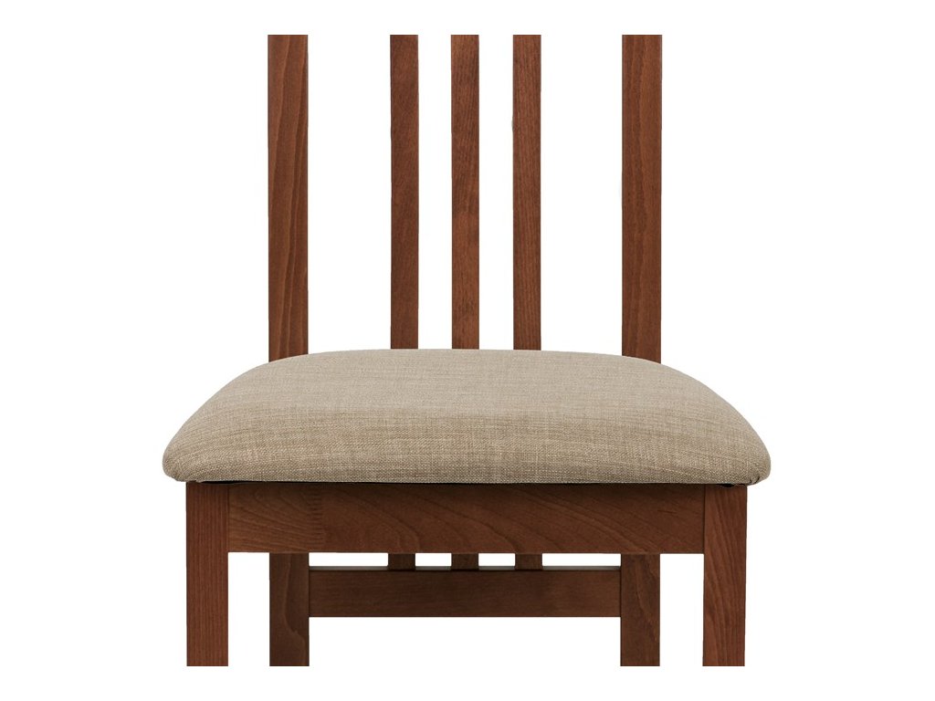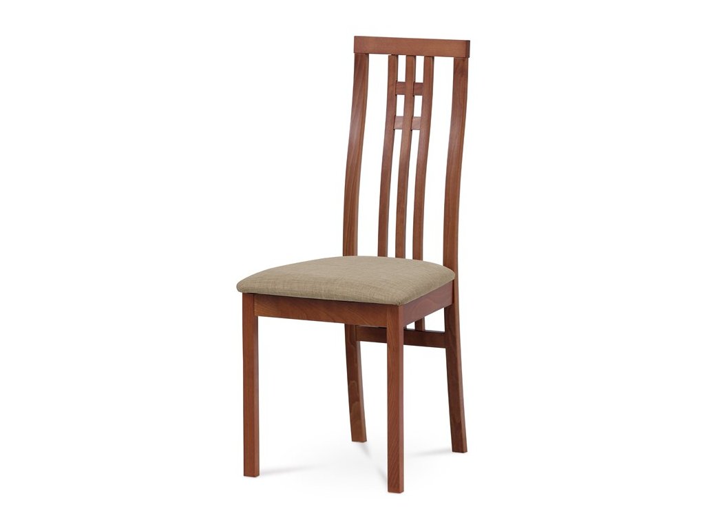 Jídelní židle z masivního buku v odstínu třešeň nabízí pevné a stabilní provedení vhodné pro každodenní použití. Pevná masivní konstrukce zajišťuje dlouhou životnost a stabilitu při sezení. Sedák je potažený béžovou látkou, která přispívá k pohodlí a zároveň snadné údržbě. Opěradlo je tvořeno svislými dřevěnými lamelami, které dodávají židli elegantní a vzdušný vzhled. Židle nemá područky ani otočný mechanismus, což ji činí praktickou a kompaktní volbou do jídelních prostor.