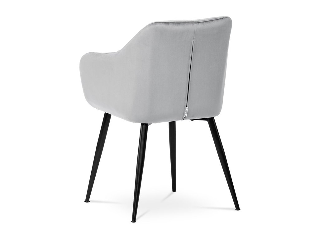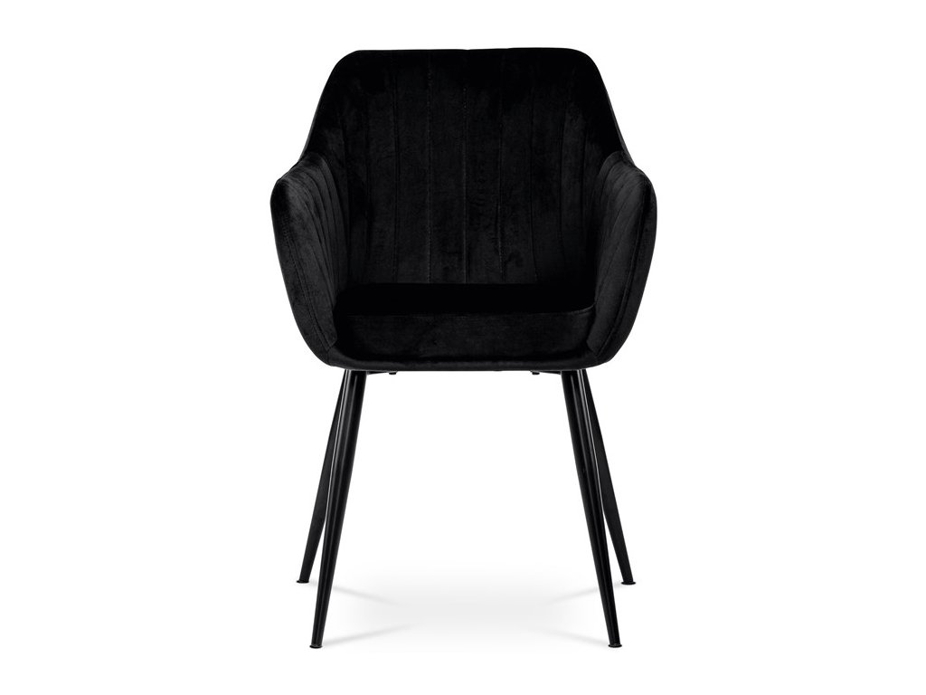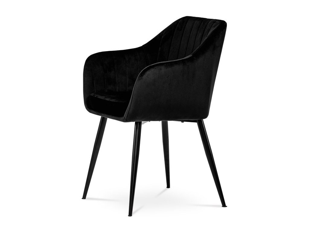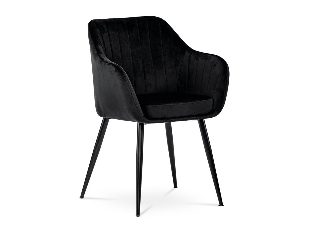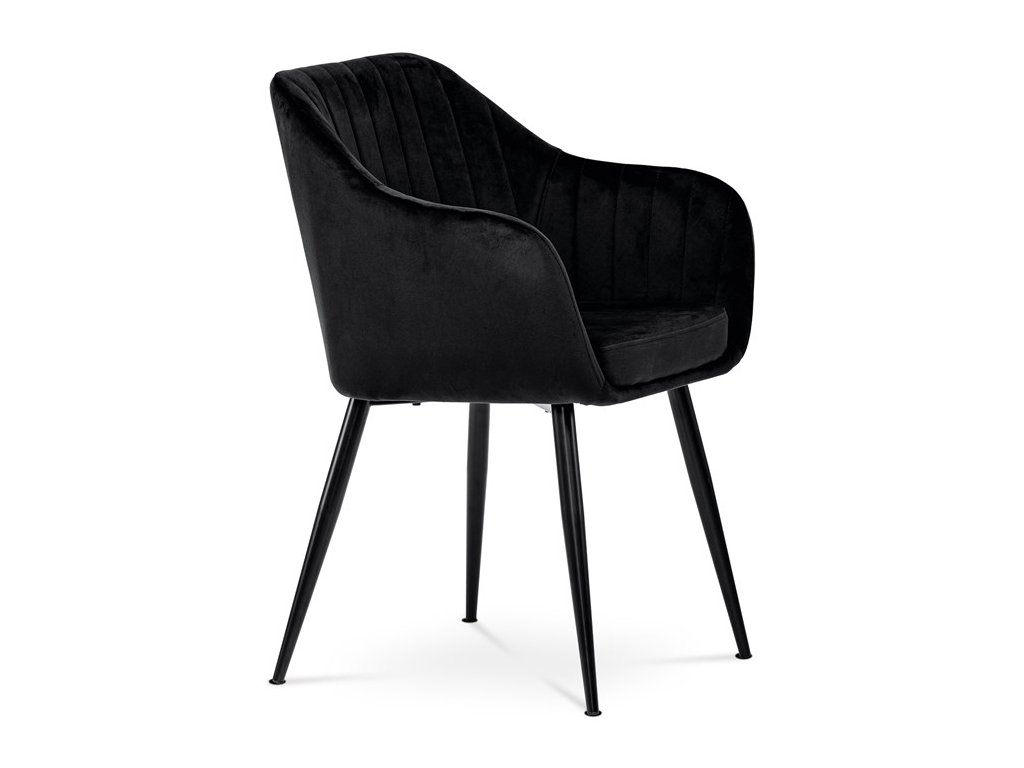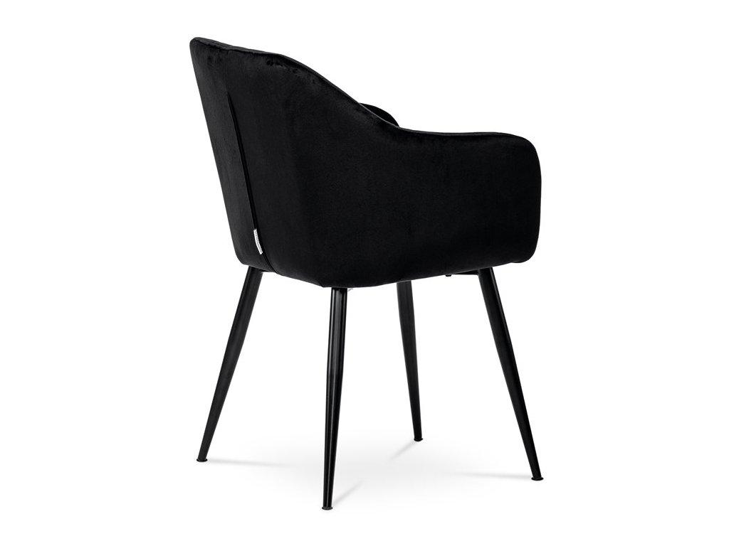 Dokonalý design, industriální styl a perfektní pohodlí je pro tuto židli samozřejmostí. Skořepina sedáku i opěradla má pevnou kovovou kostru, potah z velmi kvalitní sametové látky v matném provedení a nadčasovém a luxusním odstínu černé. Polstrování je z PU pěny. Bonusem ke zvýšení pohodlí posedu je 8 cm zvýšený a extra polstrovaný sedák a praktické pohodlné opěrky s opěrnou plochou ve výšce 69 cm od podlahy. Příjemný dekorativní prvek vytvářejí svislá prošití vnitřních částí opěradla i boků. Použitá látka je velmi odolná a perfektně se čistí. Stabilitu židle zajišťují čtyři kónické kovové nohy s kvalitním práškovým nástřikem v černé matné barvě. Ukončené jsou černými plastovými kluzáky, zabraňující poškození tvrdých povrchů podlah. Nohy mají kruhový průřez o průměru od 2 do 3,5 cm v horní části. Všechna tato plus produkují z tohoto modelu skvělou volbu pro Váš výběr zařízení jídelních a nebo obývacích prostor, ale skvěle se hodí i jako konferenční židle do zasedacích místností. Nosnost židle je až 120 kg. Základní rozměry jsou – celková šíře 58 cm, celková hloubka 57 cm, celková výška 84 cm, výška sedu 52 cm a hloubka sedu 43 cm.