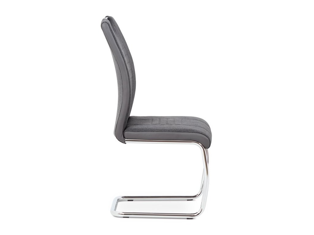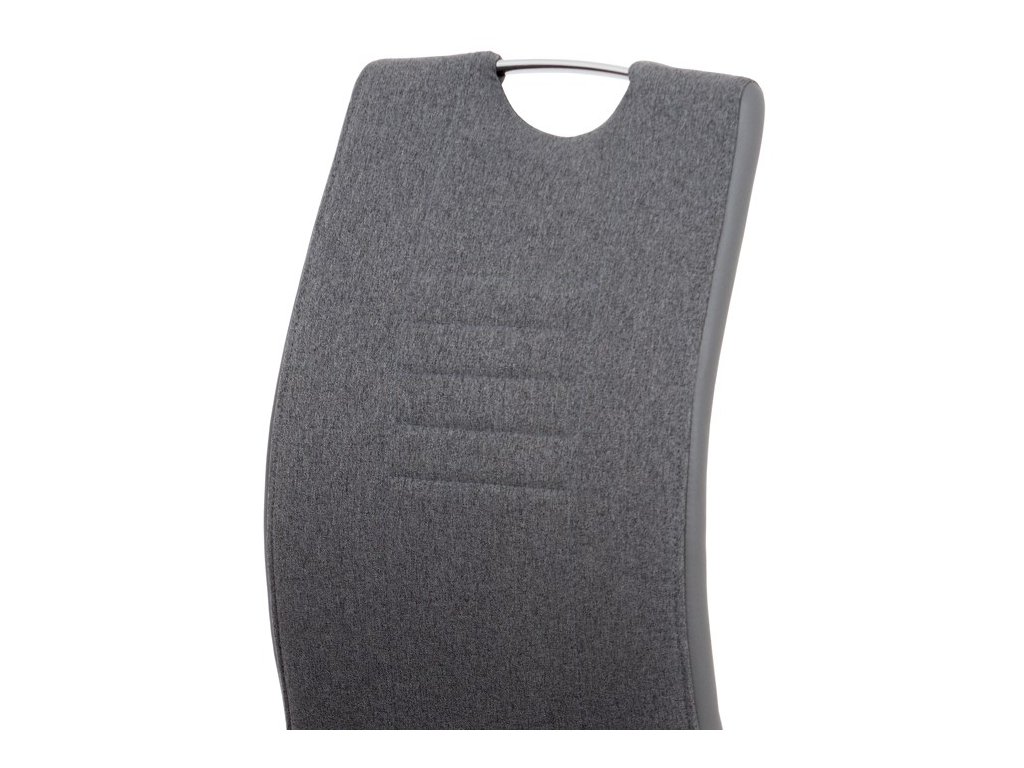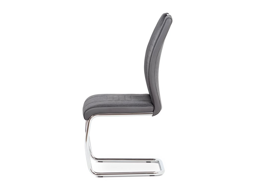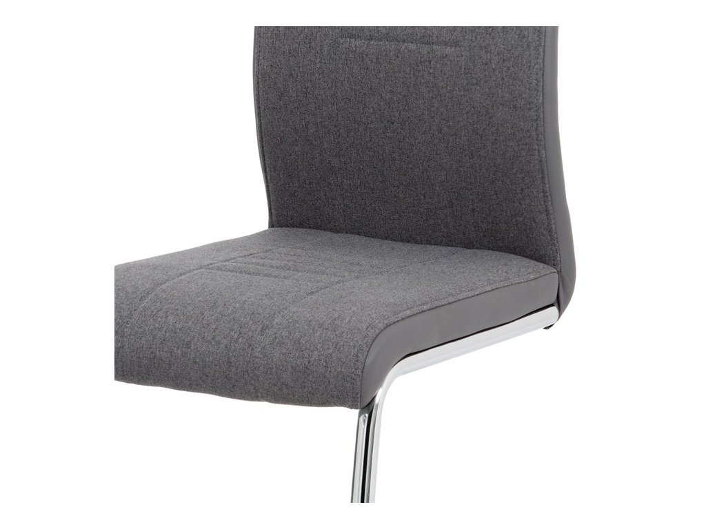 Jídelní židle v šedém provedení kombinuje látku s ekokůží, která je doplněna designovým prošitím na sedáku i opěradle pro zvýraznění moderního vzhledu. Pevná podnož z chromovaného kovu zajišťuje stabilitu a zároveň dodává židli lehkost a lesk. Ergonomicky tvarované opěradlo podporuje pohodlné sezení během jídel i delších posezení. Židle nemá područky ani otočný mechanismus, což ji činí kompaktní a snadno umístitelnou do různých prostor. Materiály jsou navrženy pro snadnou údržbu a dlouhou životnost.