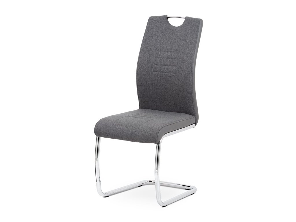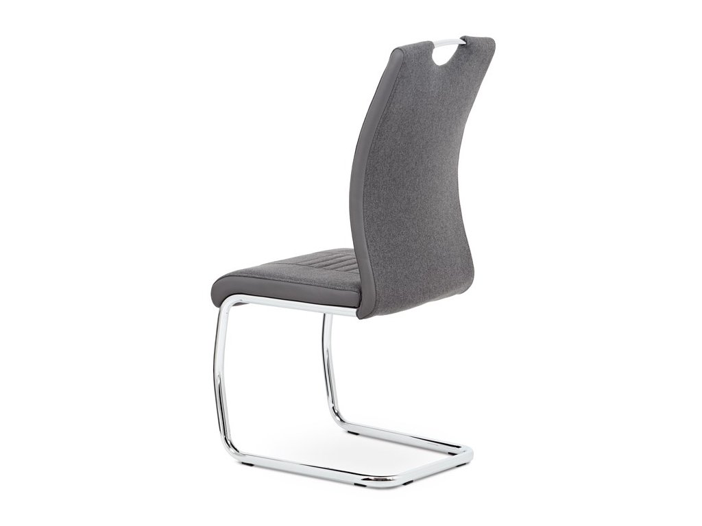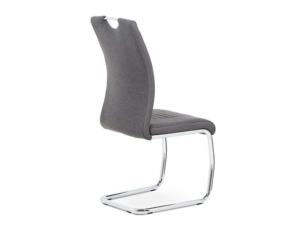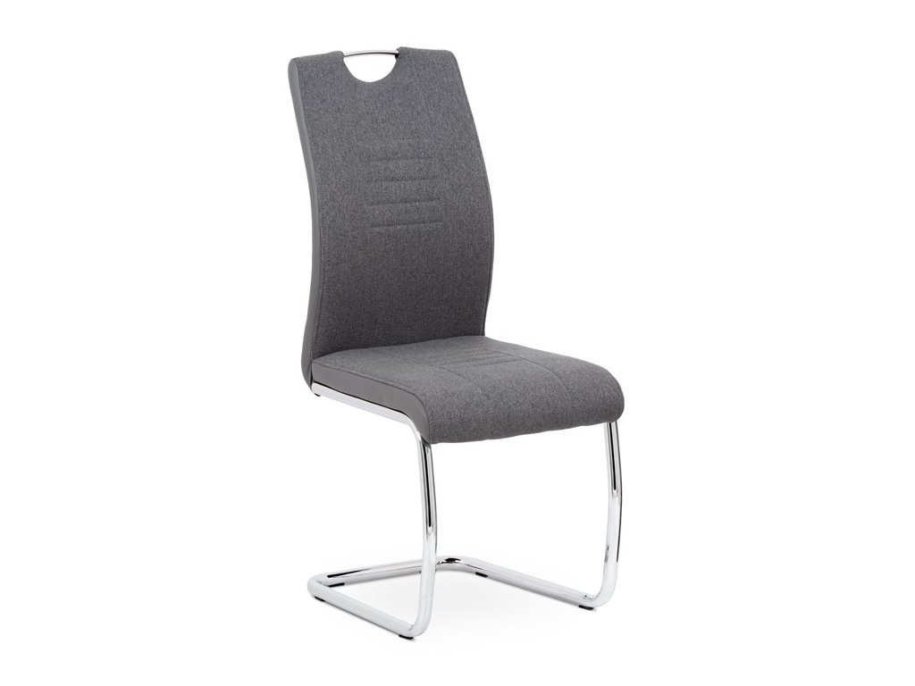 Jídelní židle v šedém provedení kombinuje látku s ekokůží, která je doplněna designovým prošitím na sedáku i opěradle pro zvýraznění moderního vzhledu. Pevná podnož z chromovaného kovu zajišťuje stabilitu a zároveň dodává židli lehkost a lesk. Ergonomicky tvarované opěradlo podporuje pohodlné sezení během jídel i delších posezení. Židle nemá područky ani otočný mechanismus, což ji činí kompaktní a snadno umístitelnou do různých prostor. Materiály jsou navrženy pro snadnou údržbu a dlouhou životnost.