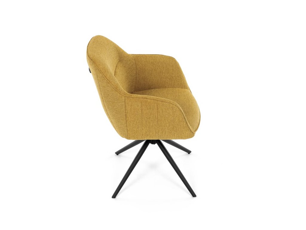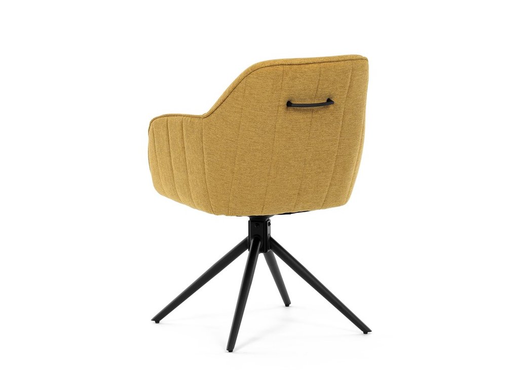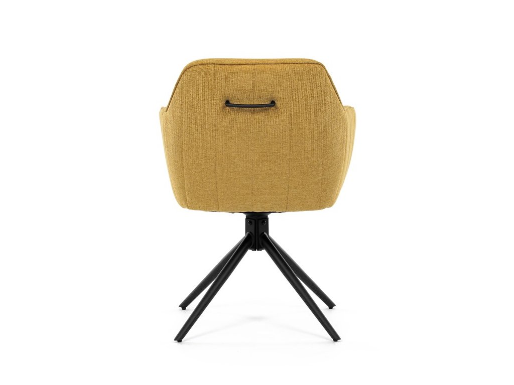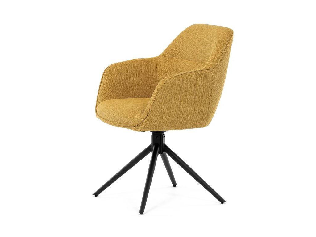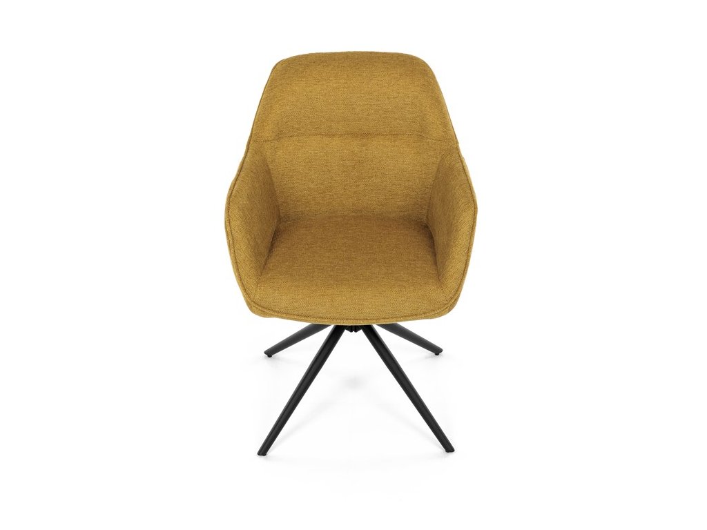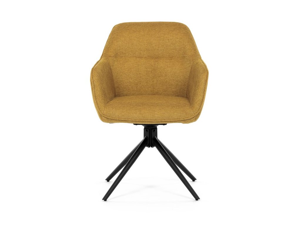 Moderní jídelní židle ve žluté barvě s efektním prošitím zádové i přední části opěráku. Prošití je v brvě potahového materiálu. Zadní část opěráku je opatřena vkusným madlem pro snazší manipulaci. Čtyři kovové nohy v matném práškovém nástřiku vycházejí z centrálního bodu ve středu sedáku. Sedák je otočný o P90°+ L 90° s vratným mechanismem - funkce reset.