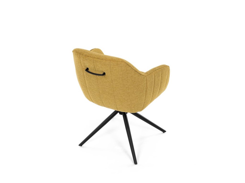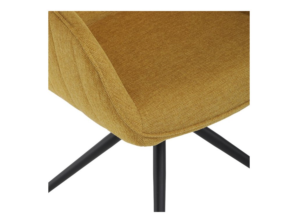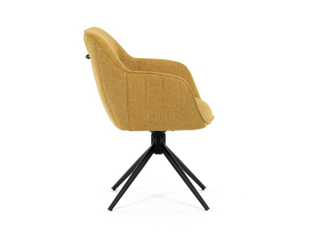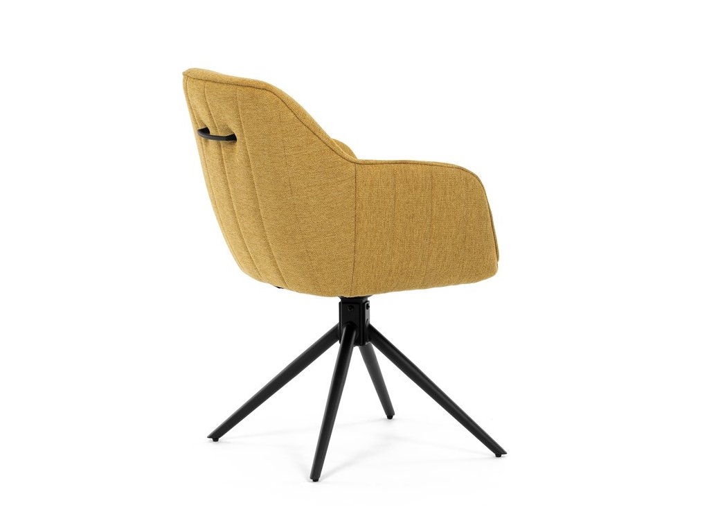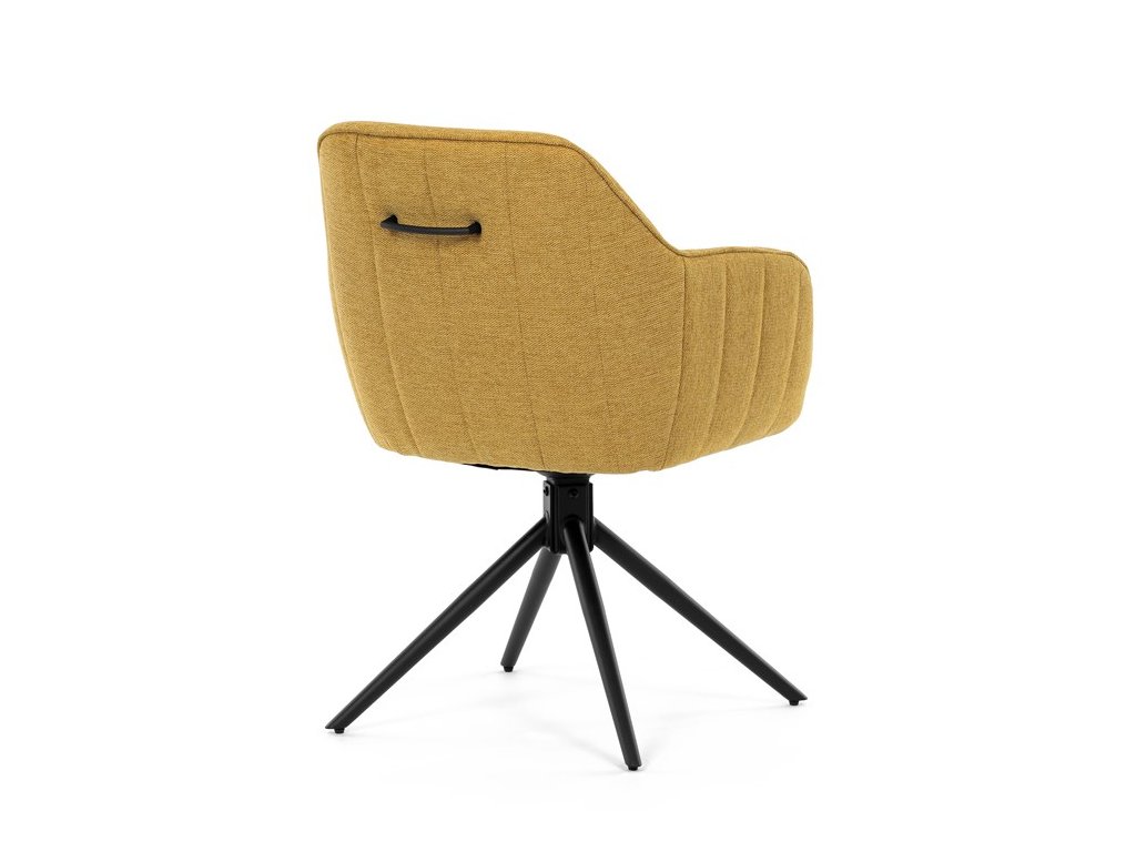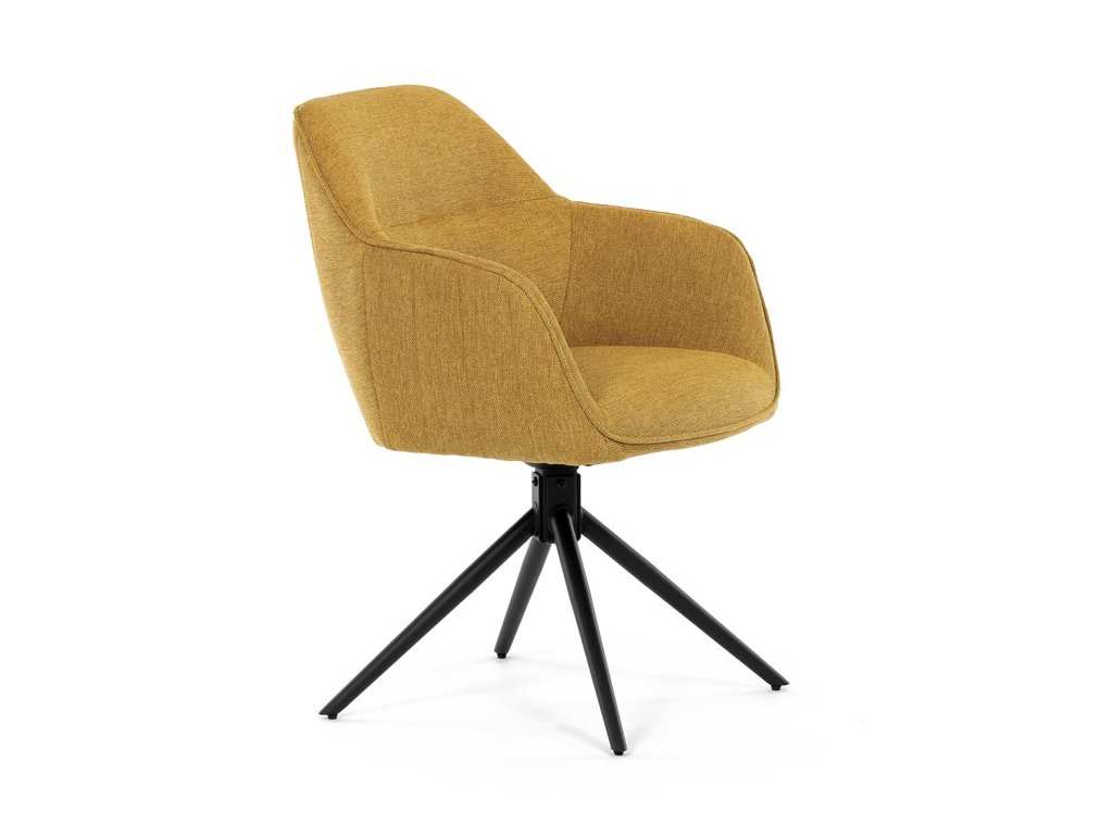 Moderní jídelní židle ve žluté barvě s efektním prošitím zádové i přední části opěráku. Prošití je v brvě potahového materiálu. Zadní část opěráku je opatřena vkusným madlem pro snazší manipulaci. Čtyři kovové nohy v matném práškovém nástřiku vycházejí z centrálního bodu ve středu sedáku. Sedák je otočný o P90°+ L 90° s vratným mechanismem - funkce reset.