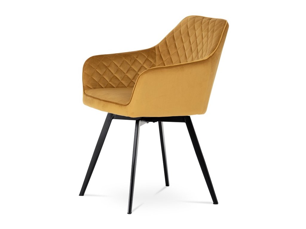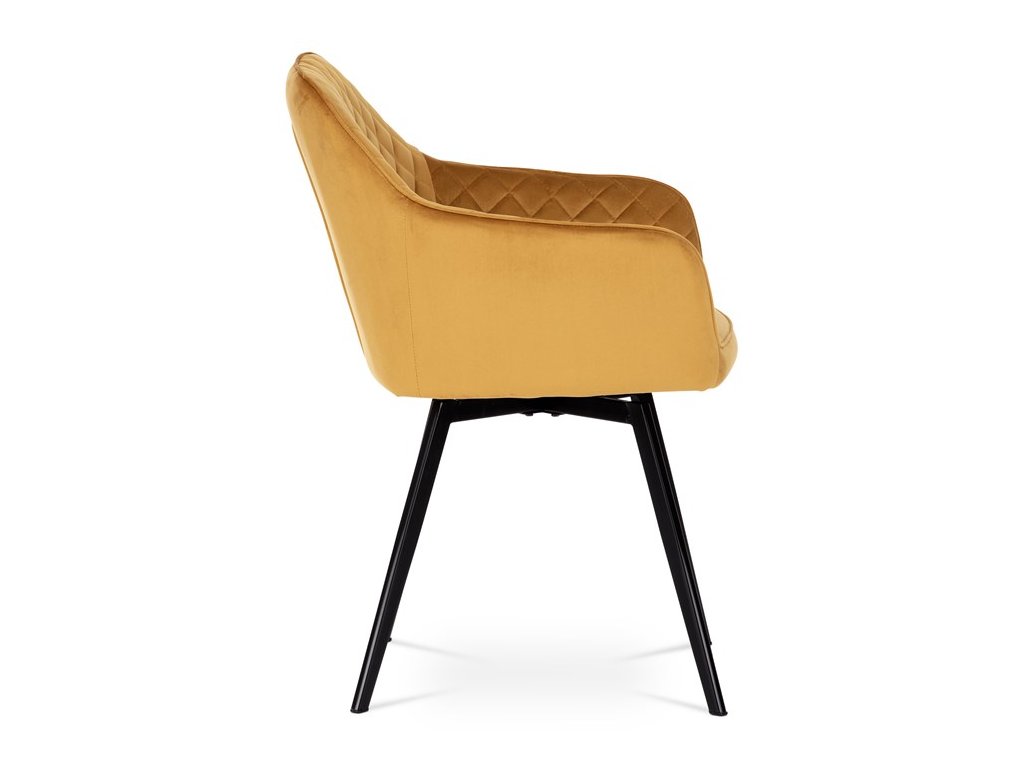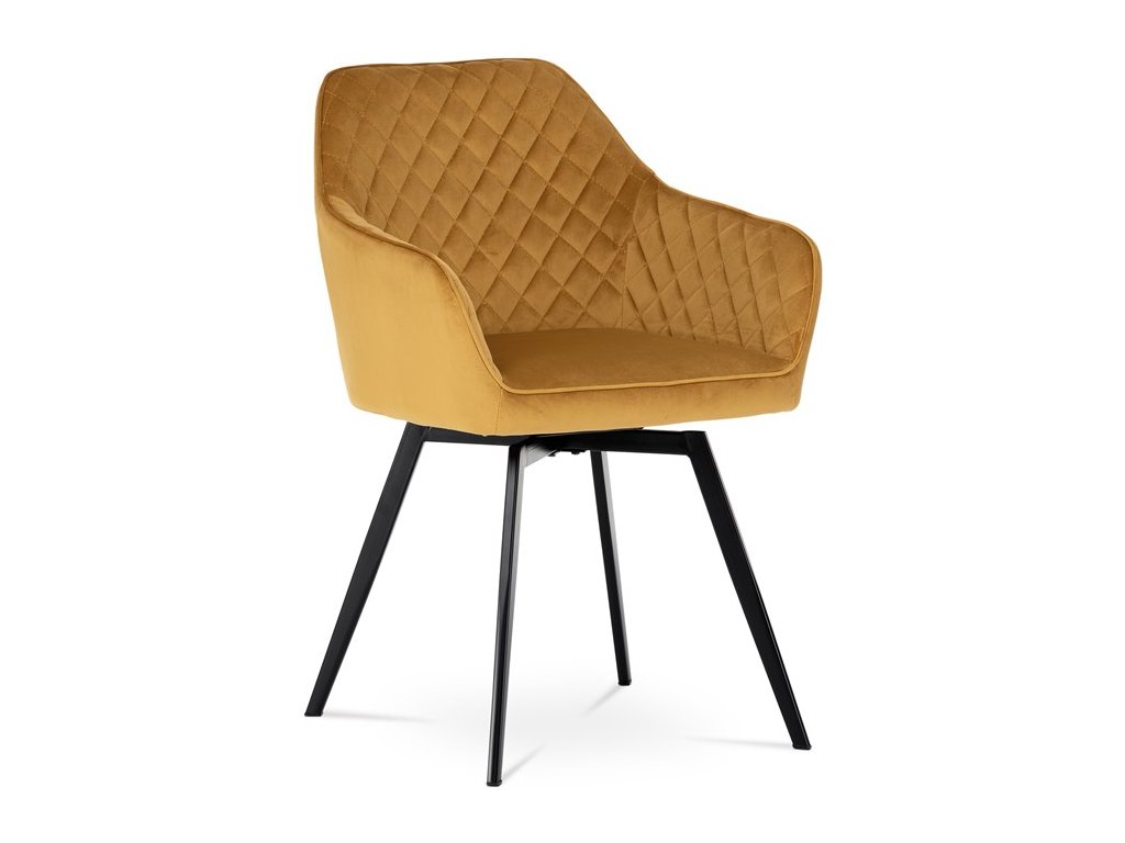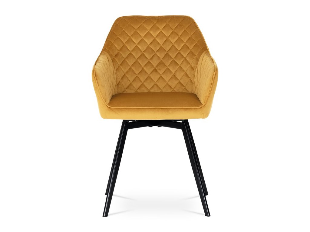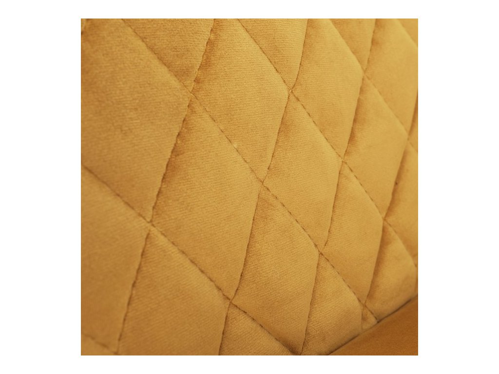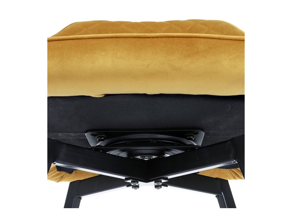 Díky svému dokonalému designu je tato židle v industriálním stylu nezaměnitelná a zároveň velmi pohodlná. Skořepina sedáku a opěráku má potah z kvalitní látky v trendy hořčicově žlutém matném sametu. Polstrování je z PU pěny. Velmi dekorativním prvkem je výrazné kosočtvercové prošití vnitřních ploch v barvě potahu a paspule po obvodu celé skořepiny. Vybraná látka se také velmi dobře čistí. Stabilitu židle zajišťují čtyři kónické kovové nohy obdélníkového průřezu s kvalitním práškovým nástřikem v černé matné barvě. Ukončené jsou černými plastovými kluzáky, zabraňující poškození tvrdých povrchů podlah. Tato provedení produkují z tohoto modelu židle skvělou volbu pro zařízení obývacích či jídelních, ale také zasedacích místností. Nosnost židle je 110 kg. Bonusem této židle je otočný a vratným mechanismus, který umožňuje otáčení o 90° doleva a o 90° doprava a zároveň vždy vrátí sedák do původní polohy. Díky němu žiidle zůstanou vždy srovnané u stolu.