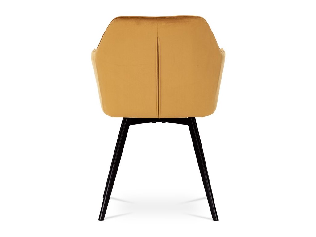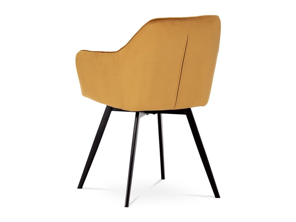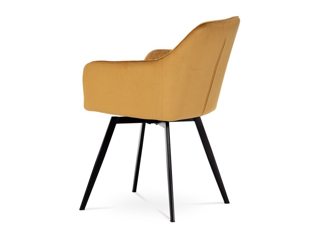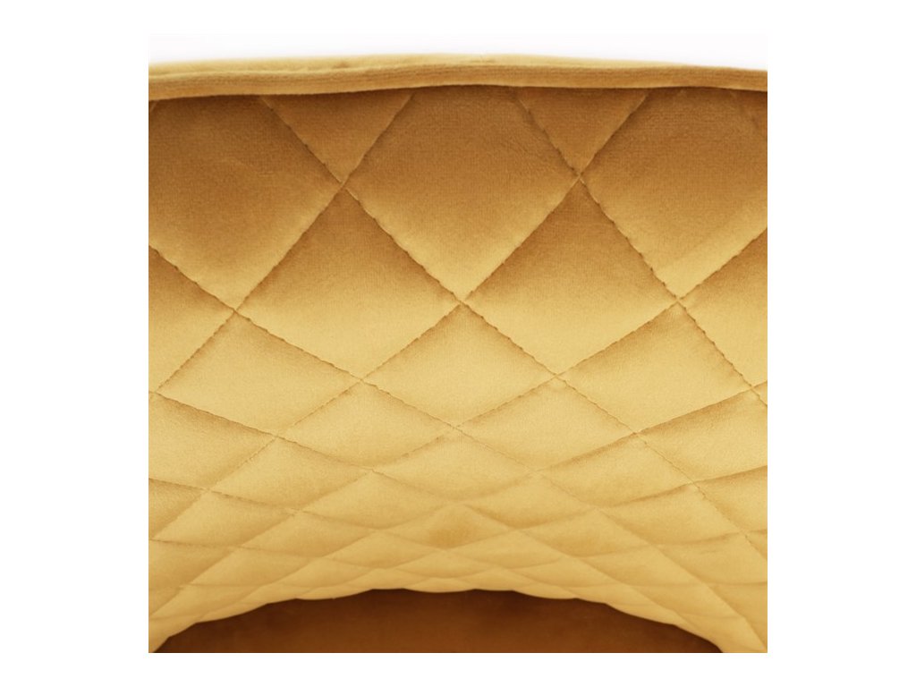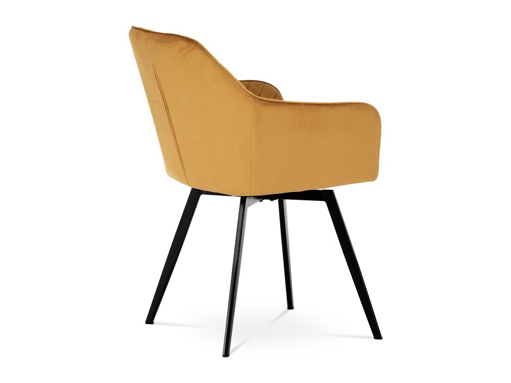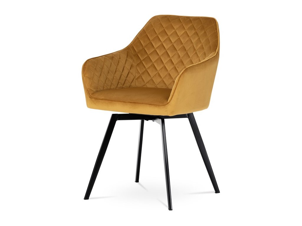 Díky svému dokonalému designu je tato židle v industriálním stylu nezaměnitelná a zároveň velmi pohodlná. Skořepina sedáku a opěráku má potah z kvalitní látky v trendy hořčicově žlutém matném sametu. Polstrování je z PU pěny. Velmi dekorativním prvkem je výrazné kosočtvercové prošití vnitřních ploch v barvě potahu a paspule po obvodu celé skořepiny. Vybraná látka se také velmi dobře čistí. Stabilitu židle zajišťují čtyři kónické kovové nohy obdélníkového průřezu s kvalitním práškovým nástřikem v černé matné barvě. Ukončené jsou černými plastovými kluzáky, zabraňující poškození tvrdých povrchů podlah. Tato provedení produkují z tohoto modelu židle skvělou volbu pro zařízení obývacích či jídelních, ale také zasedacích místností. Nosnost židle je 110 kg. Bonusem této židle je otočný a vratným mechanismus, který umožňuje otáčení o 90° doleva a o 90° doprava a zároveň vždy vrátí sedák do původní polohy. Díky němu žiidle zůstanou vždy srovnané u stolu.