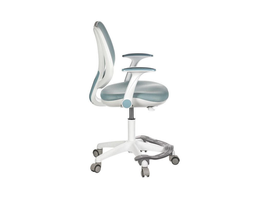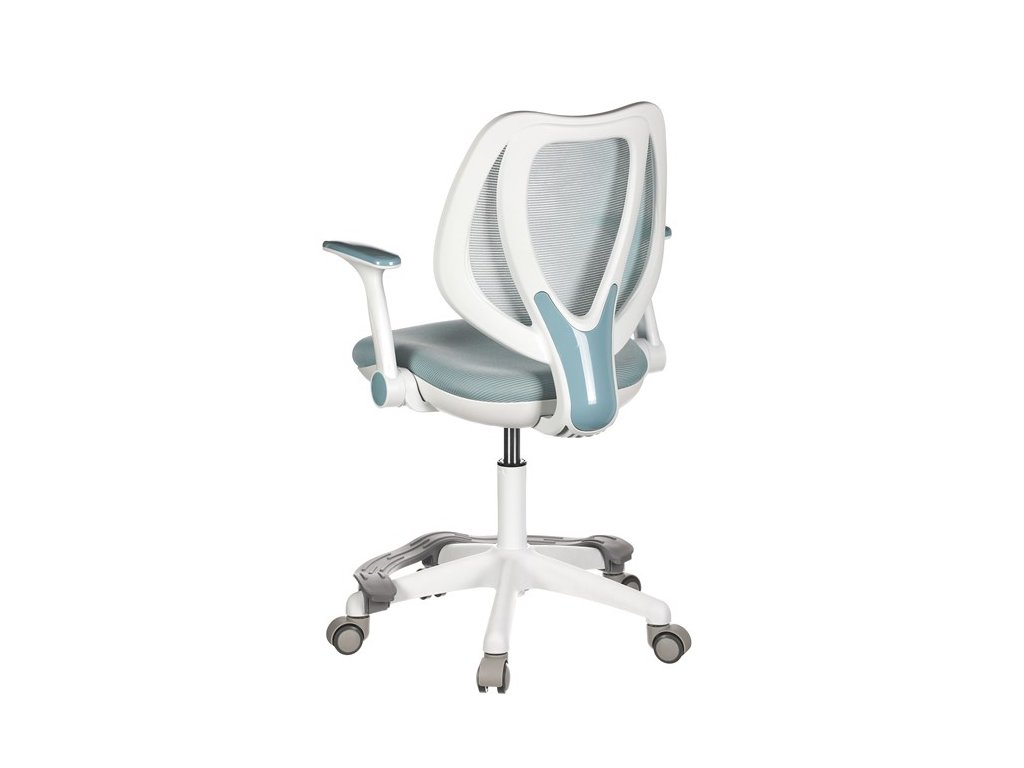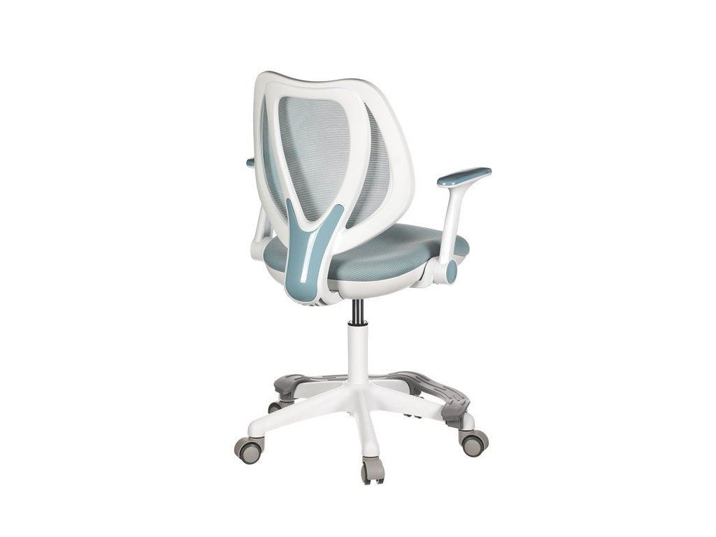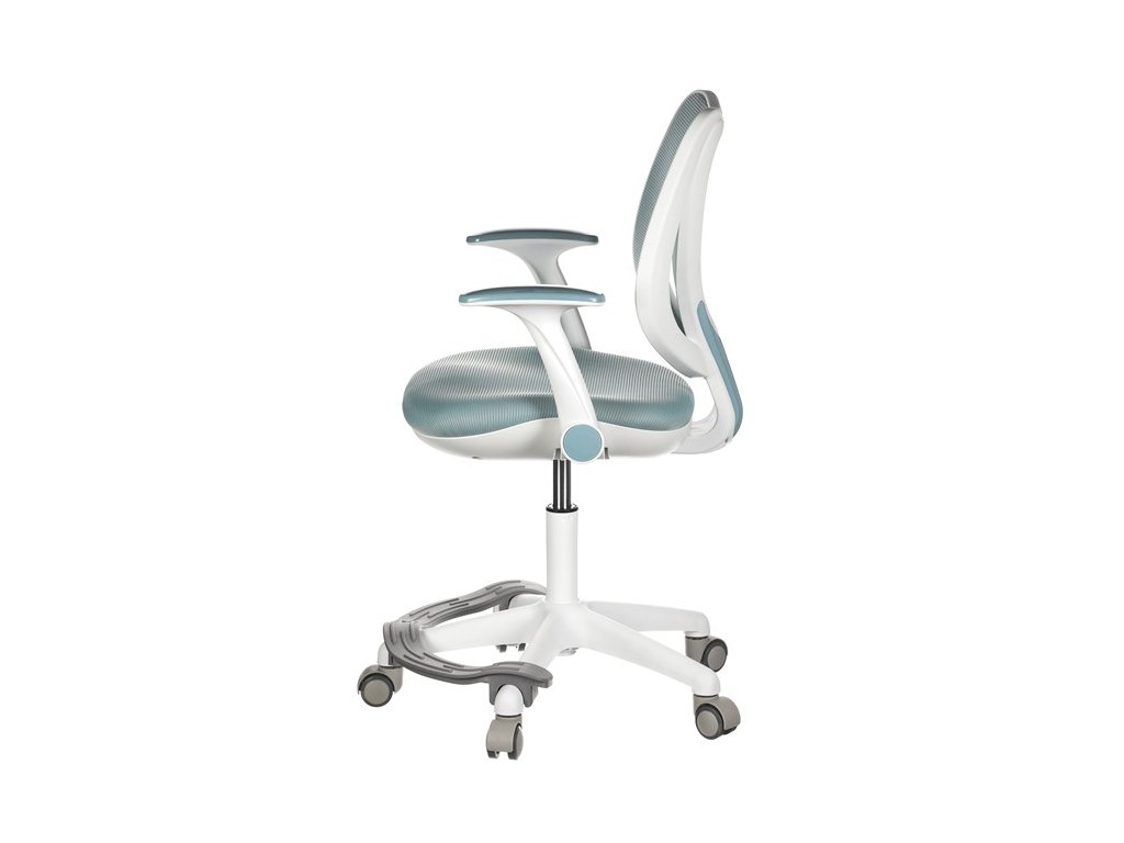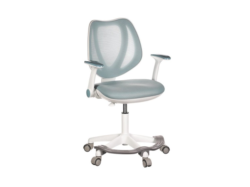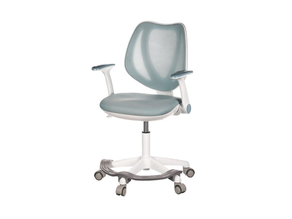 Dětská židle v příjemných pastelových barvách spolu s bílou kostrou nabízí jednoduchý a elegantní design. Židle má pevný opěrák potažený prodyšným síťovaným materiálem. Sedák ve stejném potahu poskytuje dostatek pohodlí díky svému vyměkčení. Pro pocit pohodlí slouží pevné područky, které jsou na své vrchní části opatřeny lesklým plastovým povrchem v barvě potahového materiálu. Důležitá je také integrovaná opěra nohou, která přispívá k pohodlnému sezení. Židle je opatřena speciálními funkčními kolečky, která se při zatížení automaticky zablokují, což zabraňuje nechtěným pohybům židle.