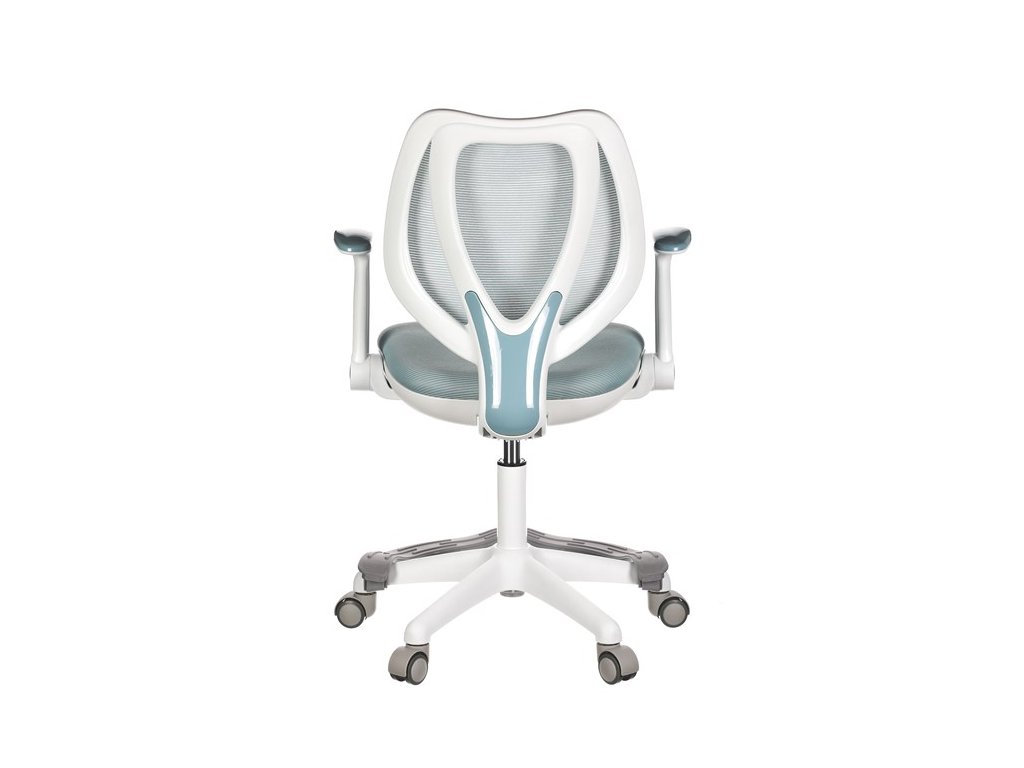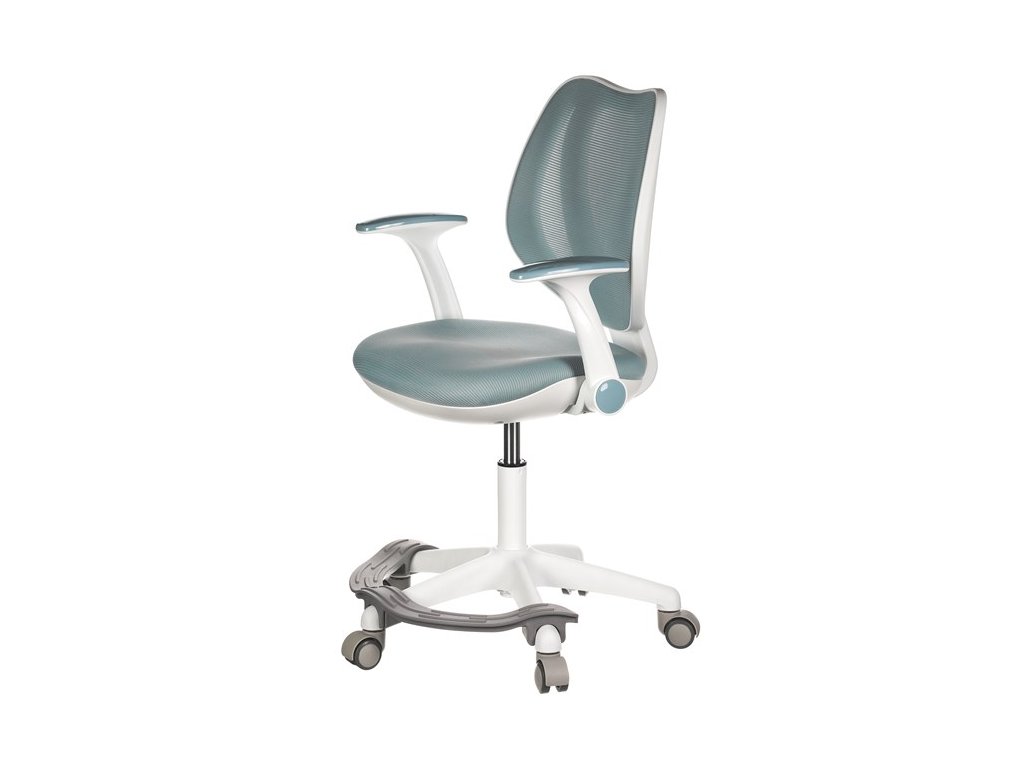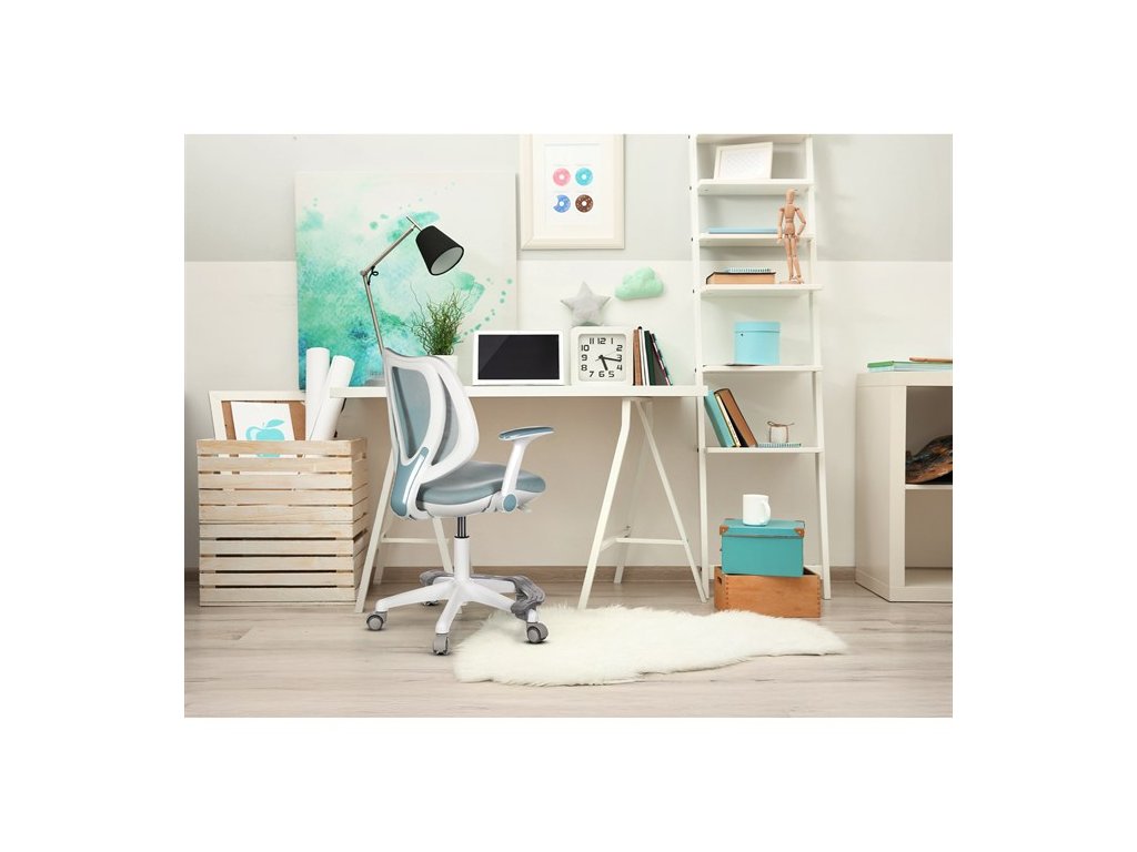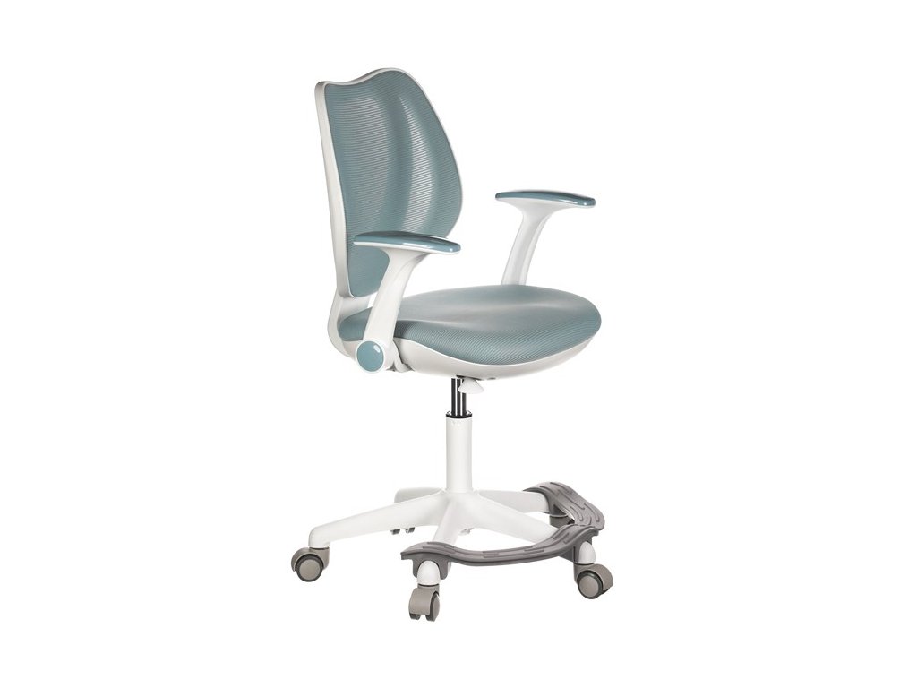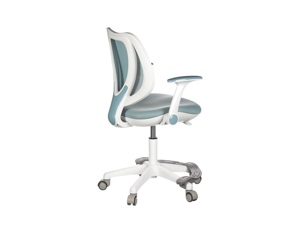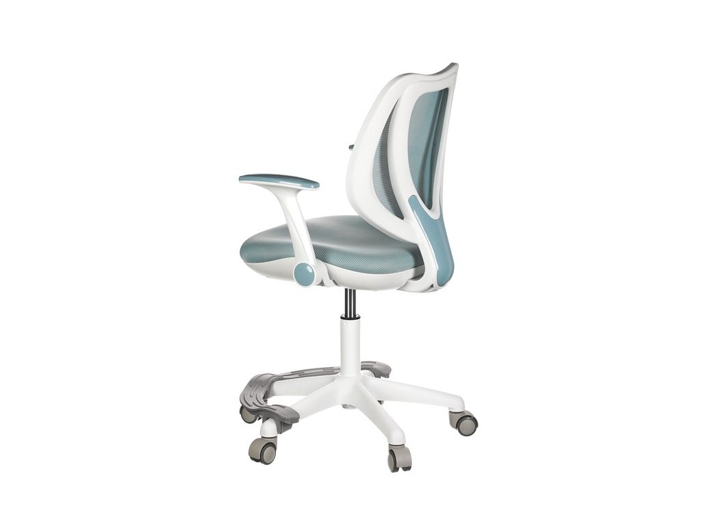 Dětská židle v příjemných pastelových barvách spolu s bílou kostrou nabízí jednoduchý a elegantní design. Židle má pevný opěrák potažený prodyšným síťovaným materiálem. Sedák ve stejném potahu poskytuje dostatek pohodlí díky svému vyměkčení. Pro pocit pohodlí slouží pevné područky, které jsou na své vrchní části opatřeny lesklým plastovým povrchem v barvě potahového materiálu. Důležitá je také integrovaná opěra nohou, která přispívá k pohodlnému sezení. Židle je opatřena speciálními funkčními kolečky, která se při zatížení automaticky zablokují, což zabraňuje nechtěným pohybům židle.