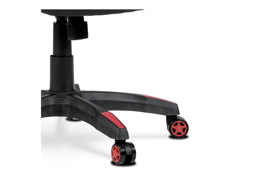 Herní a kancelářské křeslo E-racer s potahem z červené a černé látky nabízí ergonomicky tvarované opěradlo s integrovanou opěrkou hlavy pro podporu krční páteře. Sedák je vybaven vyměkčenou vrchní částí pro zvýšený komfort při dlouhodobém sezení, zatímco pevné čalouněné područky doplňují stabilitu a pohodlí. Křeslo disponuje houpacím mechanismem a možností výškového nastavení, což umožňuje přizpůsobení individuálním potřebám uživatele. Plastový kříž s kolečky určenými pro tvrdé povrchy zajišťuje snadnou mobilitu a stabilitu na různých typech podlah. Celkově je křeslo navrženo pro dlouhou životnost a komfortní používání v herním i kancelářském prostředí.
