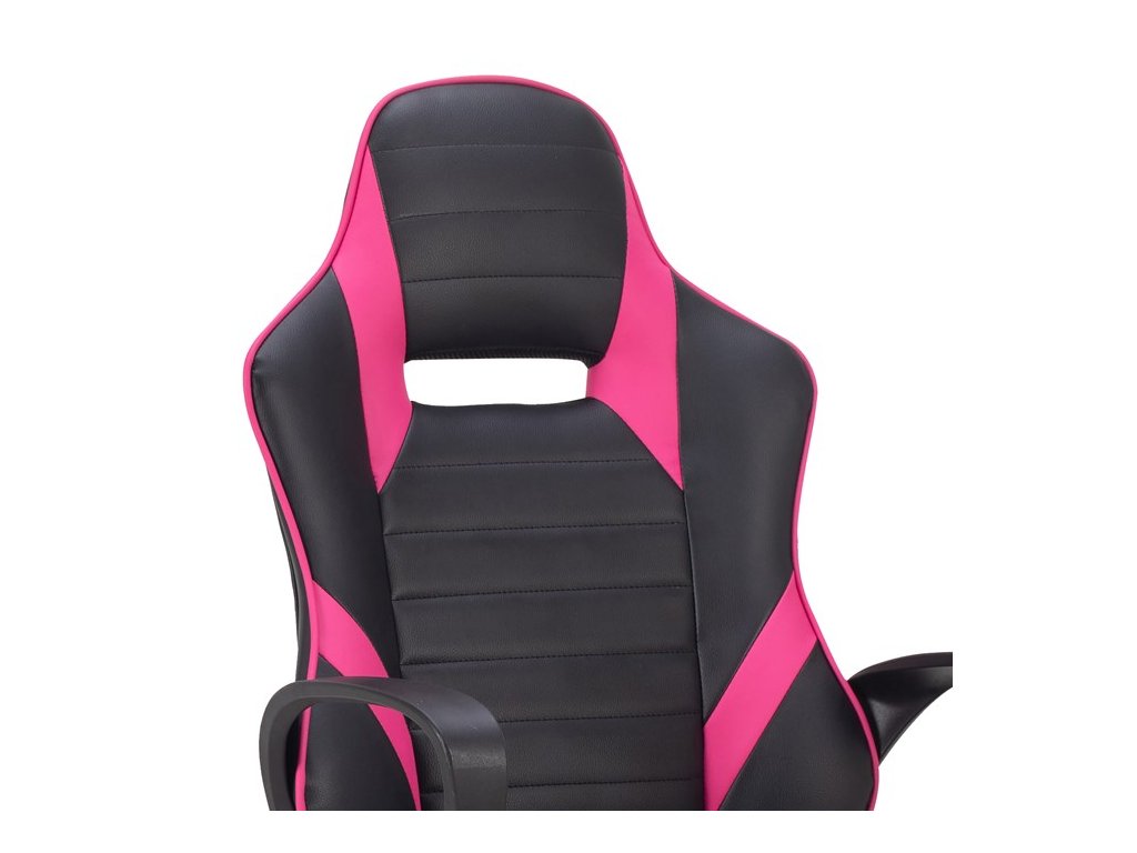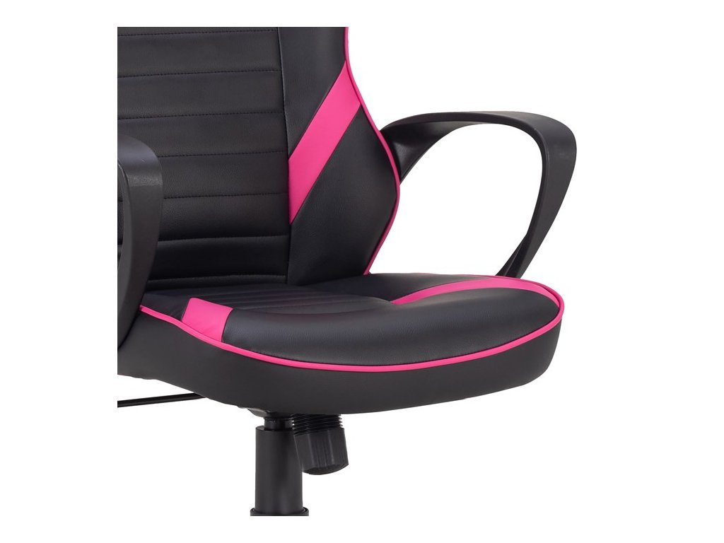 Herní křeslo s potahem z kombinace černé a růžové ekokůže nabízí ergonomicky tvarovaný design, který podporuje pohodlné sezení i během dlouhých herních sezení. Vysoké polstrování sedáku a opěradla zajišťuje dostatečnou oporu a komfort, zatímco pevné područky přispívají k stabilitě a pohodlí rukou. Křeslo je vybaveno houpacím mechanismem pro možnost mírného naklánění a výškově nastavitelným sedákem, což umožňuje individuální přizpůsobení výšky podle potřeby uživatele. Plastový kříž s kolečky umožňuje snadnou mobilitu po různých typech podlahových krytin. Celkově je křeslo navrženo s důrazem na kvalitní zpracování a dlouhou životnost.