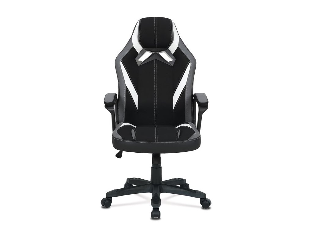 Herní křeslo HM s potahem kombinujícím šedou a černou látku s bílými prvky z ekokůže nabízí komfortní sezení díky vysokému polstrování sedáku a opěradla. Čalouněné pevné područky přispívají k pohodlí během dlouhých herních sezení, zatímco houpací mechanika umožňuje mírný pohyb a uvolnění. Plastový kříž zajišťuje stabilitu a lehkost celé židle. Design křesla je laděn do moderních barevných tónů, které se hodí do herních i pracovních prostor. Produkt neobsahuje bederní opěrku ani opěrku hlavy, což zachovává jednoduchost a čistotu tvaru.