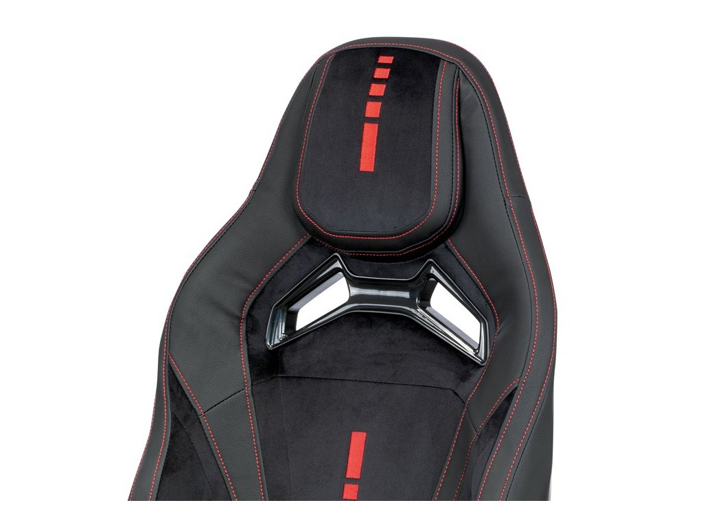 Herní křeslo E-racer v černé barvě kombinuje sametovou látku s ekokůží, což zajišťuje příjemný dotek a snadnou údržbu. Pevná plastová podnož je vybavena pěti kolečky pro snadnou mobilitu a stabilitu. Křeslo disponuje houpacím mechanismem umožňujícím nastavení opěradla až do polohy 180°, což přispívá k maximálnímu pohodlí během dlouhých herních sezení. Výškově nastavitelné sedadlo a jednosměrné 1D područky umožňují přizpůsobení podle individuálních potřeb uživatele. Celkový design s výrazným červeným prošitím a ergonomickým tvarem opěradla podporuje správné držení těla a komfort při práci i hraní.
