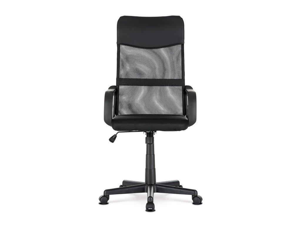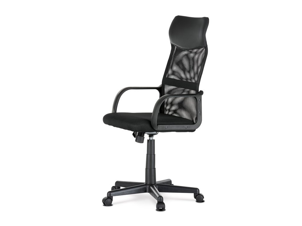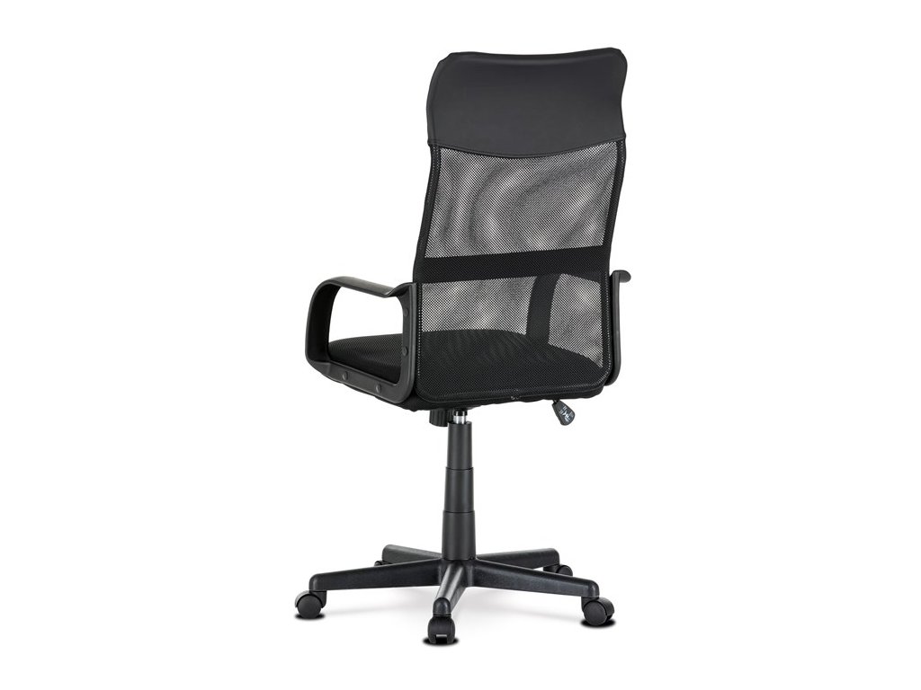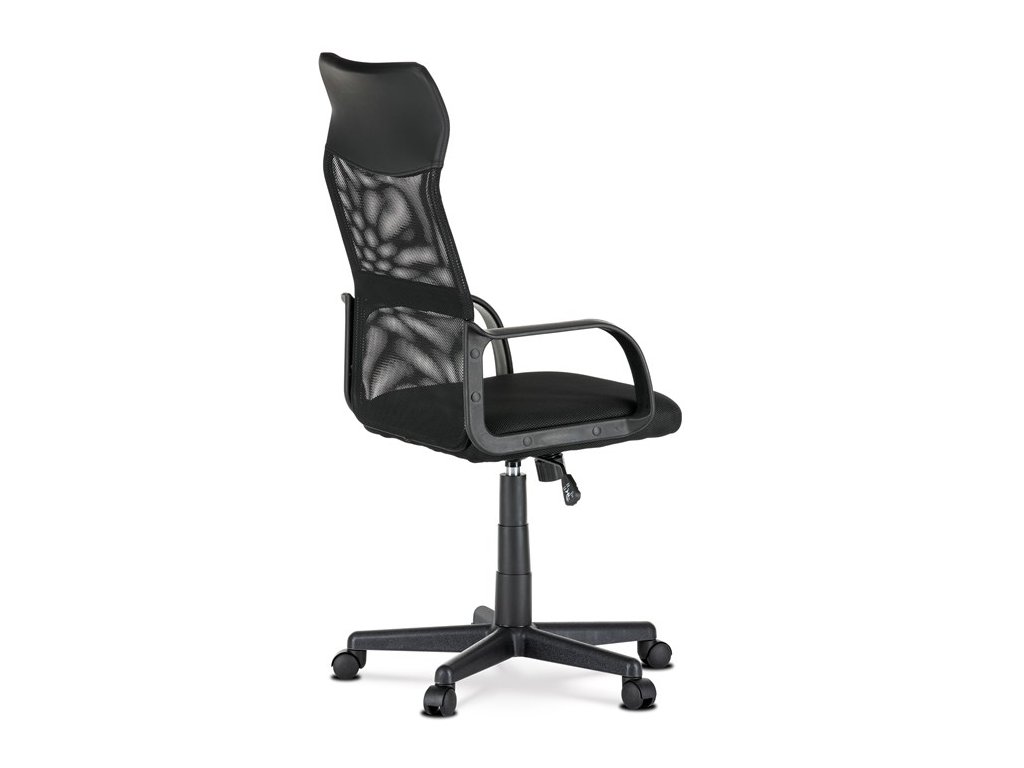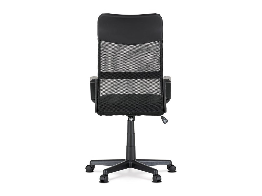 Oblíbená a nadčasová kancelářská židle decentní černé barvy je vhodná nejen do kanceláří, ale například i pro Home office. Vysoký trubkový opěrák s bederní opěrkou je potažen černou síťovinou MESH a v horní části jako podhlavník slouží velmi praktický potah z černé ekokůže. Použité materiály na sedáku i zádové části opěráku zaručují dokonalou prodyšnost. Příjemný polstrovaný sedák je potažený černou látkou MESH. Výplň je v kvalitní PU pěny, která zaručuje příjemné dlouhodobé sezení. Ruce si můžete pohodlně opřít o 6 cm široké černé plastové područky s velkou ložnou plochou 35 cm. Područky zároveň slouží jako velmi pevné spojovací díly sedáku s opěrákem. Díky kvalitnímu plynovému pístu je židle výškově nastavitelná, vybavená houpacím mechanismem a velkým aretačním šroubem na úpravu tuhosti pohupu, který je umístěn pod sedákem. Správnou stabilitu a pevnost zajišťuje pětiramenný černý plastový kříž o pr. 60 cm s plastovými kolečky vhodnými na koberce. Nosnost židle je až 120 kg.