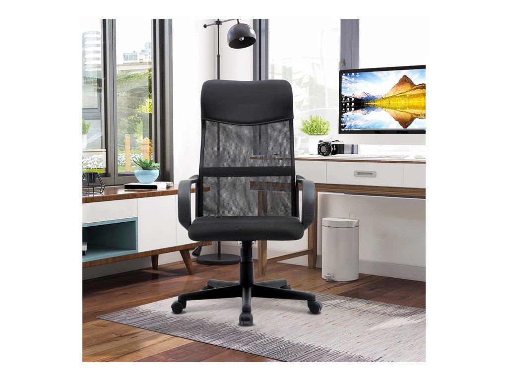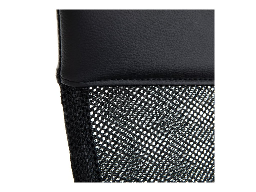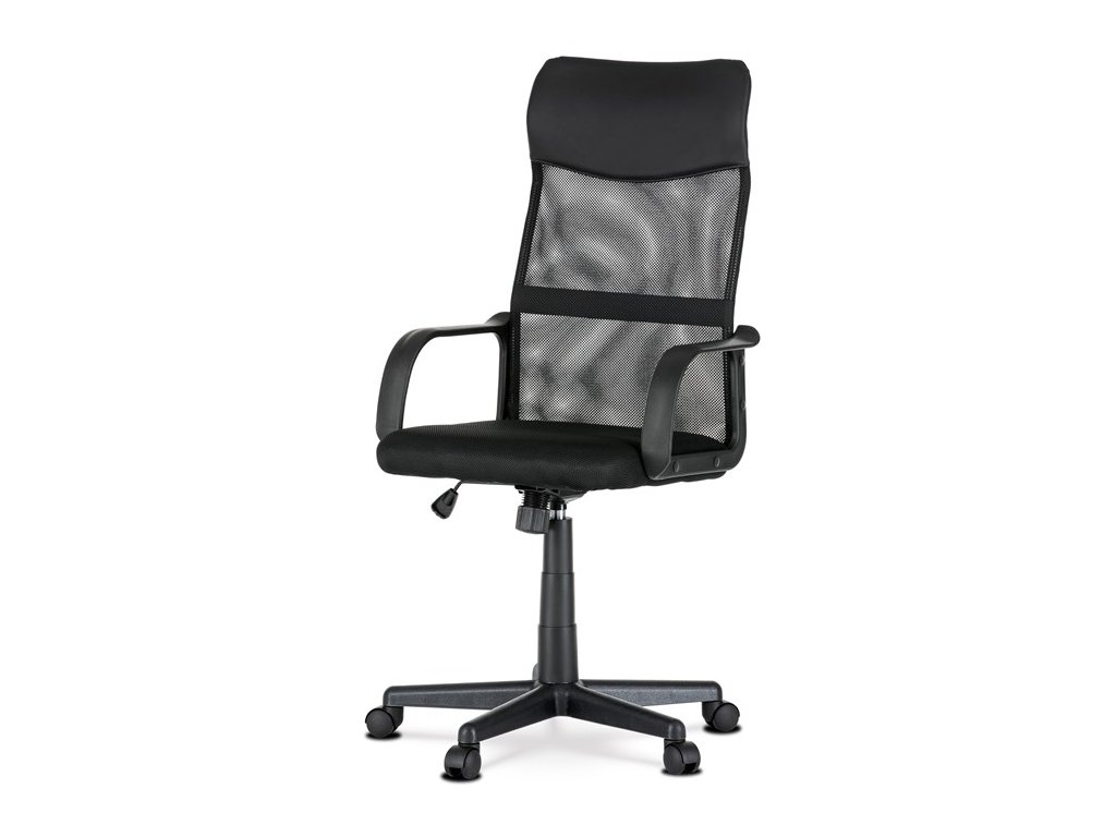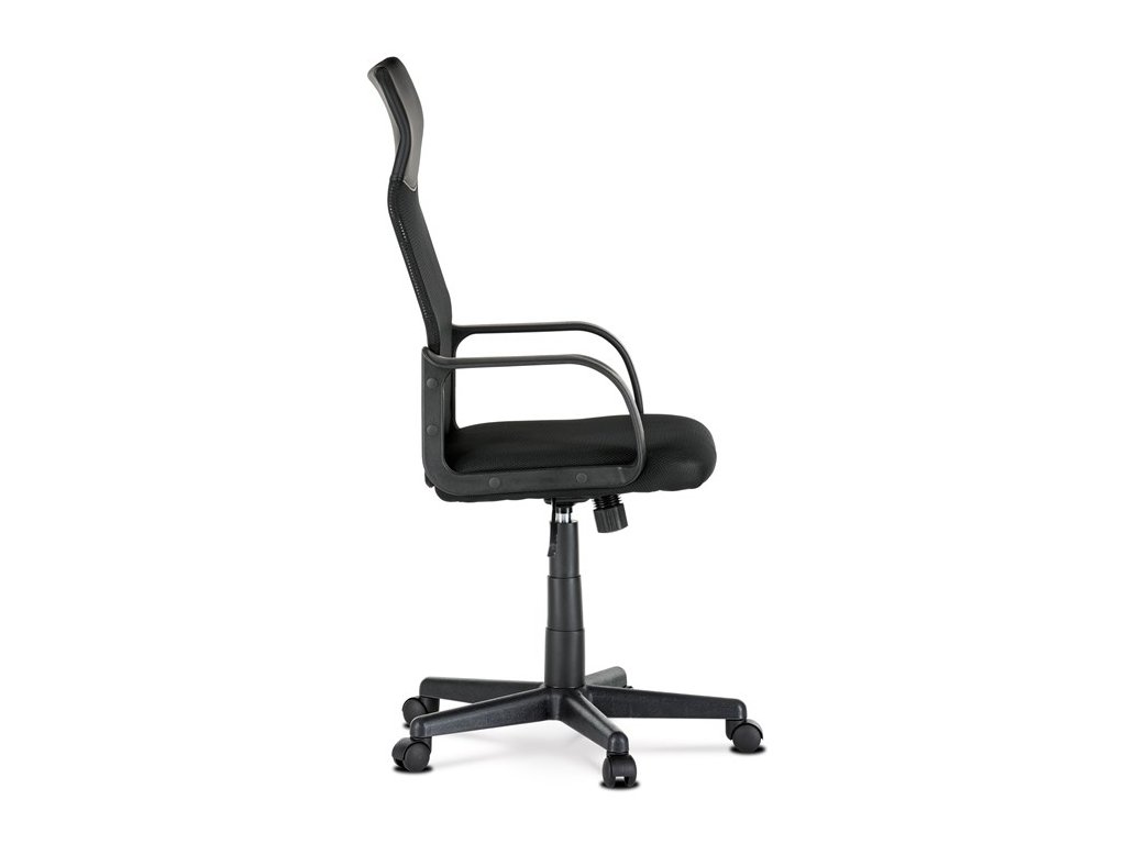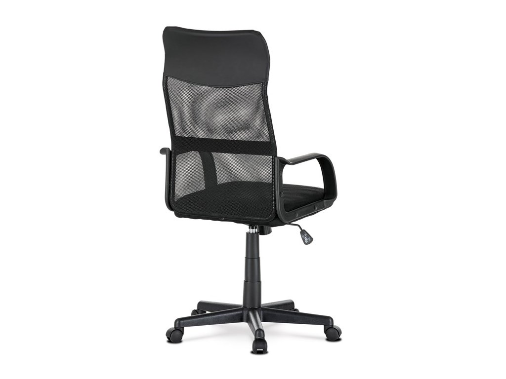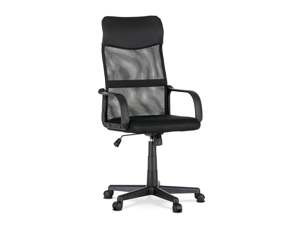 Oblíbená a nadčasová kancelářská židle decentní černé barvy je vhodná nejen do kanceláří, ale například i pro Home office. Vysoký trubkový opěrák s bederní opěrkou je potažen černou síťovinou MESH a v horní části jako podhlavník slouží velmi praktický potah z černé ekokůže. Použité materiály na sedáku i zádové části opěráku zaručují dokonalou prodyšnost. Příjemný polstrovaný sedák je potažený černou látkou MESH. Výplň je v kvalitní PU pěny, která zaručuje příjemné dlouhodobé sezení. Ruce si můžete pohodlně opřít o 6 cm široké černé plastové područky s velkou ložnou plochou 35 cm. Područky zároveň slouží jako velmi pevné spojovací díly sedáku s opěrákem. Díky kvalitnímu plynovému pístu je židle výškově nastavitelná, vybavená houpacím mechanismem a velkým aretačním šroubem na úpravu tuhosti pohupu, který je umístěn pod sedákem. Správnou stabilitu a pevnost zajišťuje pětiramenný černý plastový kříž o pr. 60 cm s plastovými kolečky vhodnými na koberce. Nosnost židle je až 120 kg.