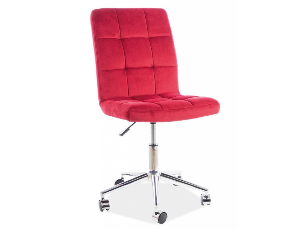 Otáčecí kancelářská židle - křeslo v moderním designu. Křeslo je vhodné do kanceláře, domácí pracovny či studentského pokoje. Konstrukce křesla je z pochromovaného kovu, čalounění je z látky aksamit v červené bordó barvě. Nastavitelná výška sedadla 45-55 cm, celková výška židle je 87-97 cm. Dodáváme v demontovaném stavu.Doplňkové parametry