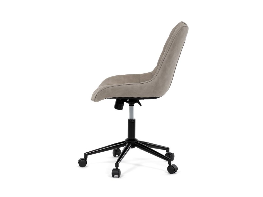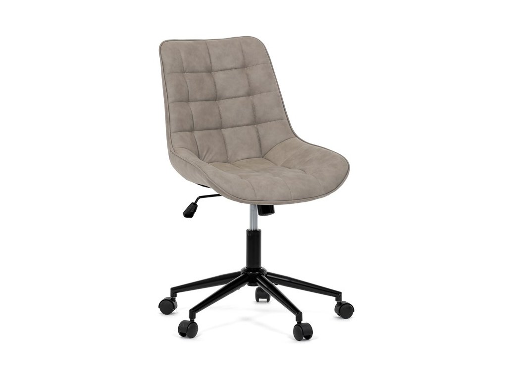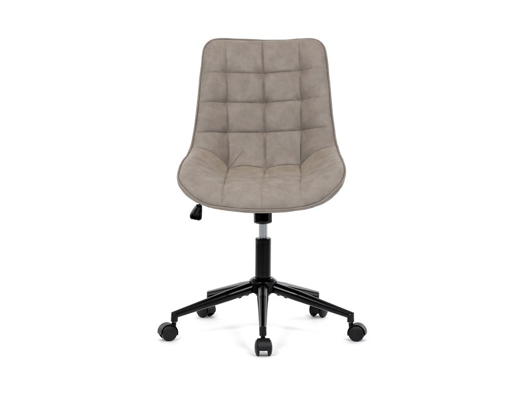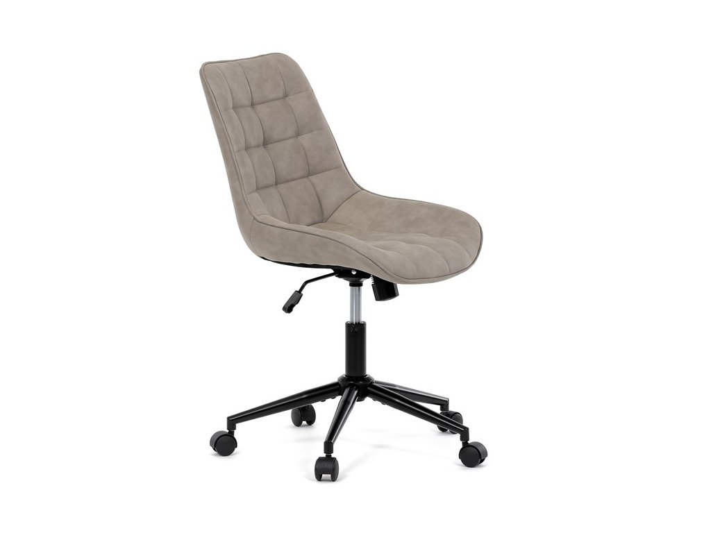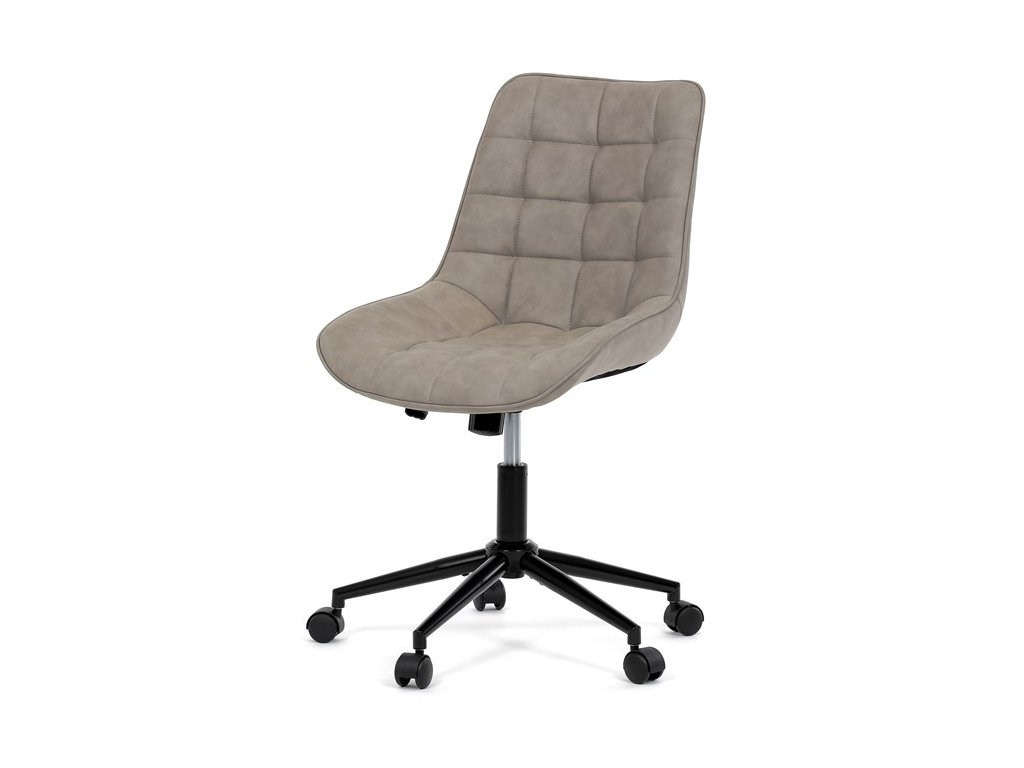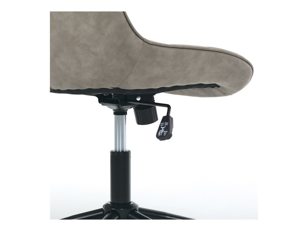 Kancelářská židle s béžovým čalouněním v dekoru broušené kůže nabízí kombinaci moderního vzhledu a komfortního sezení. Sedák i opěradlo jsou potažené prémiovou látkou, která je příjemná na dotek a snadno se udržuje. Černý kovový kříž zajišťuje stabilitu a pevnost celé židle, zatímco houpací mechanika umožňuje plynulé pohupování pro uvolnění během práce. Výškově nastavitelná sedací plocha umožňuje individuální přizpůsobení výšky sezení podle potřeby uživatele. Absence područek a opěrky hlavy dává židli minimalistický a vzdušný design vhodný do moderních pracovních prostor.