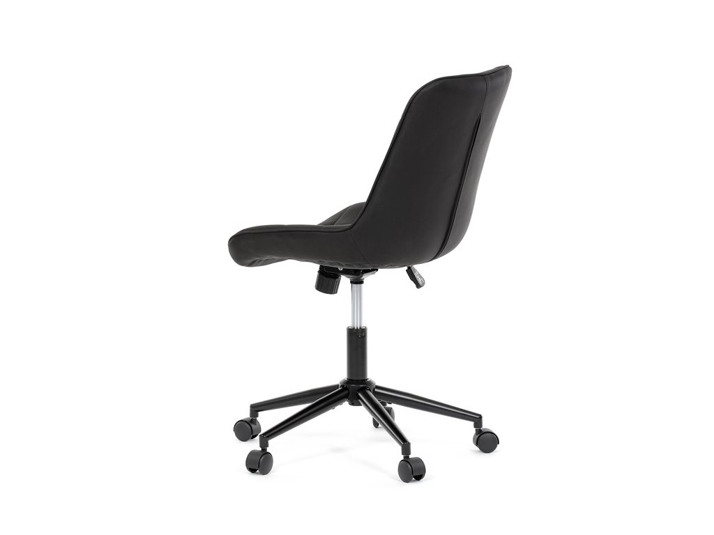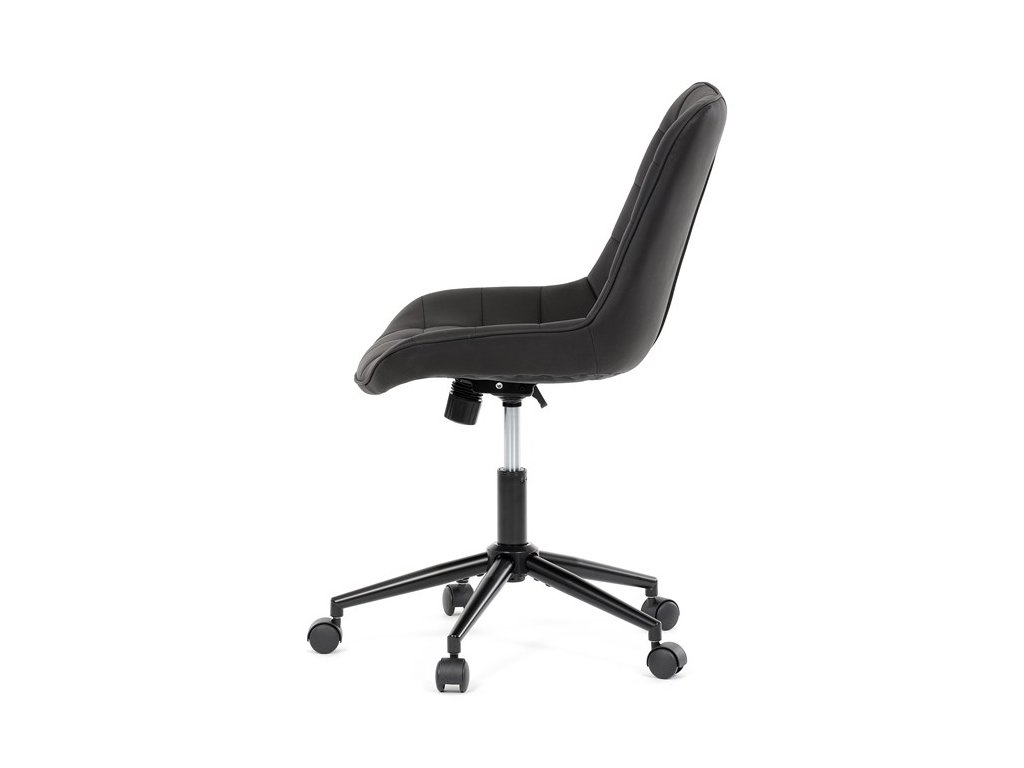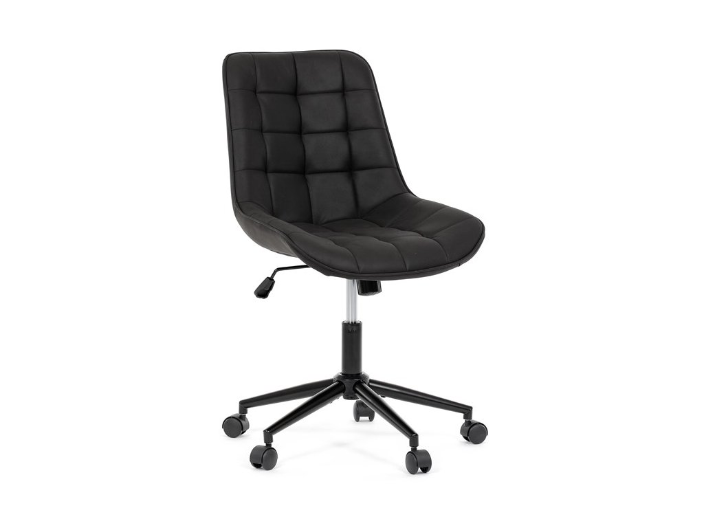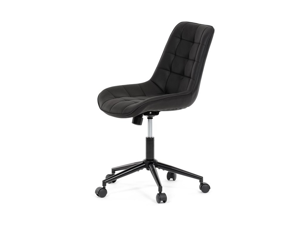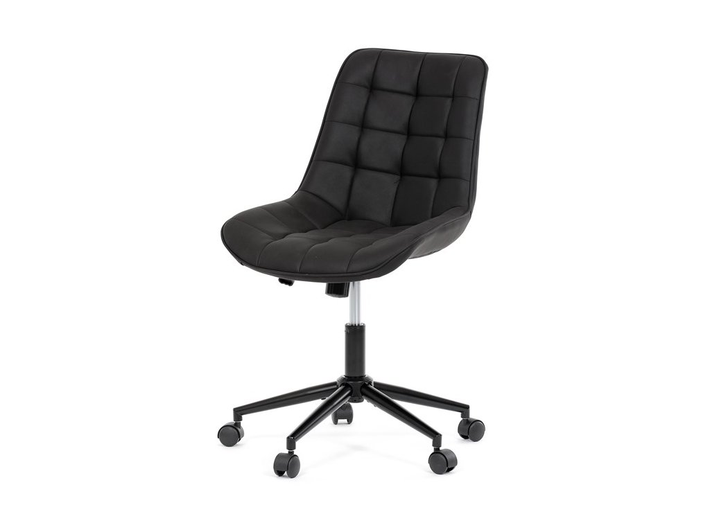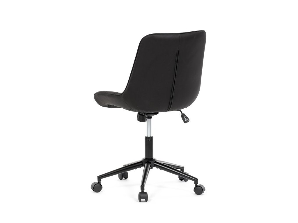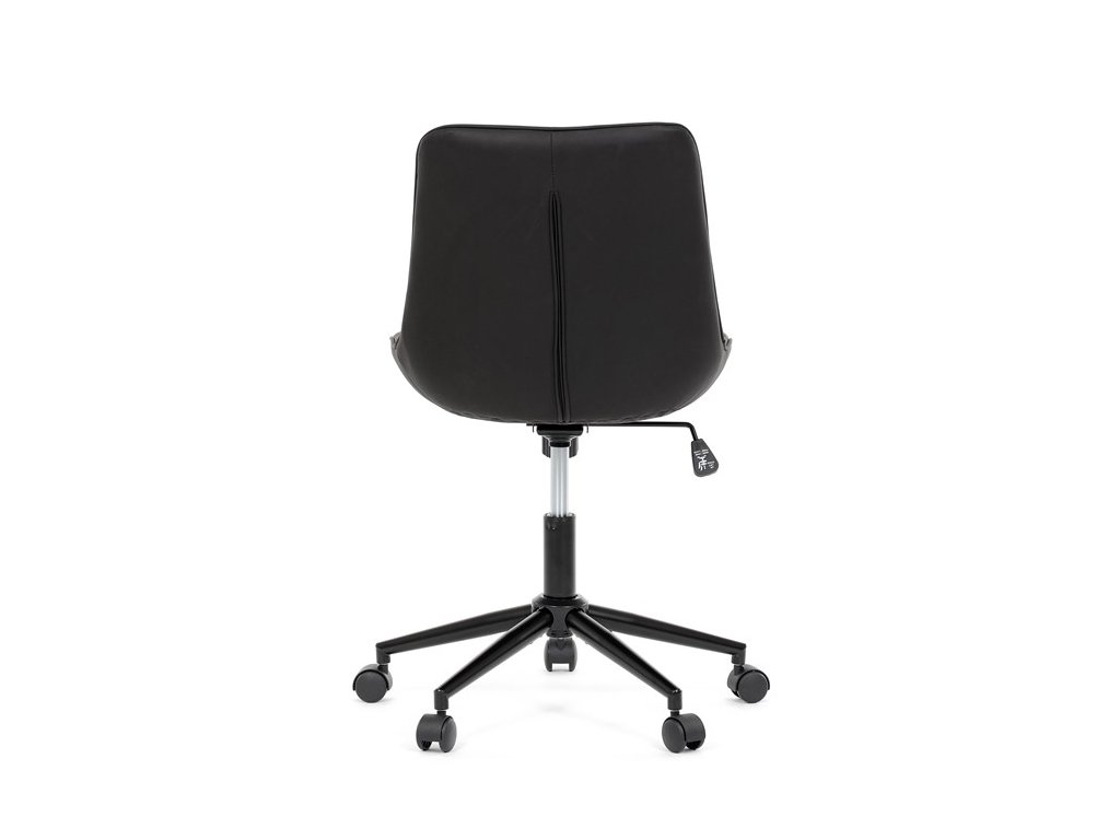 Kancelářská židle s černým potahem v dekoru broušené kůže nabízí moderní vzhled a komfortní sezení. Sedák i opěradlo jsou čalouněné kvalitní látkou, která je příjemná na dotek a snadno se udržuje. Pevný kovový kříž zajišťuje stabilitu a odolnost, zatímco houpací mechanika umožňuje plynulé naklápění pro uvolnění během práce. Výškově nastavitelná sedací plocha umožňuje přizpůsobení výšky podle individuálních potřeb uživatele. Absence područek a bederní opěrky podtrhuje minimalistický design vhodný do různých pracovních prostor.