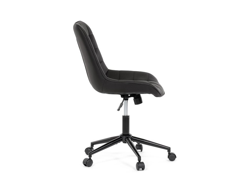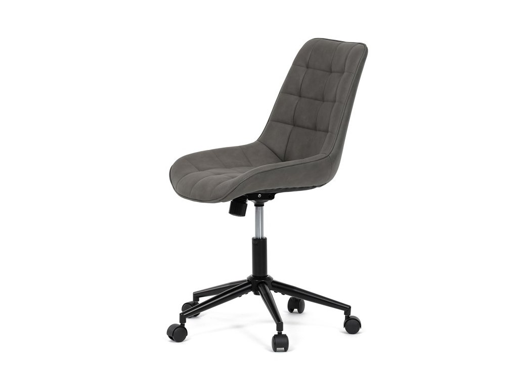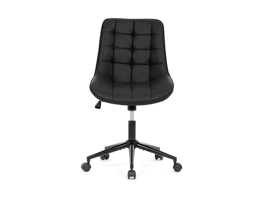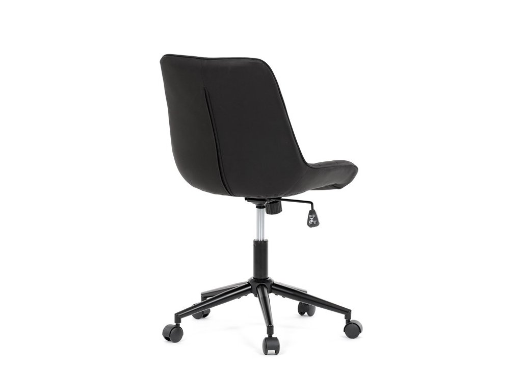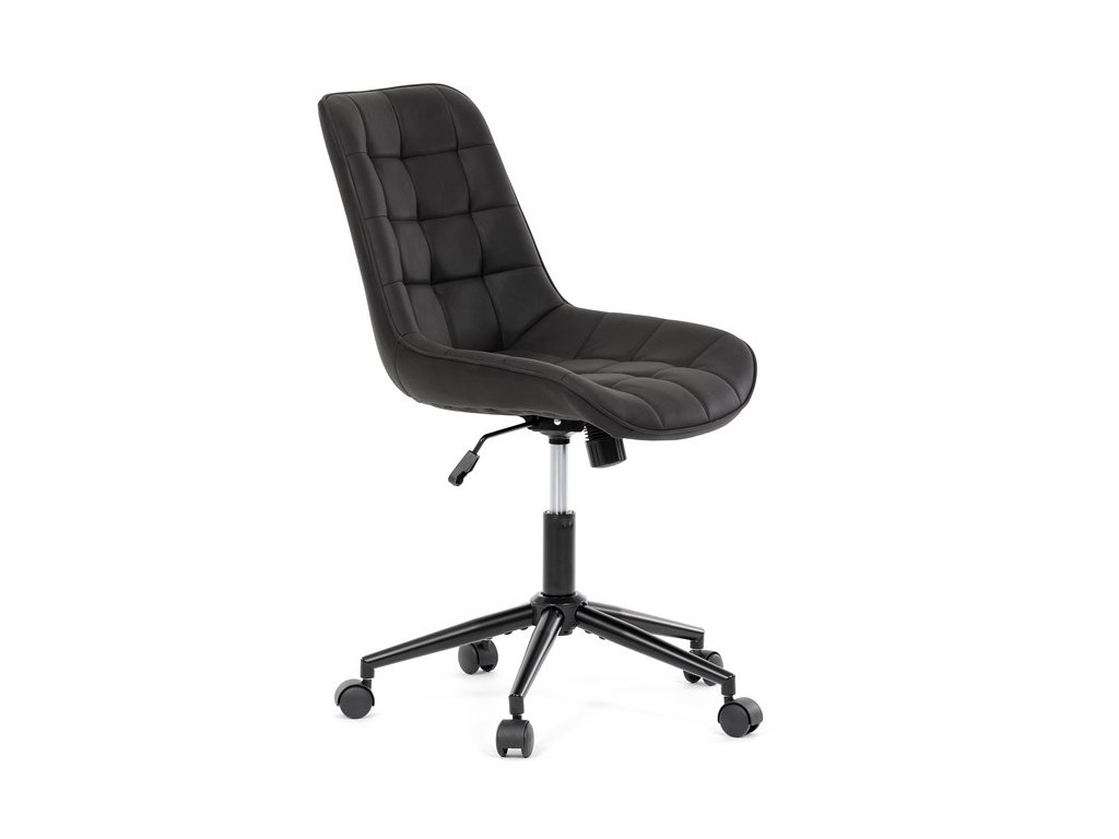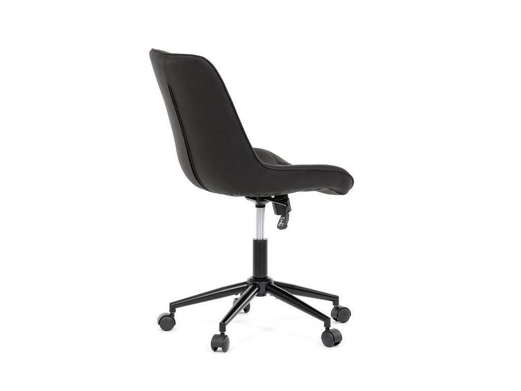 Kancelářská židle s černým potahem v dekoru broušené kůže nabízí moderní vzhled a komfortní sezení. Sedák i opěradlo jsou čalouněné kvalitní látkou, která je příjemná na dotek a snadno se udržuje. Pevný kovový kříž zajišťuje stabilitu a odolnost, zatímco houpací mechanika umožňuje plynulé naklápění pro uvolnění během práce. Výškově nastavitelná sedací plocha umožňuje přizpůsobení výšky podle individuálních potřeb uživatele. Absence područek a bederní opěrky podtrhuje minimalistický design vhodný do různých pracovních prostor.