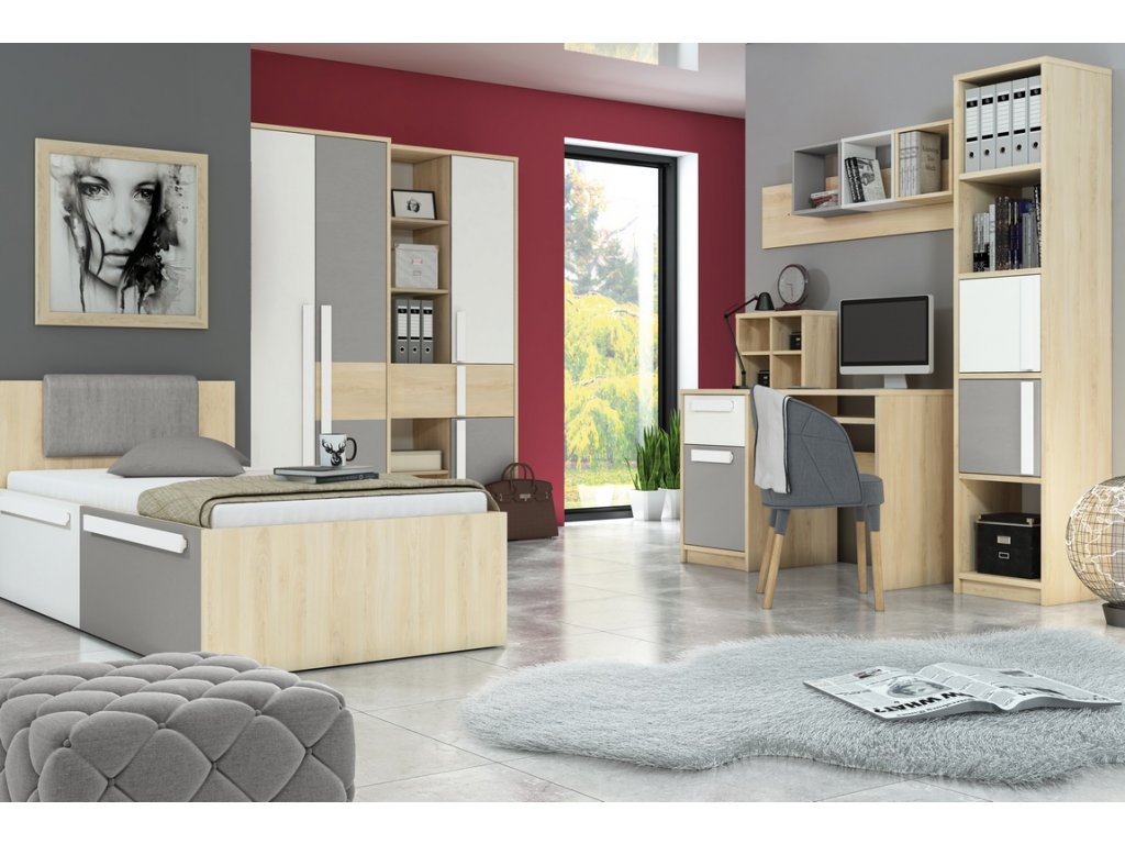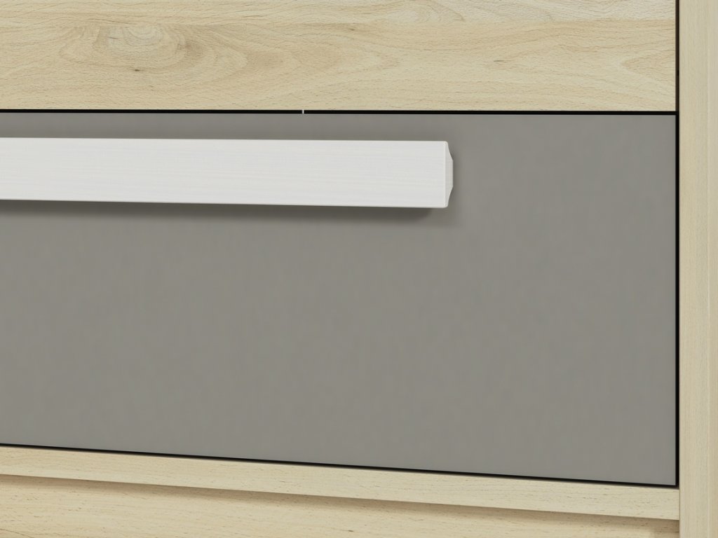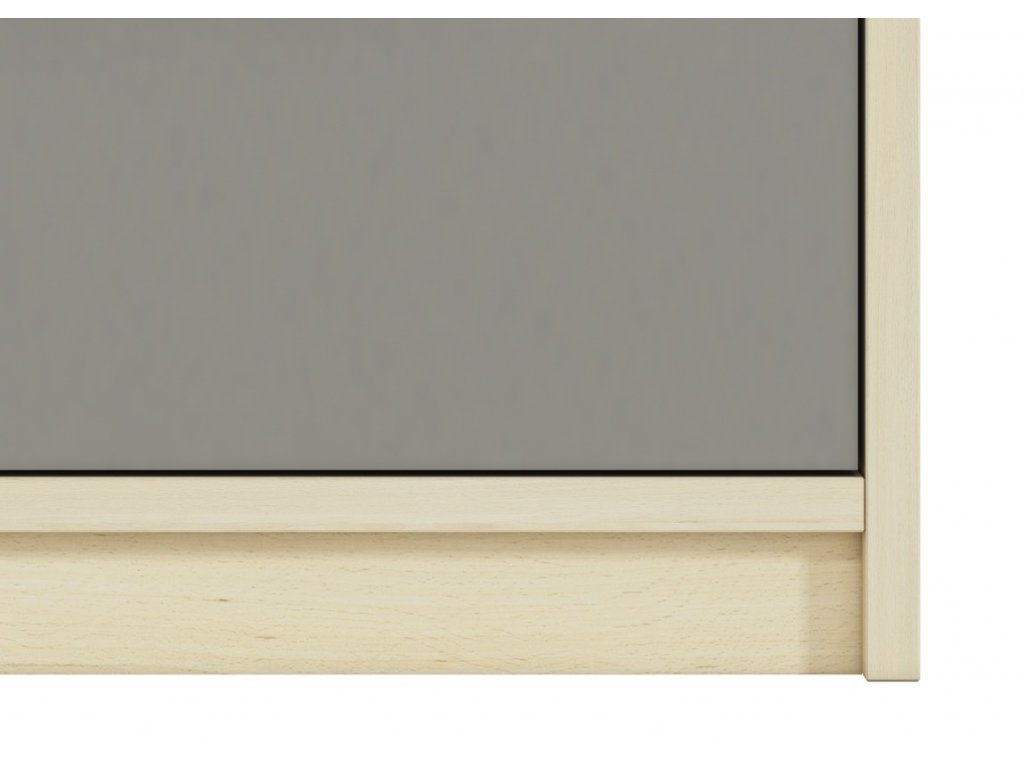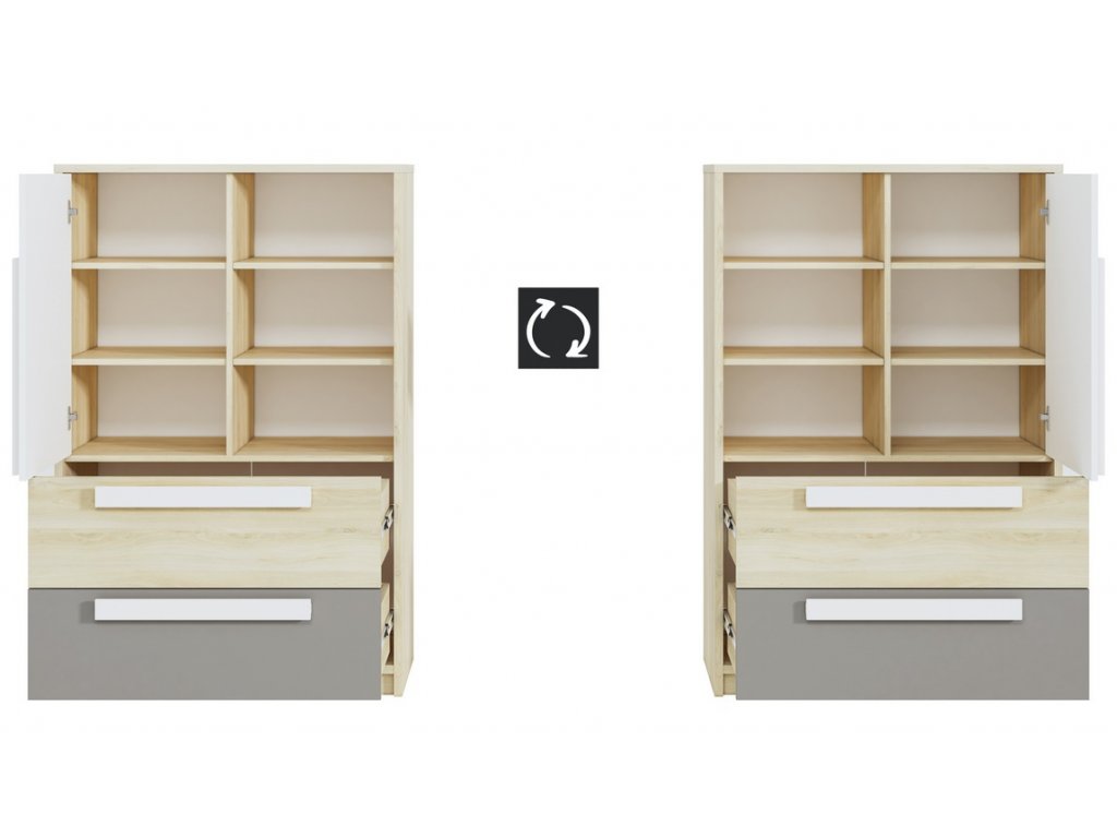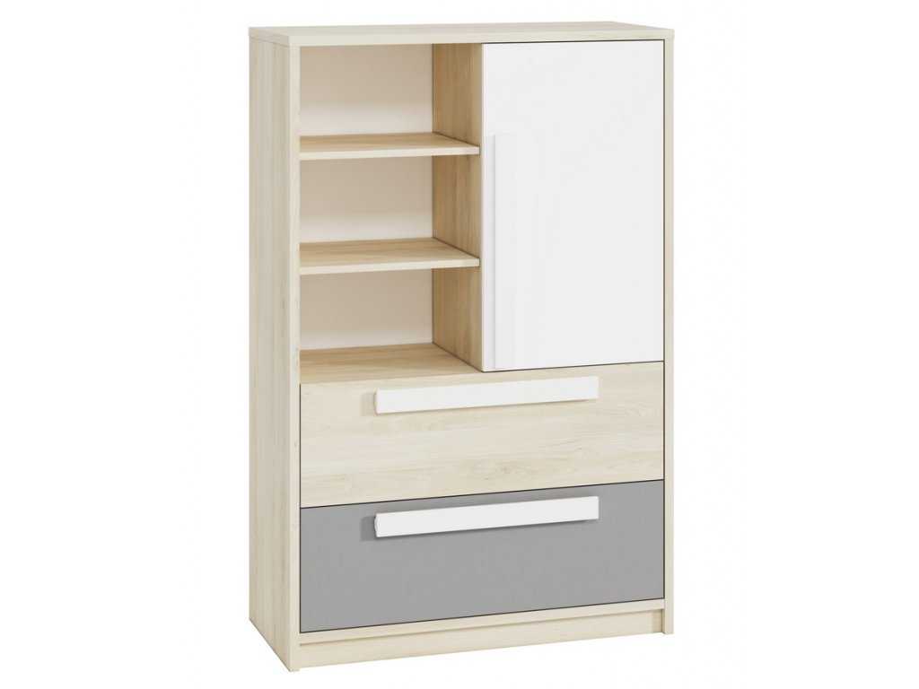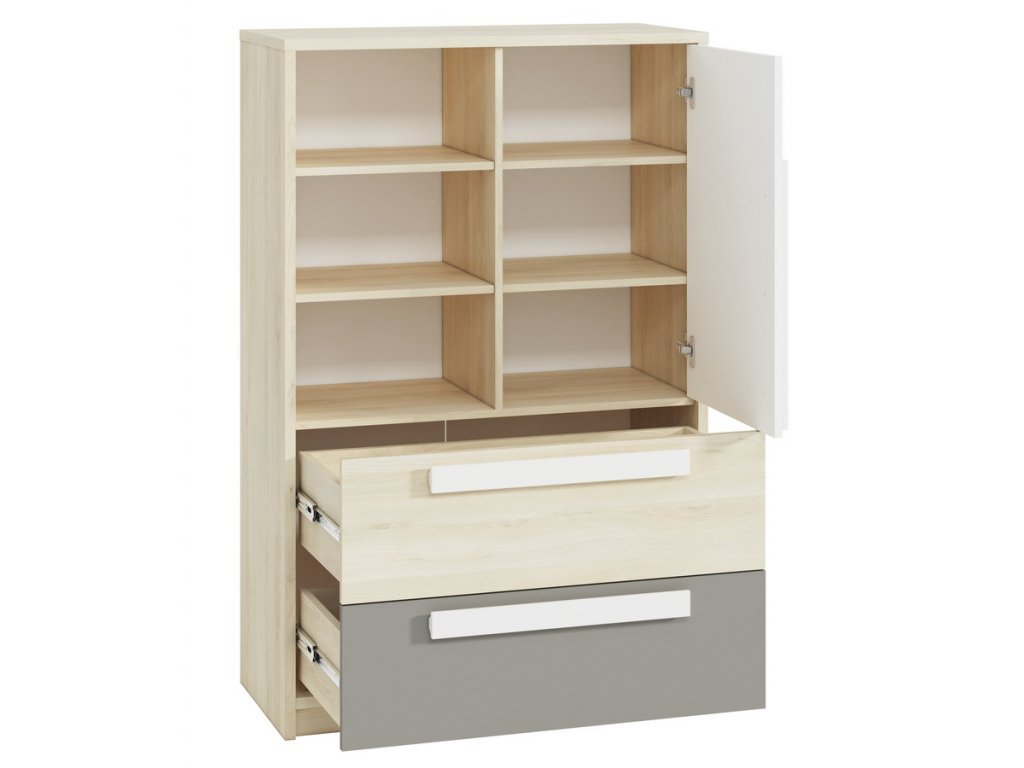 Komoda jednodveřová se dvěma zásuvkami v moderním provedení. Korpus je vyroben z kvalitní desky LTD hraněné ABS páskou v barvě buk fjord, dvířka a zásuvky jsou vyrobeny z desky LTD v kombinaci barev buk fjord/bílá/šedá. Dvířka je možné namontovat na pravou nebo levou stranu. Úchyty jsou dřevěné bílé. Dodáváme v demontovaném stavu.Doplňkové parametry