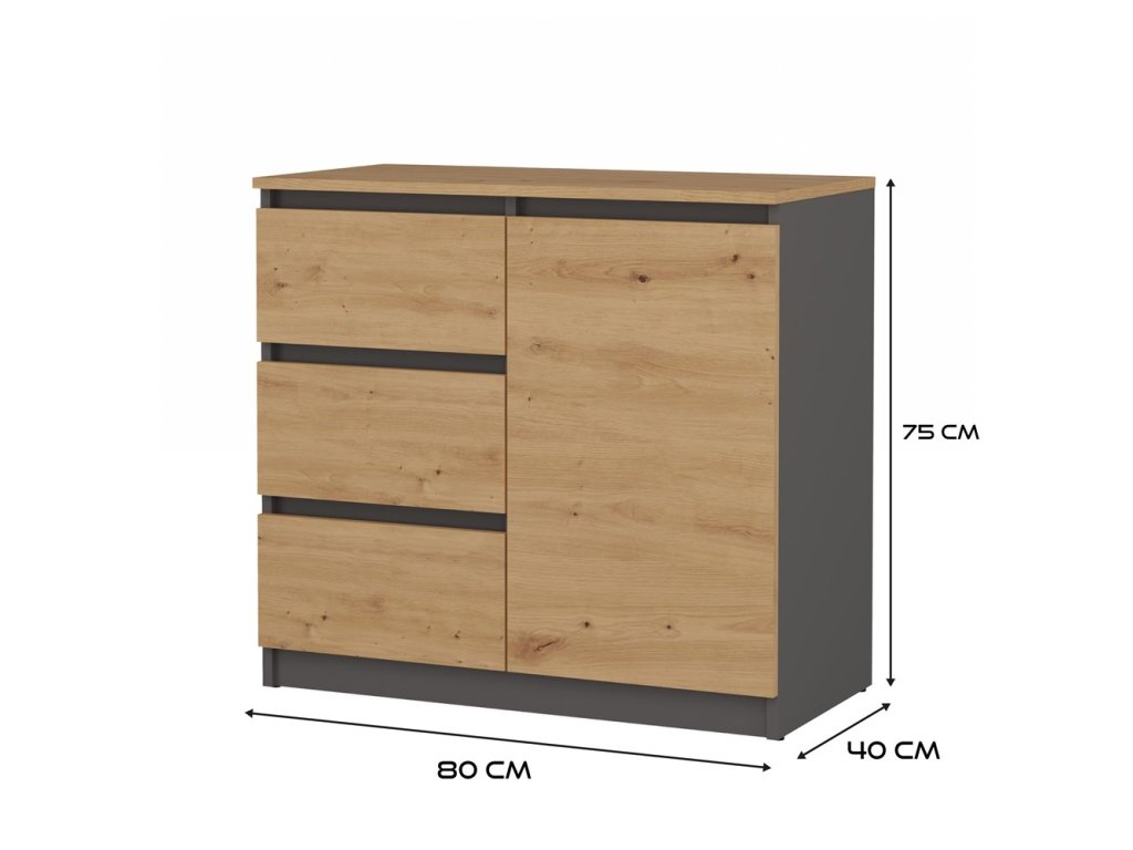 Moderní komoda, která se skvěle hodí do ložnice, obývacího nebo dětského pokoje. Její univerzální vzhled splňuje očekávání těch, kteří ocení spojení jednoduchosti a elegance. Vnitřek komody se skládá z police a tří šuplíků, které vám pomohou s uspořádáním vašich věcí. Minimalistická konstrukce a šuplíky bez madel dodávají komodě moderní vzhled. Vyrobeno z kvalitní LTD desky, která má tloušťku 16 mm a je nenáročná na údržbu. Dodáváme v demontu.